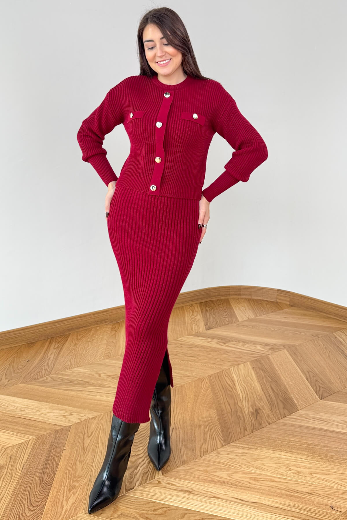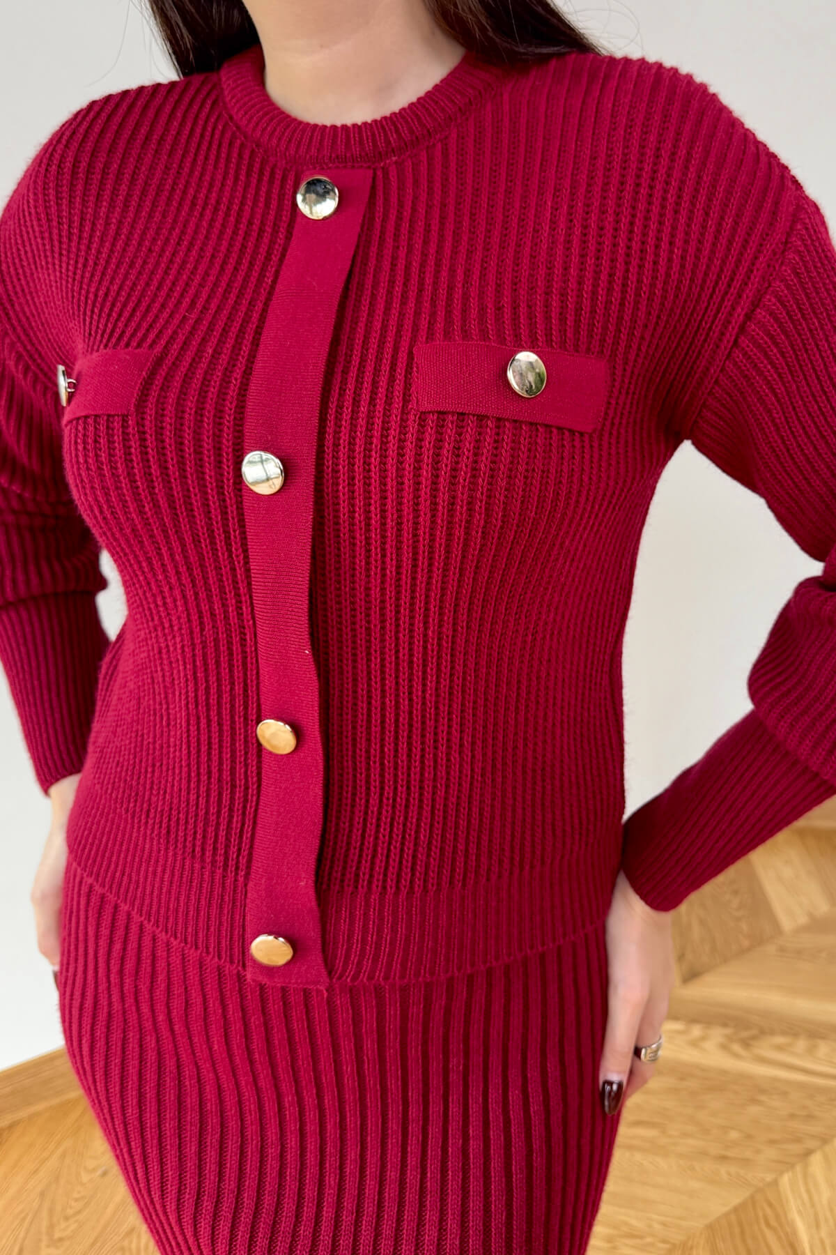 Düğme detaylı triko bluz, zarif ve zamansız bir görünüm sunar.