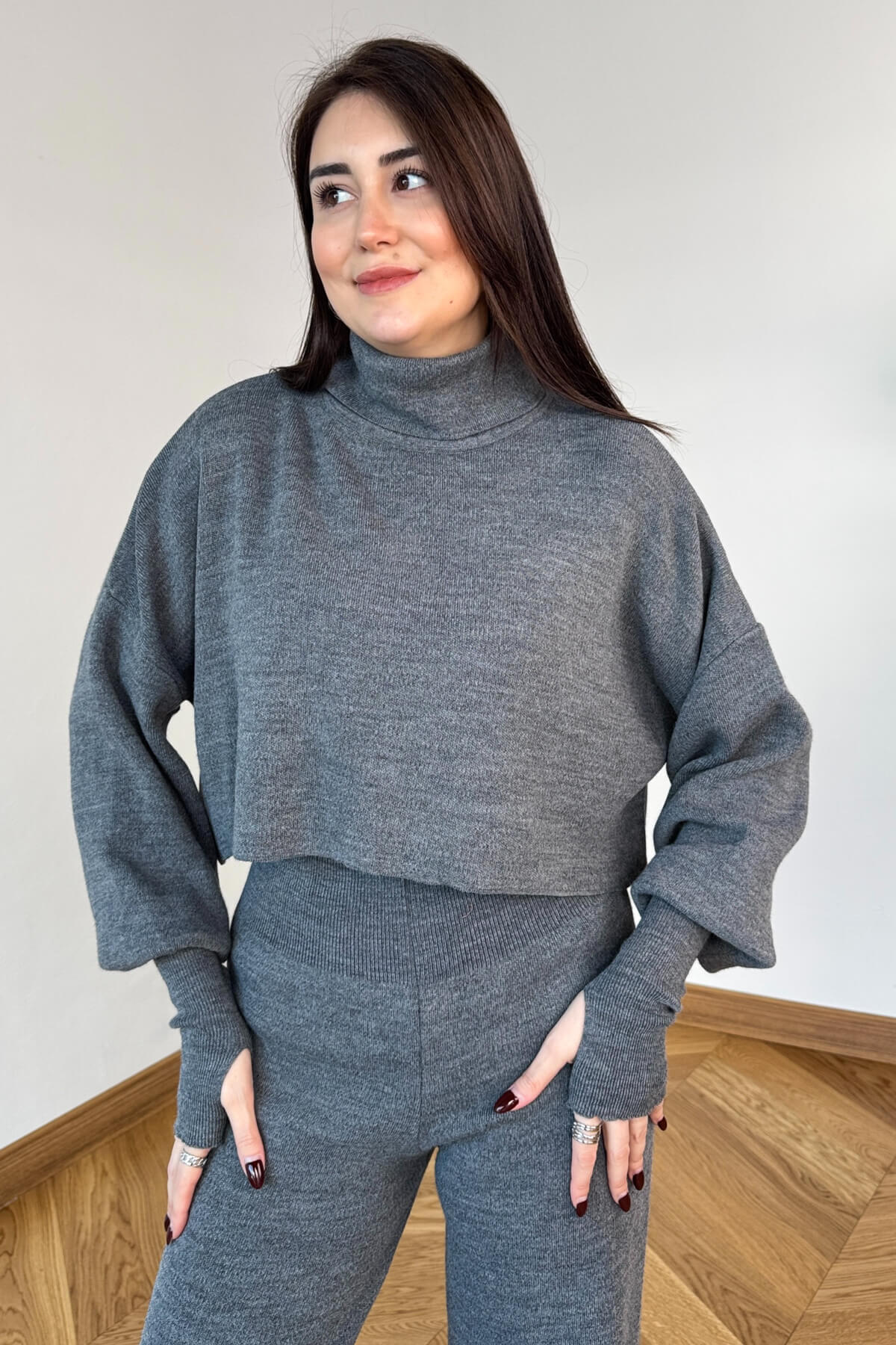 Parmak geçirmeli yarasa kol modern ve sportif bir duruş sunar