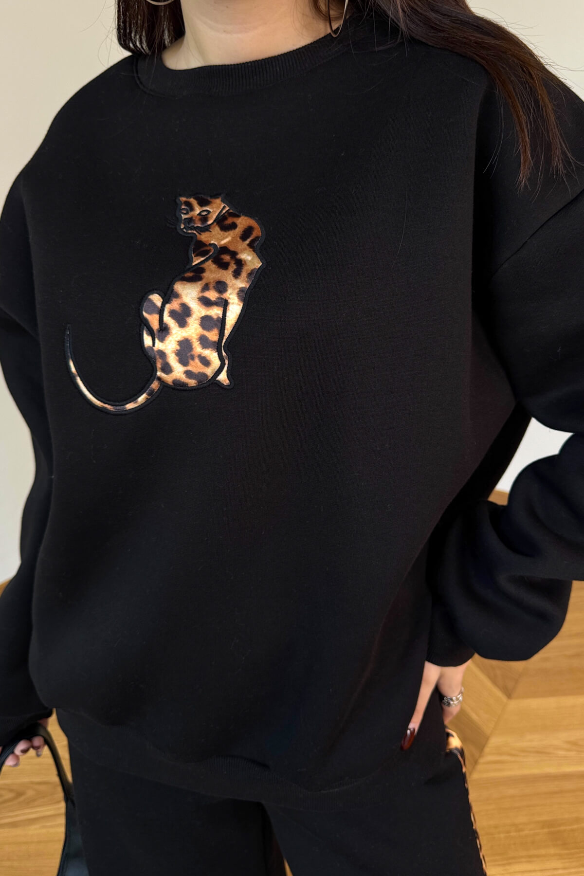 • Sweatshirt’te özel leopar nakış detayı