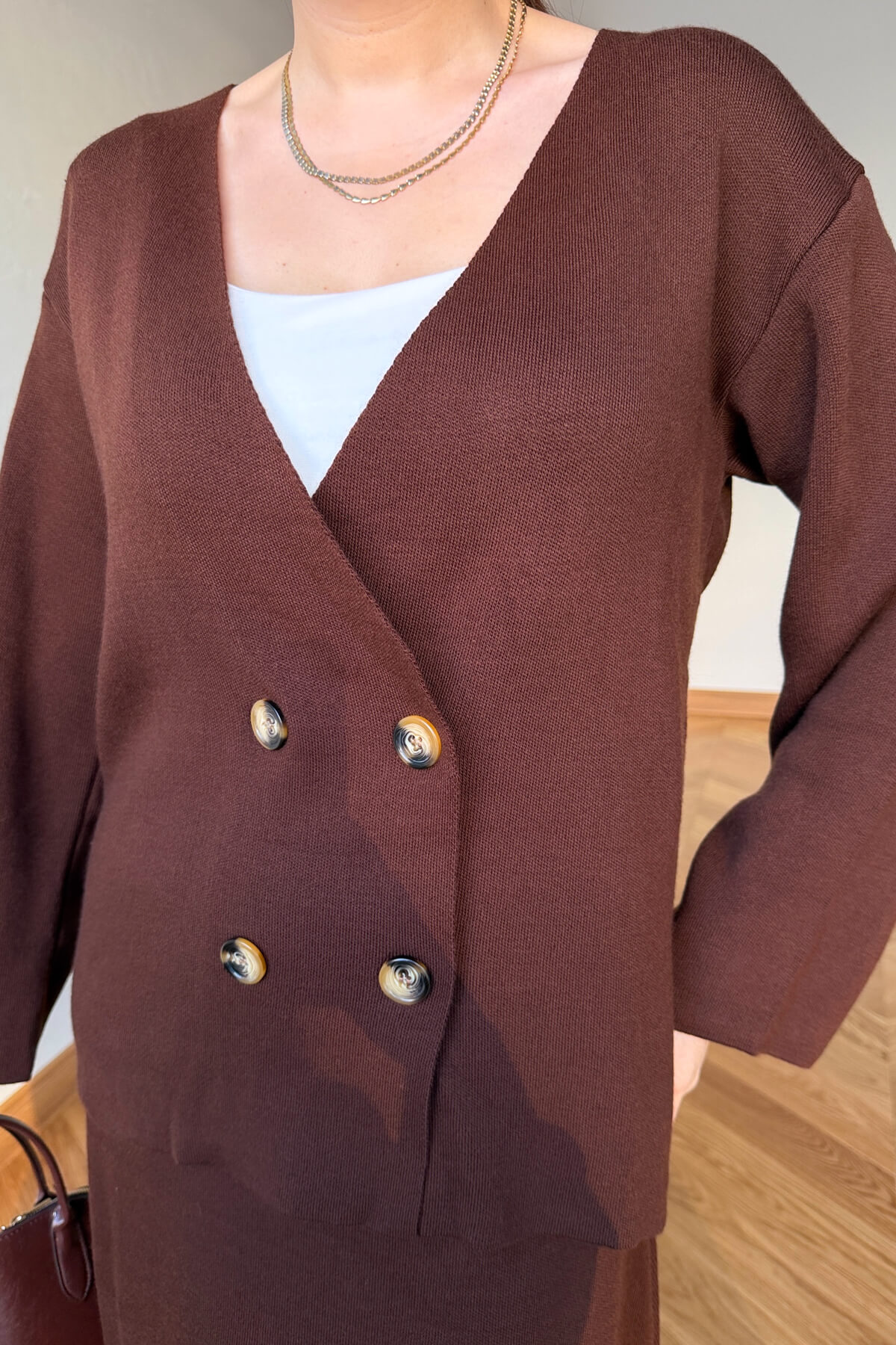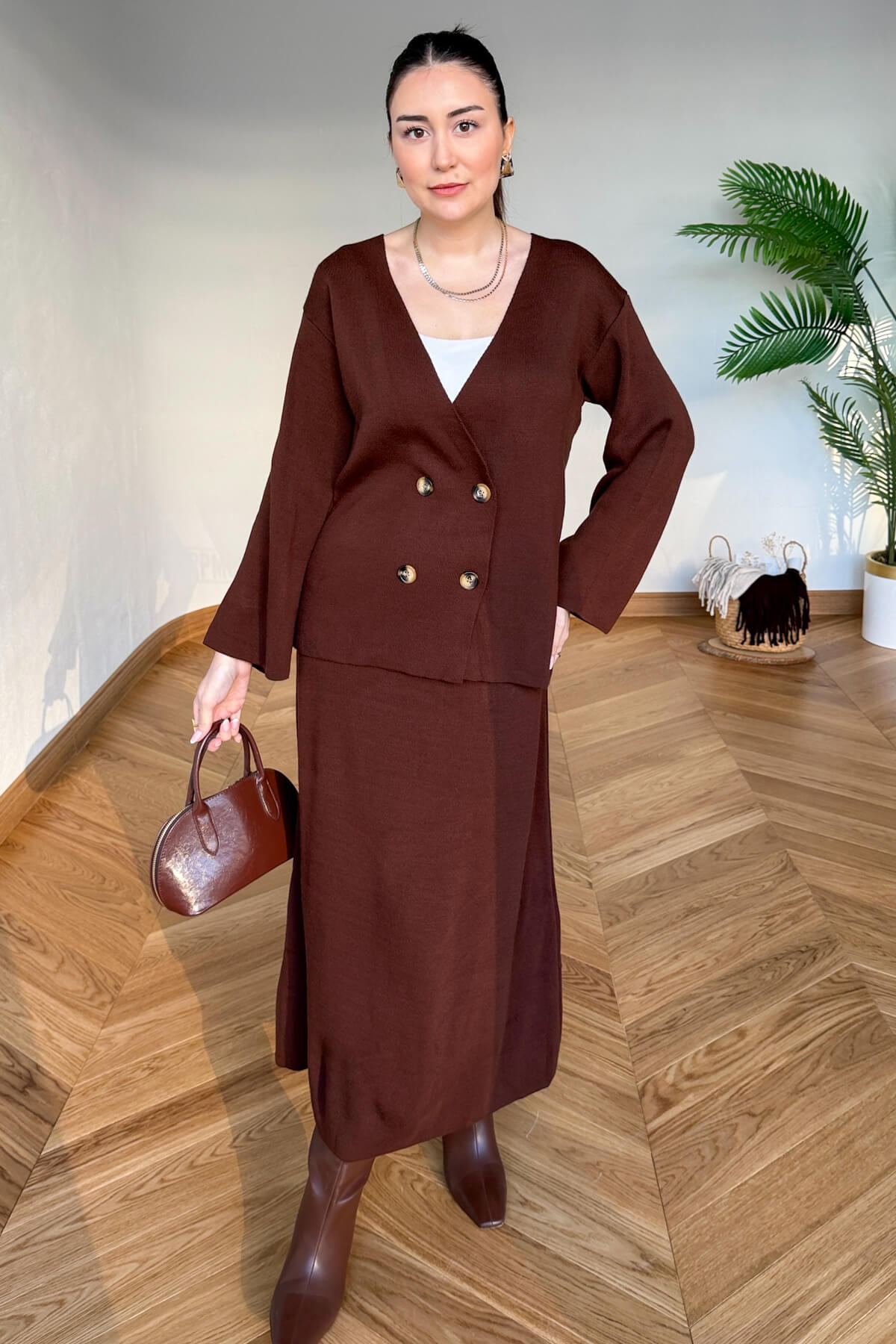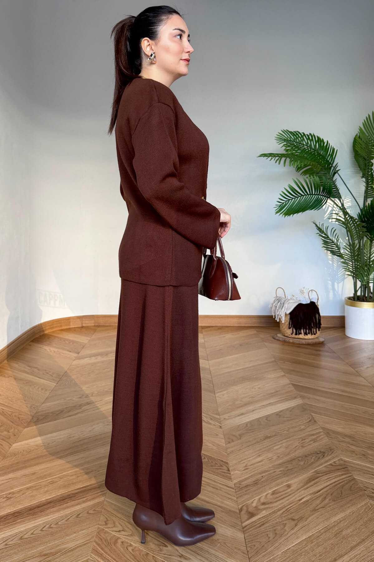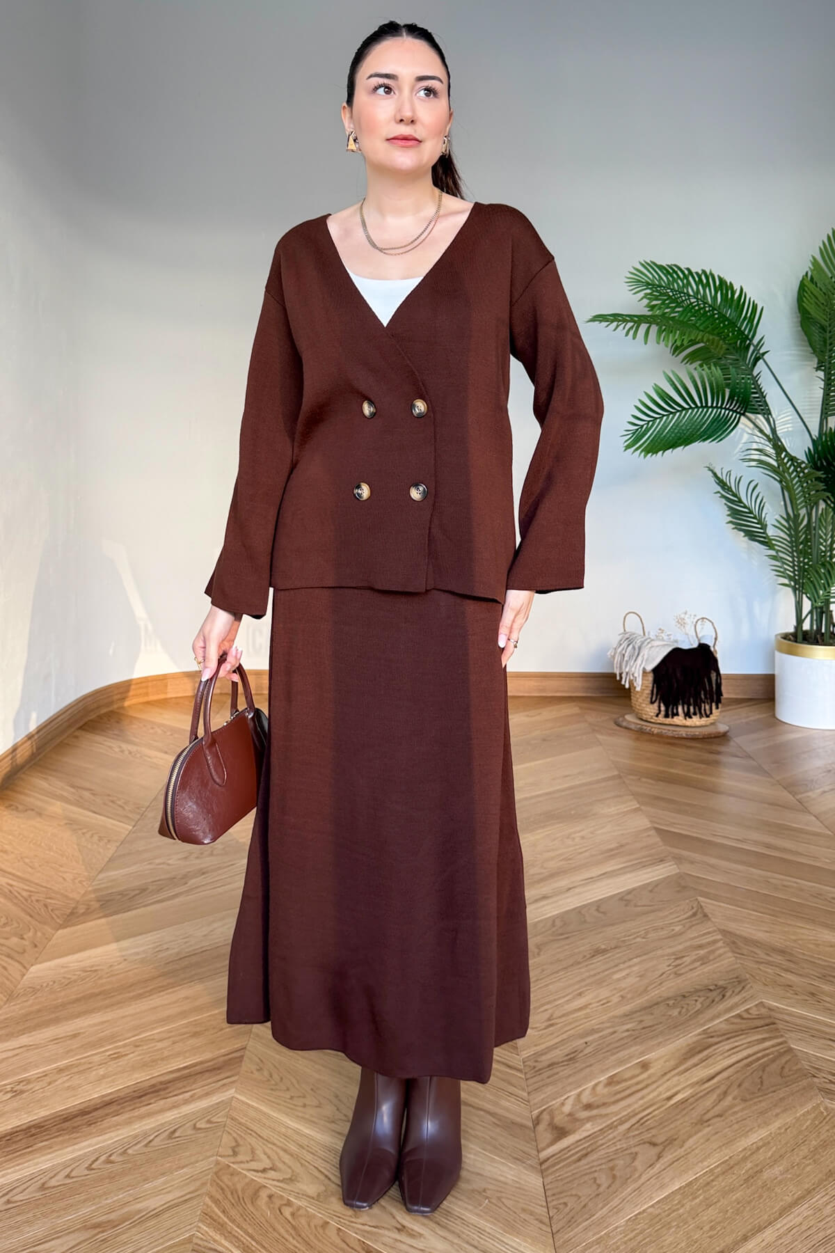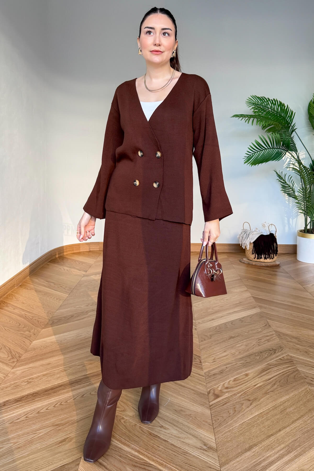 TKM-13364 Kahverengi Çelik Örme Etek-Hırka İkili Triko Takım