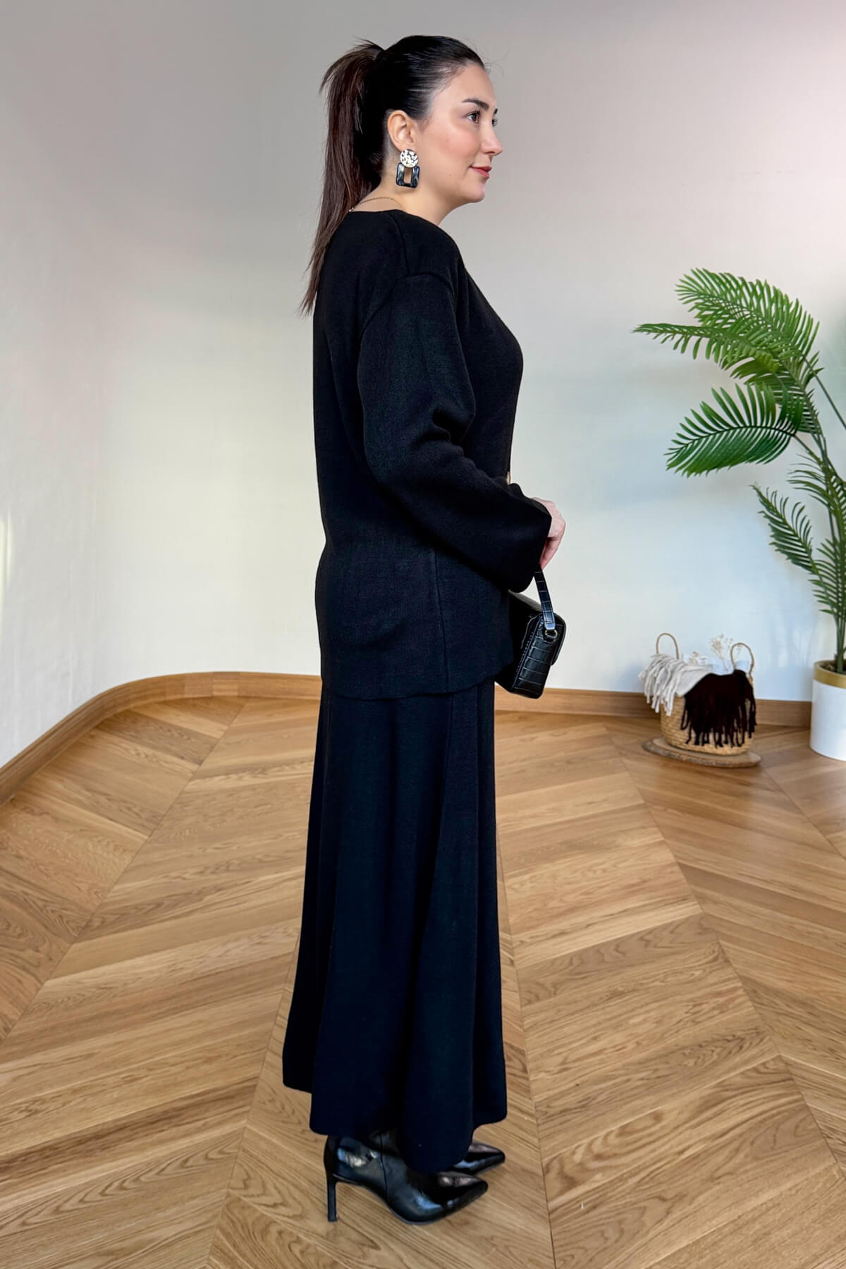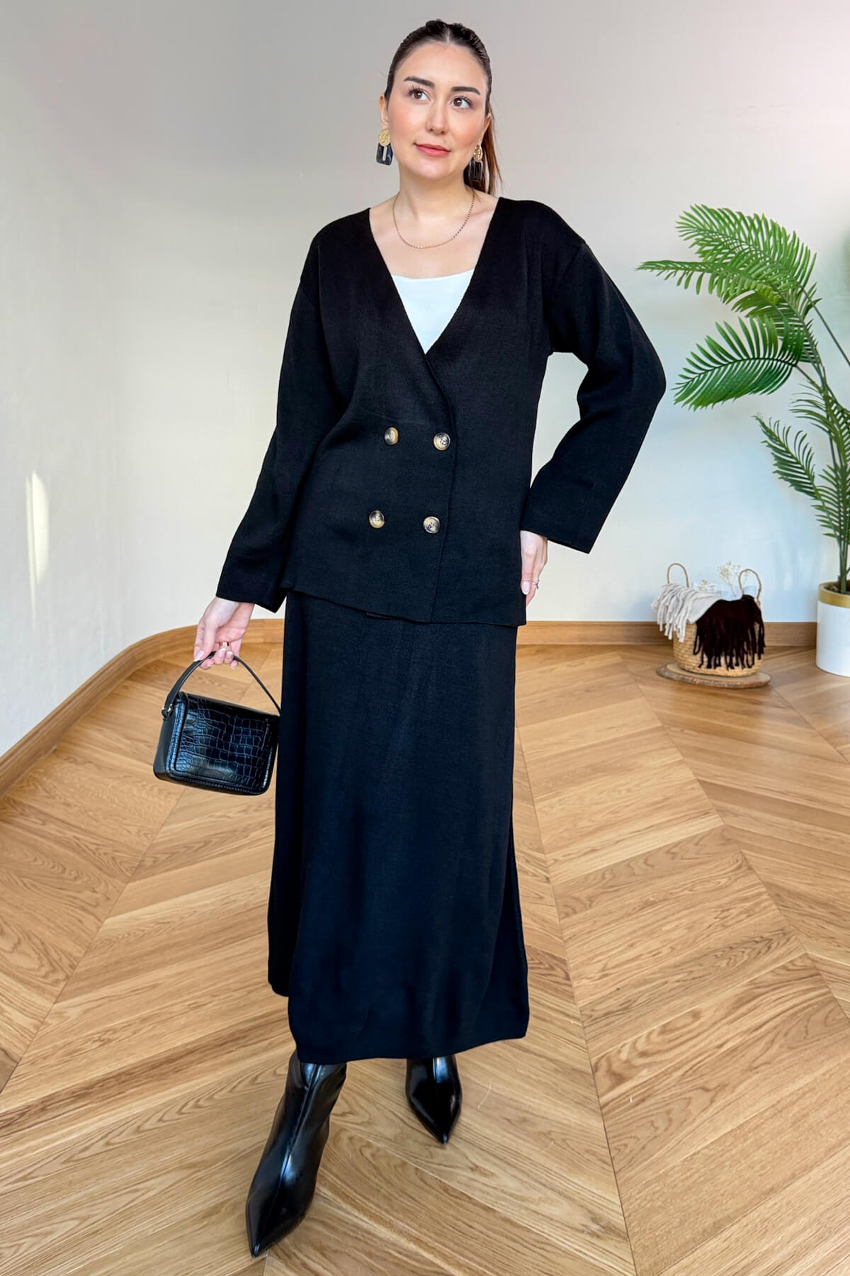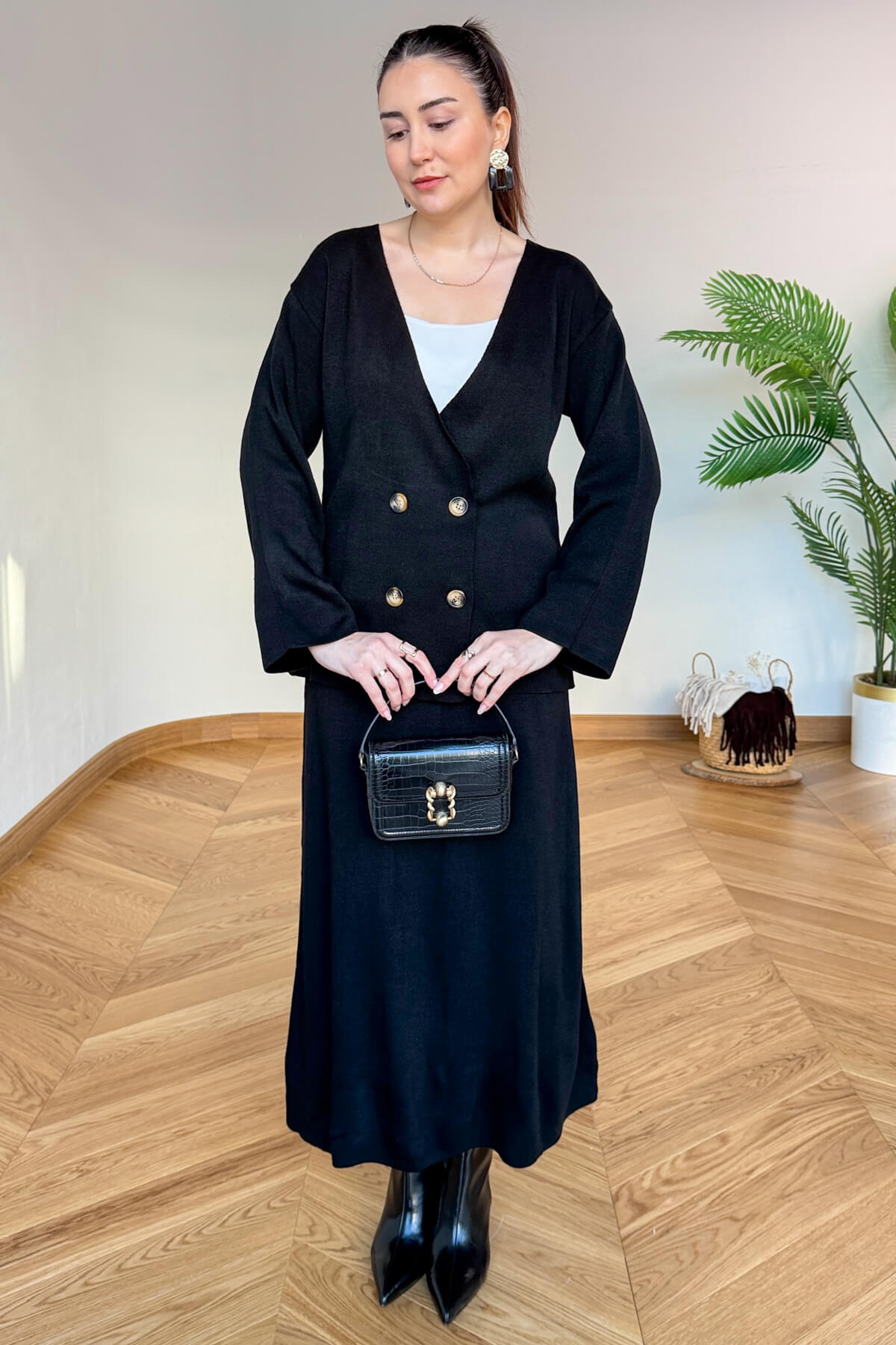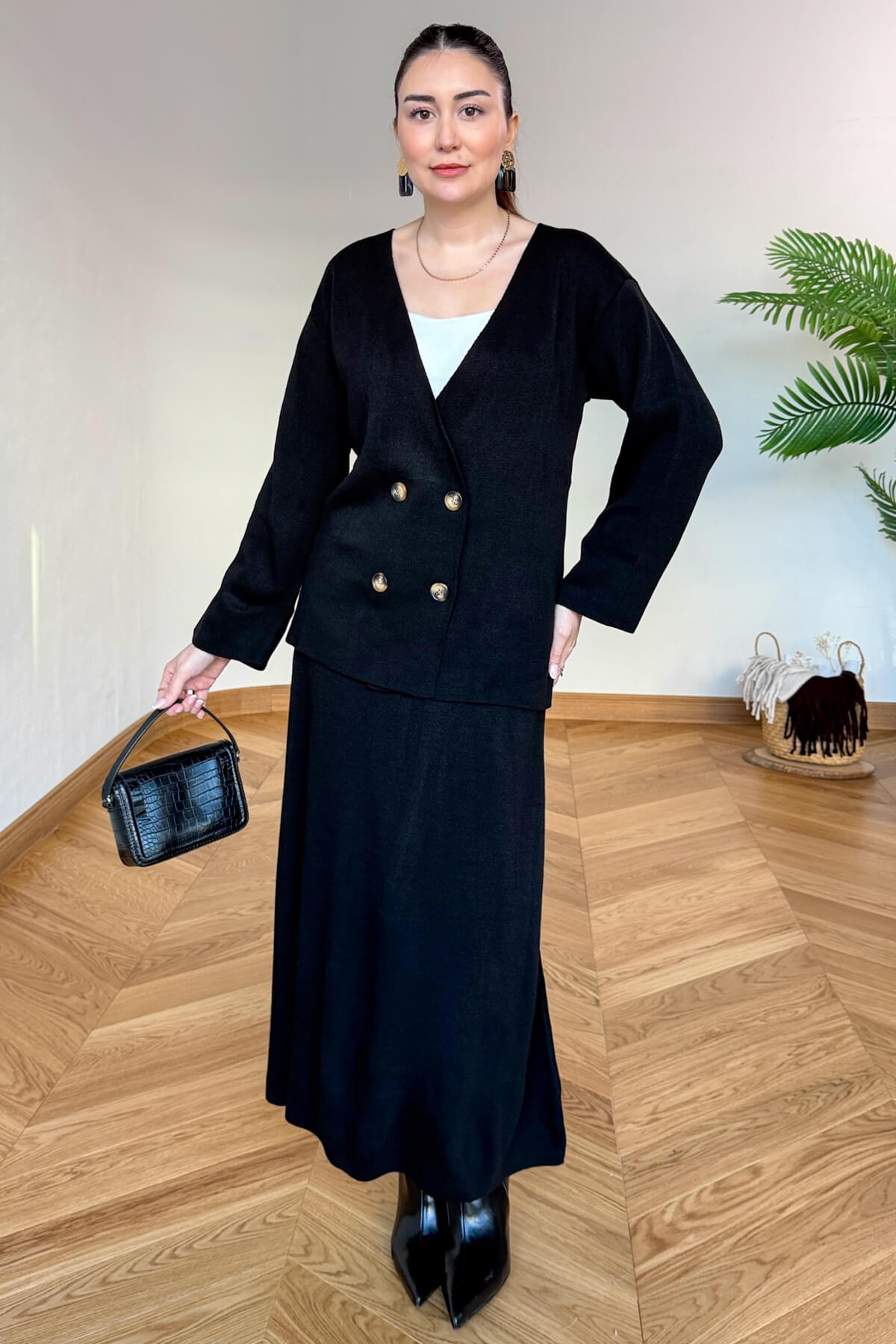 TKM-13364 Siyah Çelik Örme Etek-Hırka İkili Triko Takım