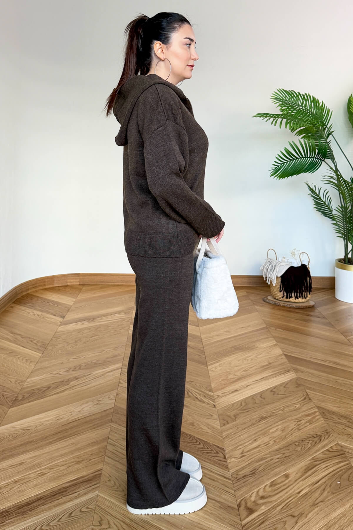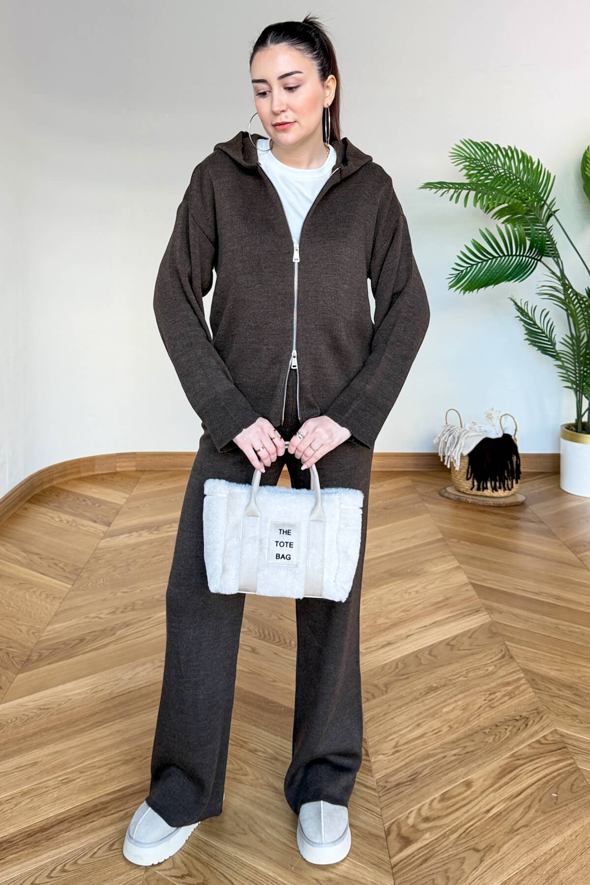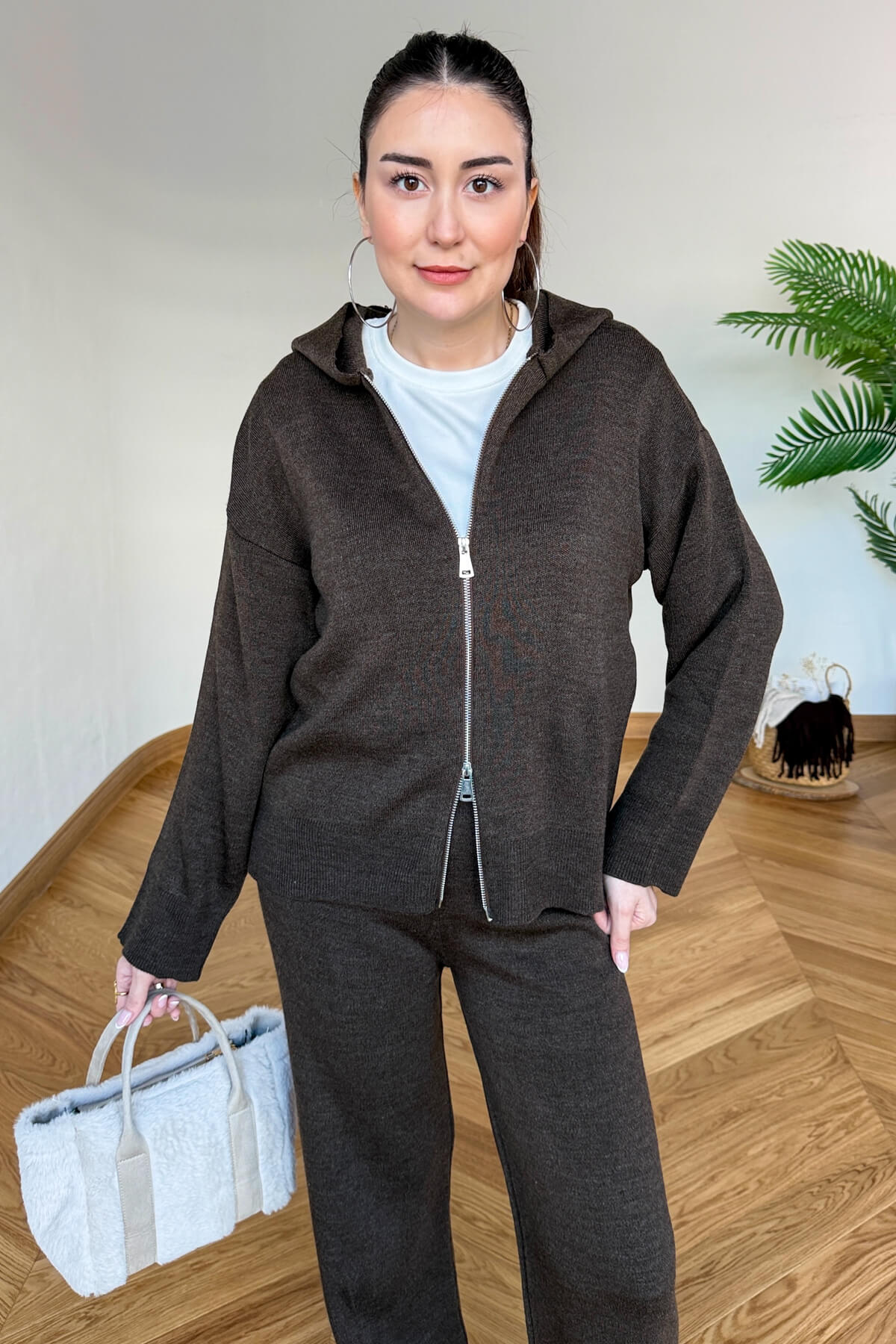 Üst kısmı kapüşonlu ve fermuarlı, spor–şık bir görünüm sunar.