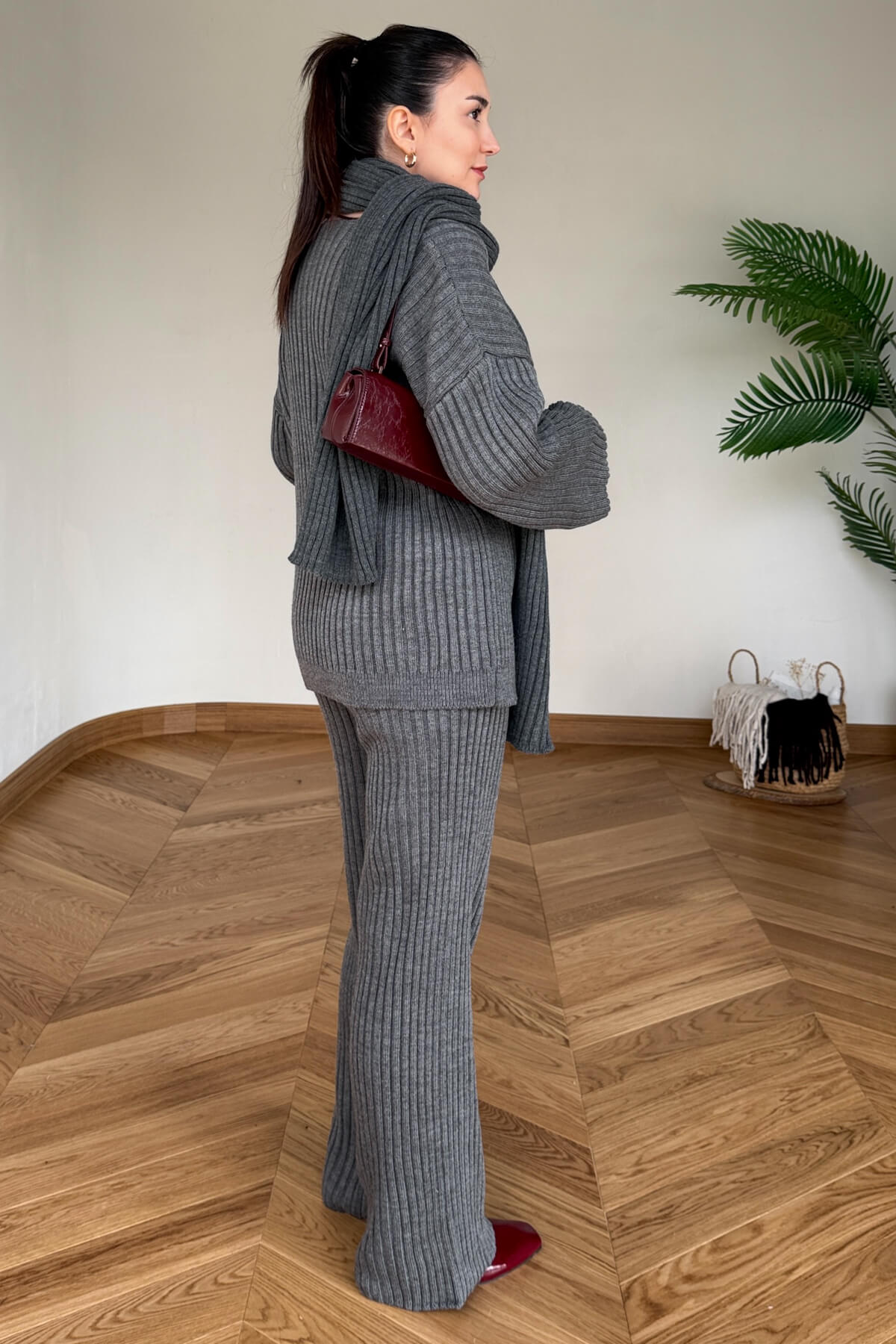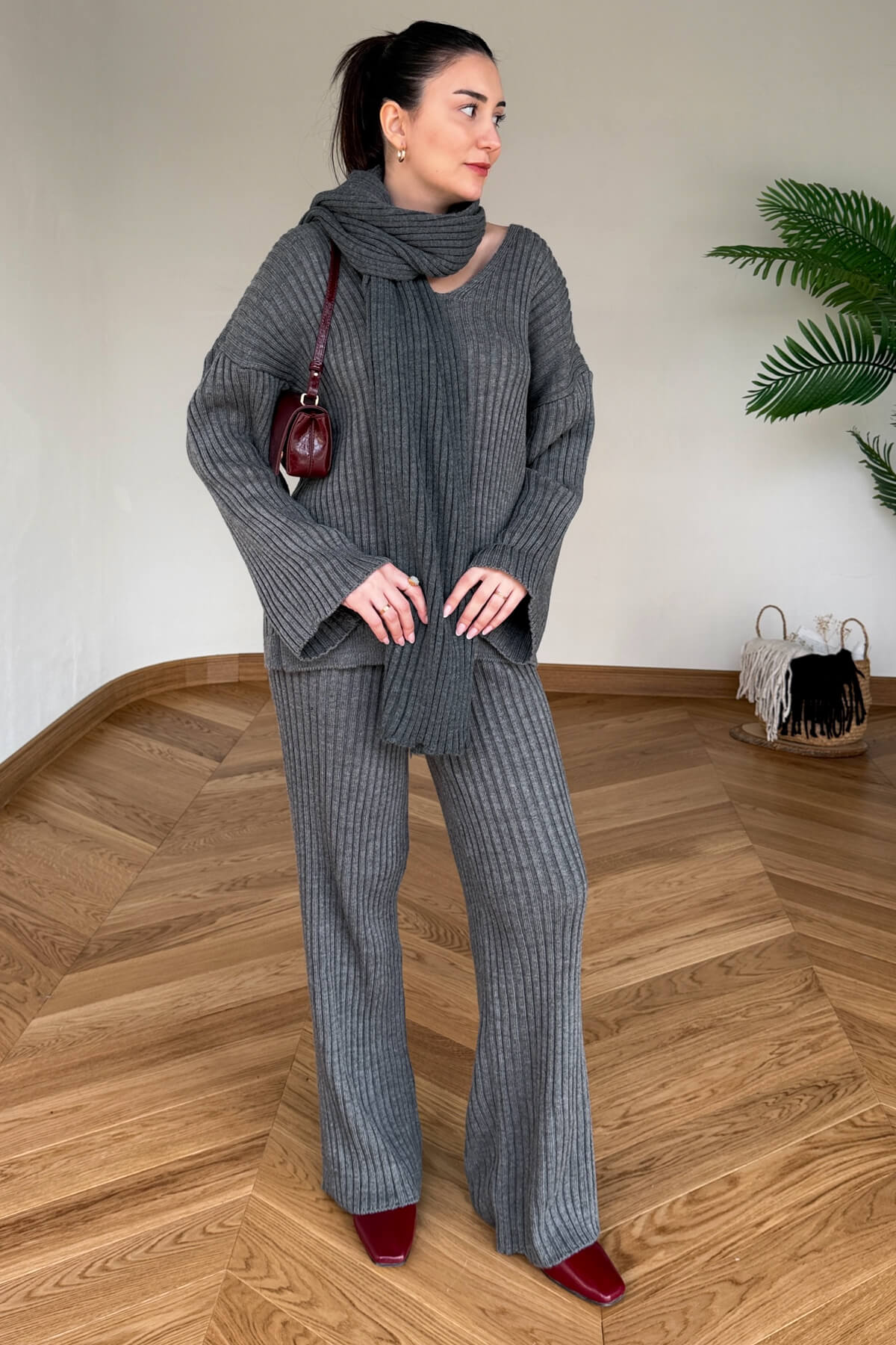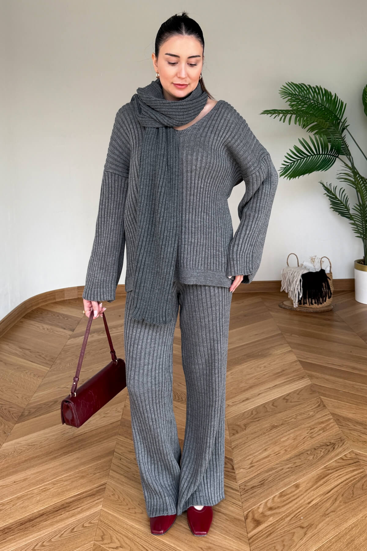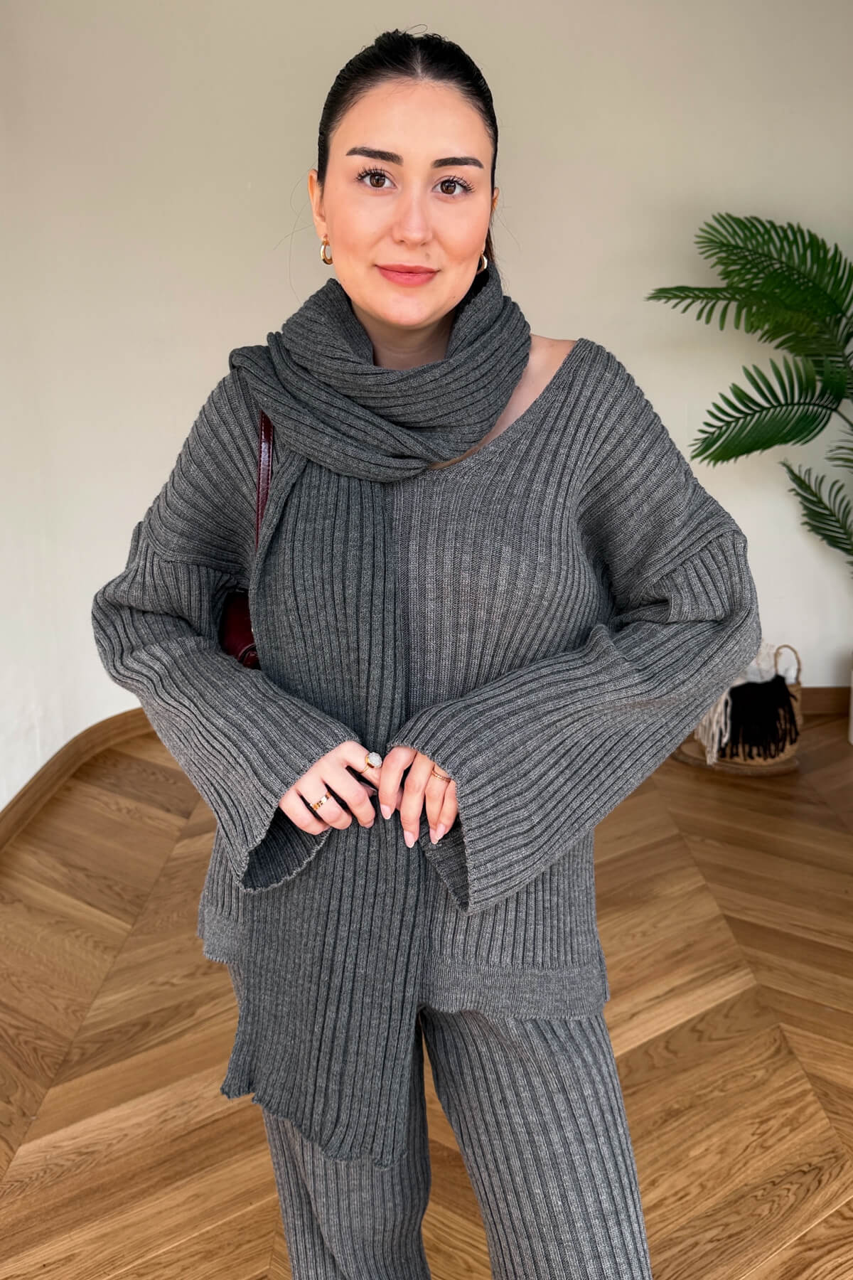 Ekstra triko şal ile kombin tamamlayıcı üçlü set.