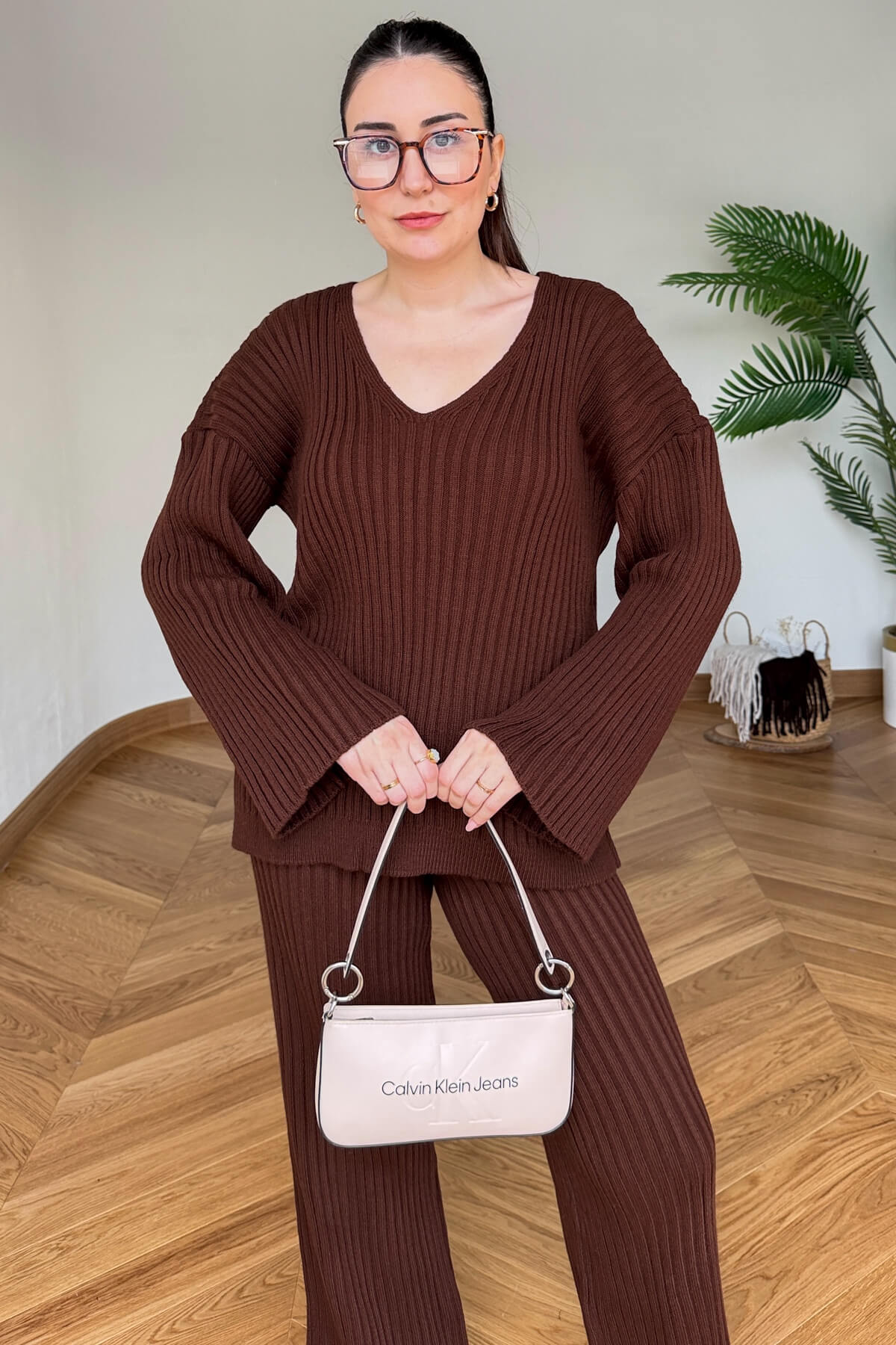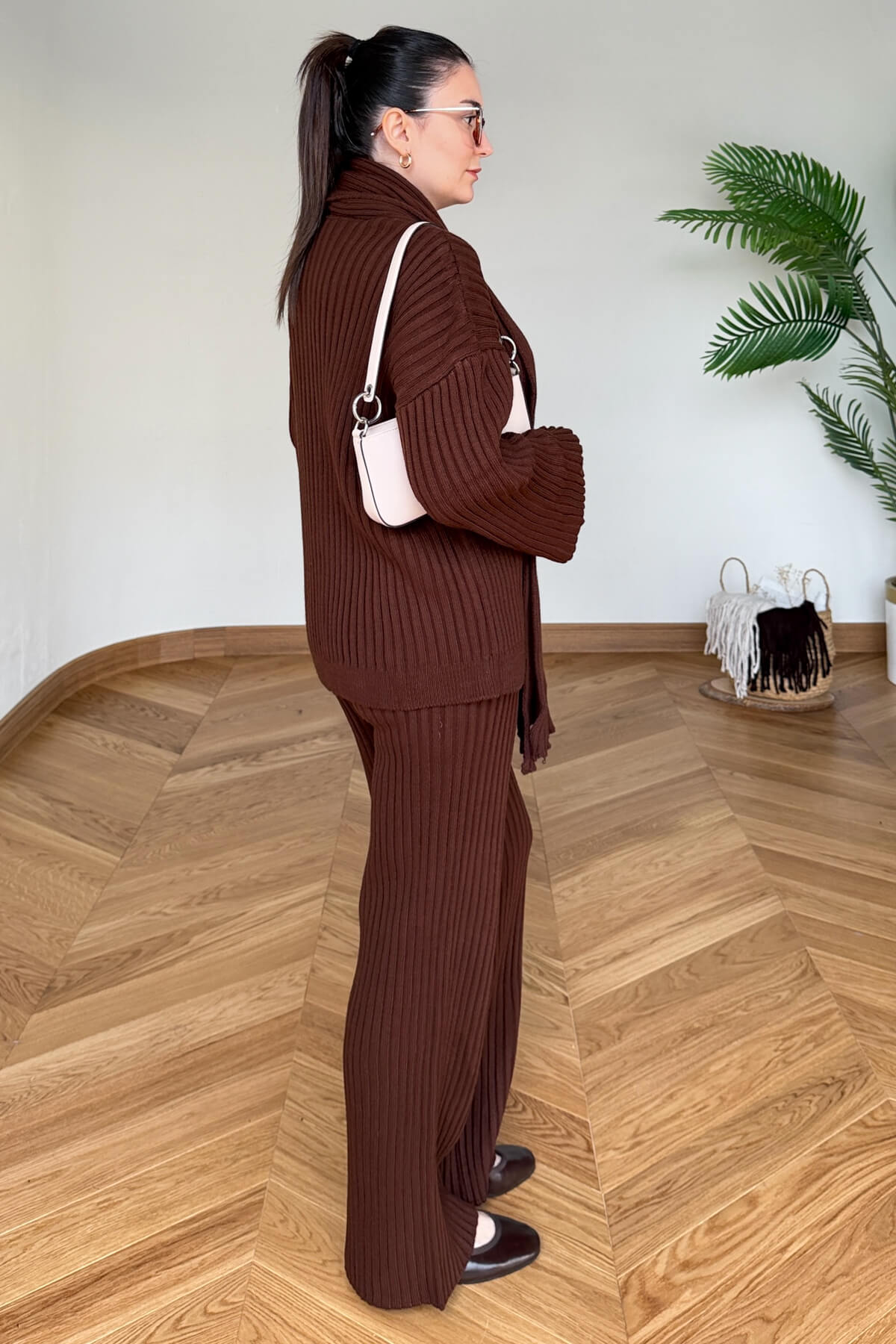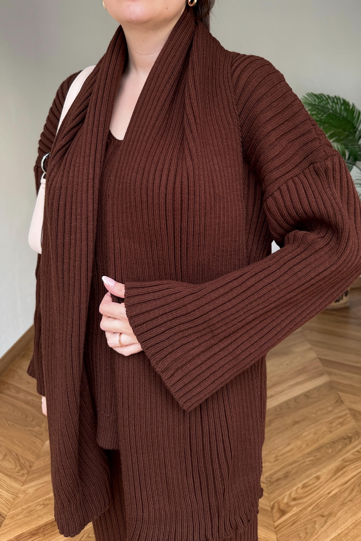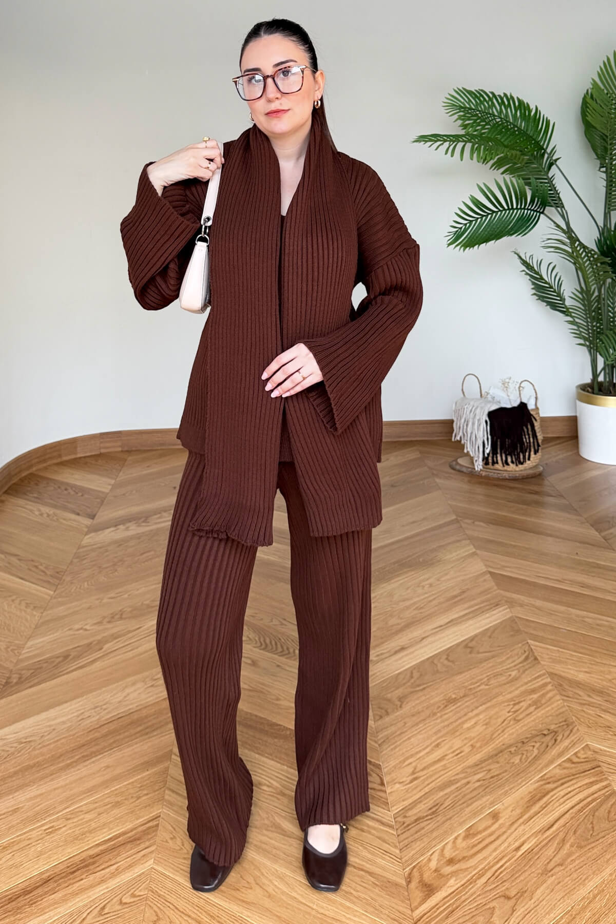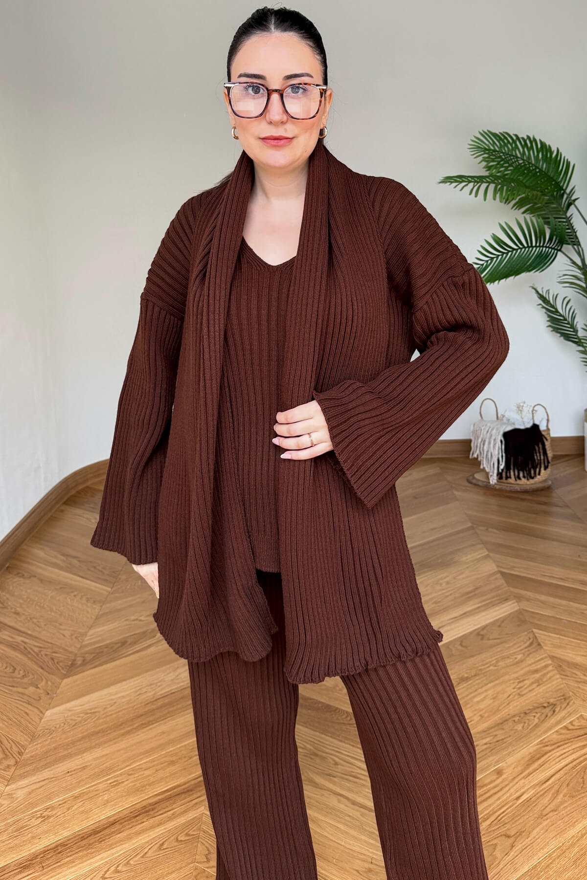 TKM-13367 Kahverengi Şallı Triko & Etek Fitilli Üçlü Takım