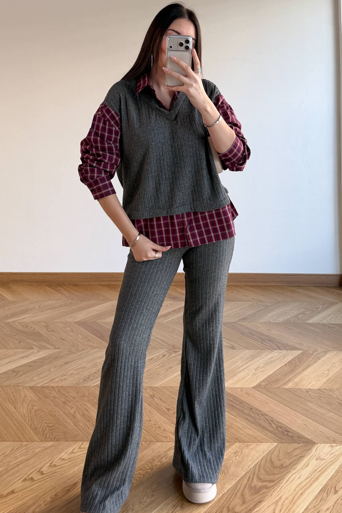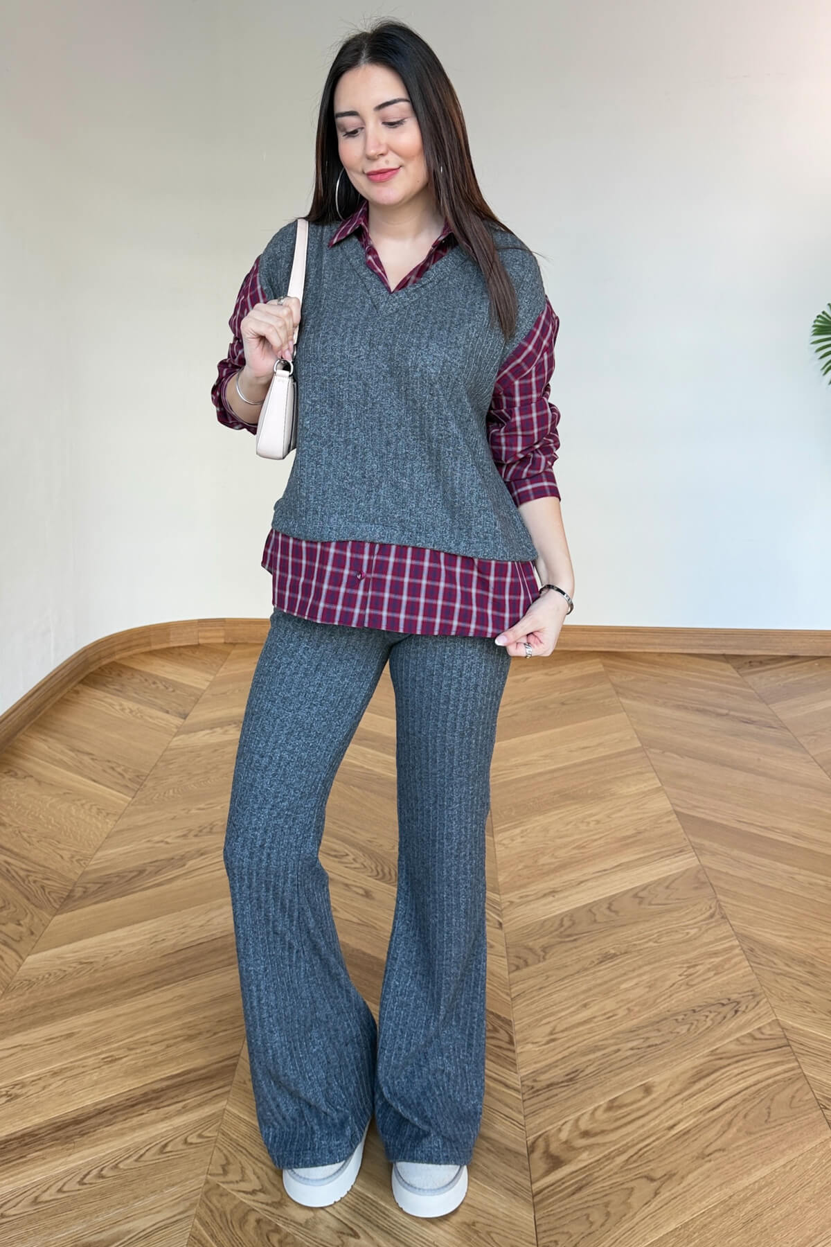 Teninize dost yumuşacık dokusuyla gün boyu üstün konfor sunan bu takım, triko rahatlığını gömlek şıklığıyla harmanlıyor. 62 cm uzunluğundaki üst parça, gömlek yaka ve etek ucu detaylarıyla modern bir katmanlı görünüm sağlarken; 112 cm uzunluğundaki yüksek belli pantolon, fitilli yapısıyla bacak boyunuzu kusursuz gösterir. Ev şıklığından sokak stiline kadar her alanda kullanabileceğiniz, üzerinizden çıkarmak istemeyeceğiniz özel bir parça.