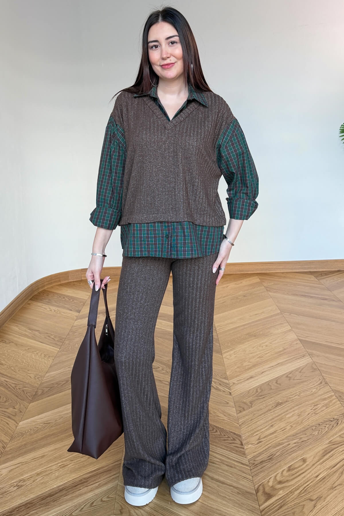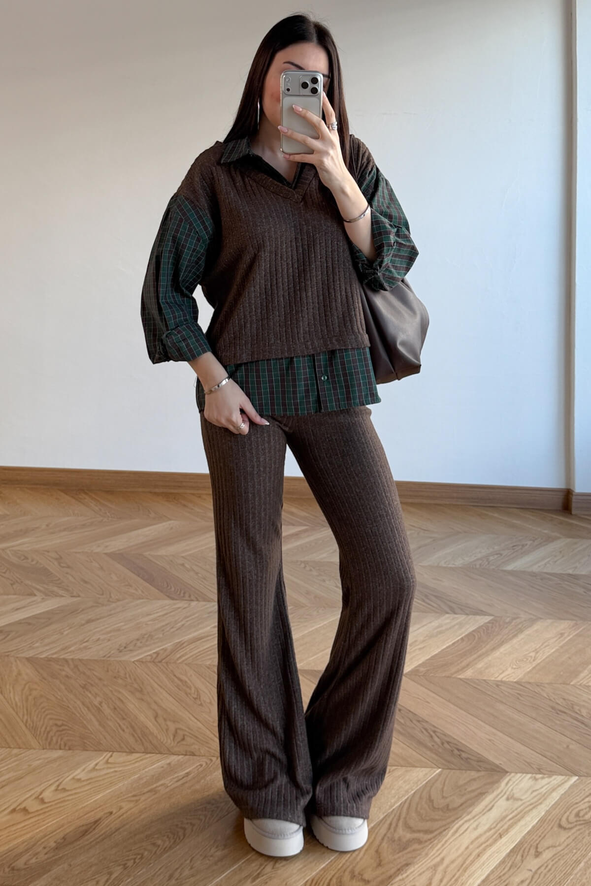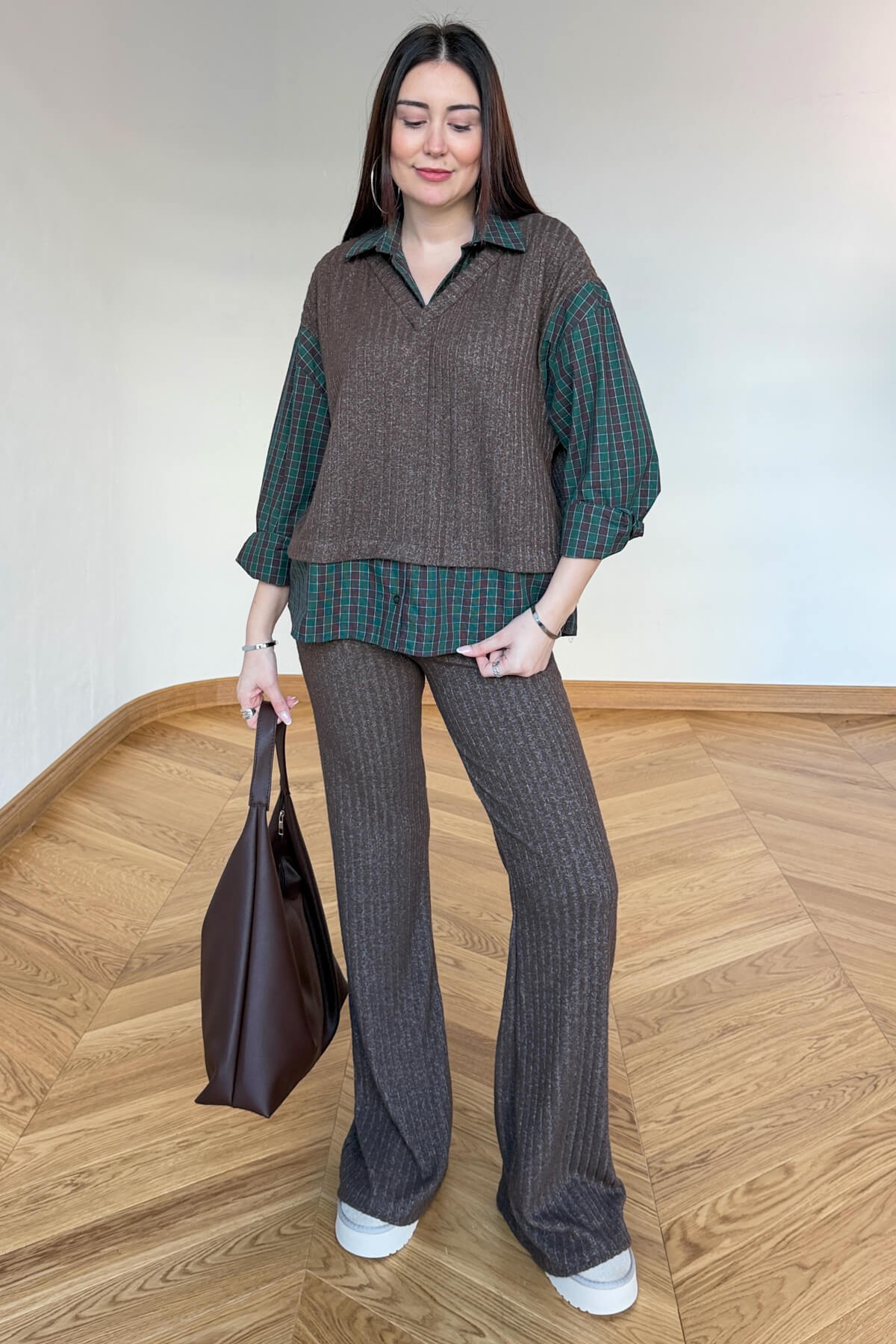 Teninize dost yumuşacık dokusuyla gün boyu üstün konfor sunan bu takım, triko rahatlığını gömlek şıklığıyla harmanlıyor. 62 cm uzunluğundaki üst parça, gömlek yaka ve etek ucu detaylarıyla modern bir katmanlı görünüm sağlarken; 112 cm uzunluğundaki yüksek belli pantolon, fitilli yapısıyla bacak boyunuzu kusursuz gösterir. Ev şıklığından sokak stiline kadar her alanda kullanabileceğiniz, üzerinizden çıkarmak istemeyeceğiniz özel bir parça.