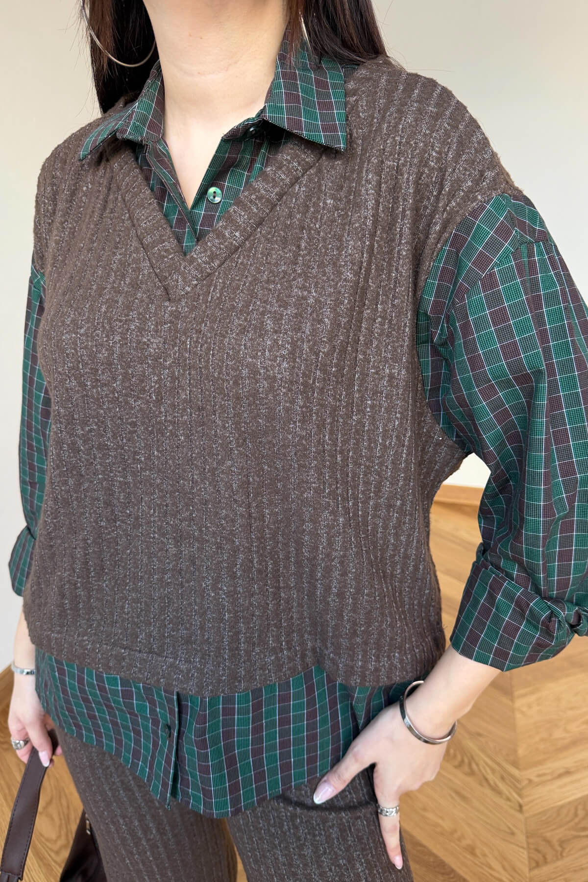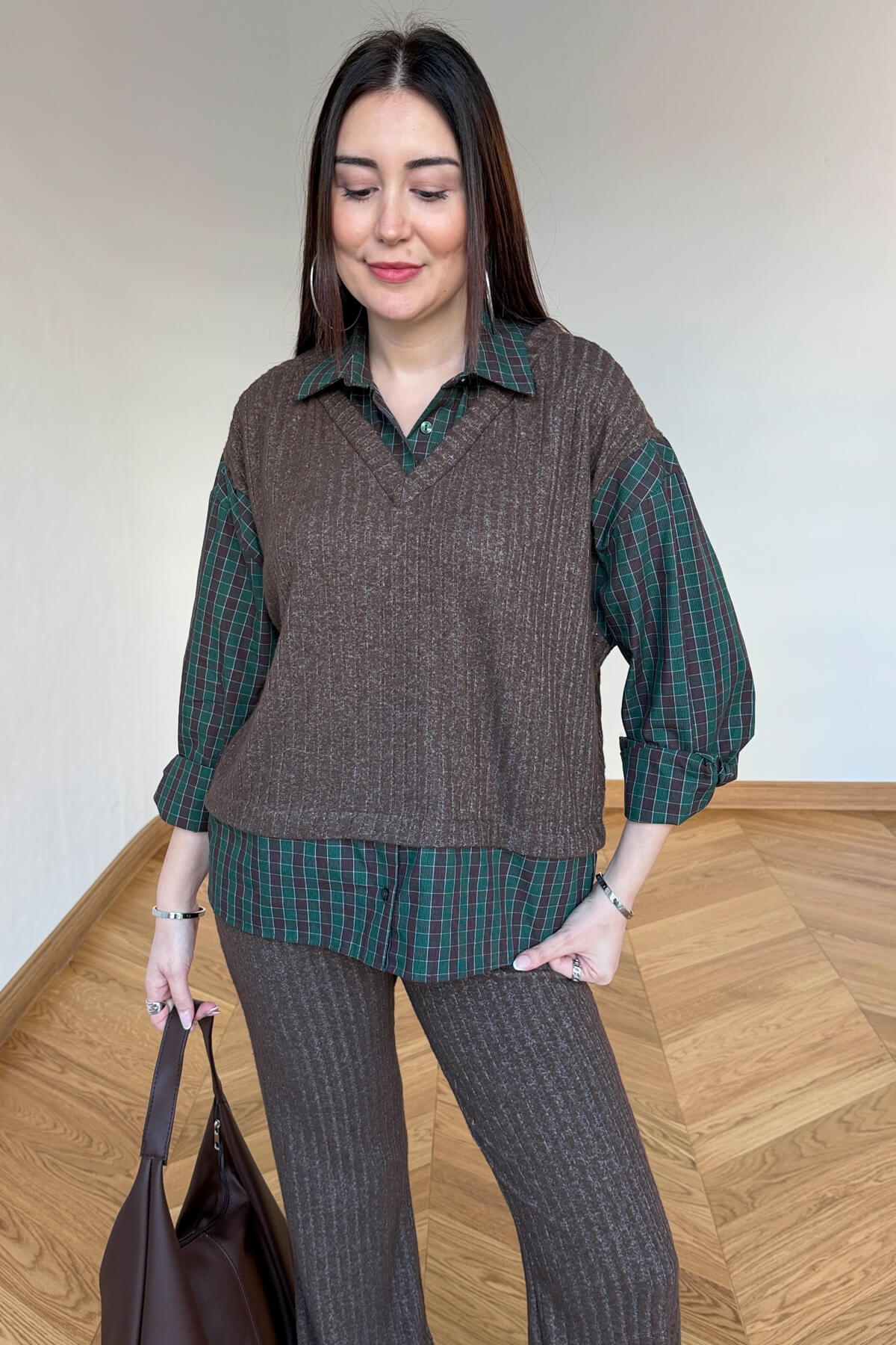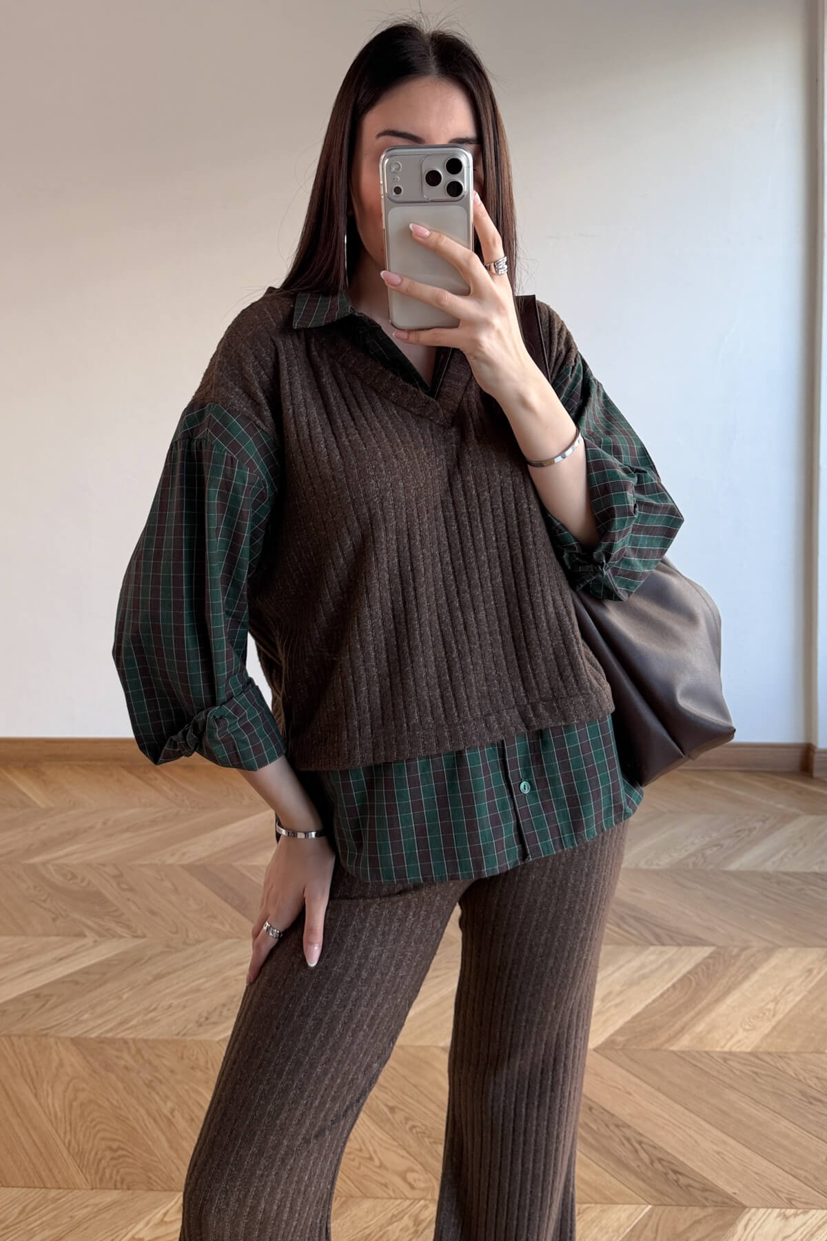 Teninize dost yumuşacık dokusuyla gün boyu üstün konfor sunan bu takım, triko rahatlığını gömlek şıklığıyla harmanlıyor. 62 cm uzunluğundaki üst parça, gömlek yaka ve etek ucu detaylarıyla modern bir katmanlı görünüm sağlarken; 112 cm uzunluğundaki yüksek belli pantolon, fitilli yapısıyla bacak boyunuzu kusursuz gösterir. Ev şıklığından sokak stiline kadar her alanda kullanabileceğiniz, üzerinizden çıkarmak istemeyeceğiniz özel bir parça.