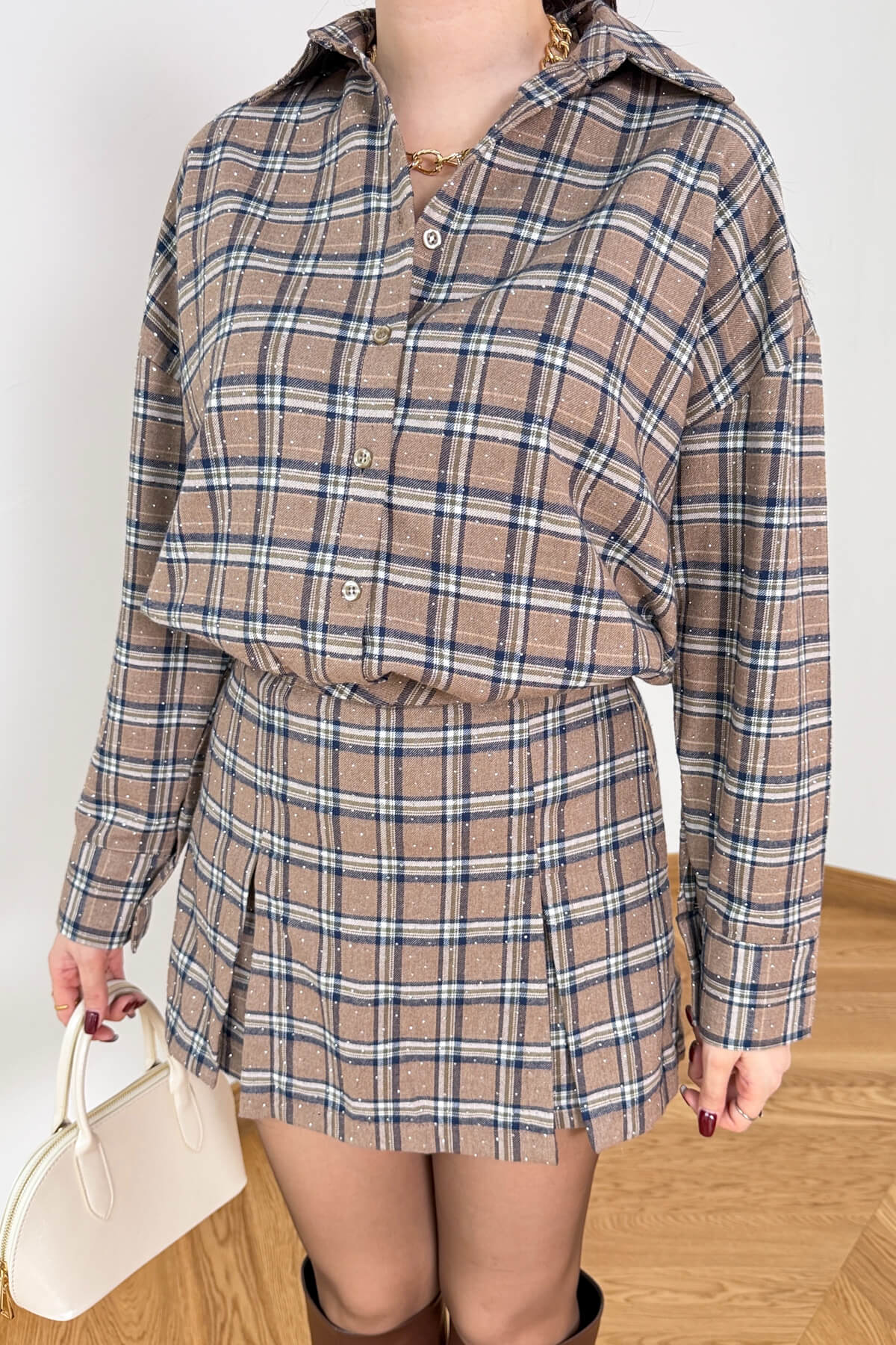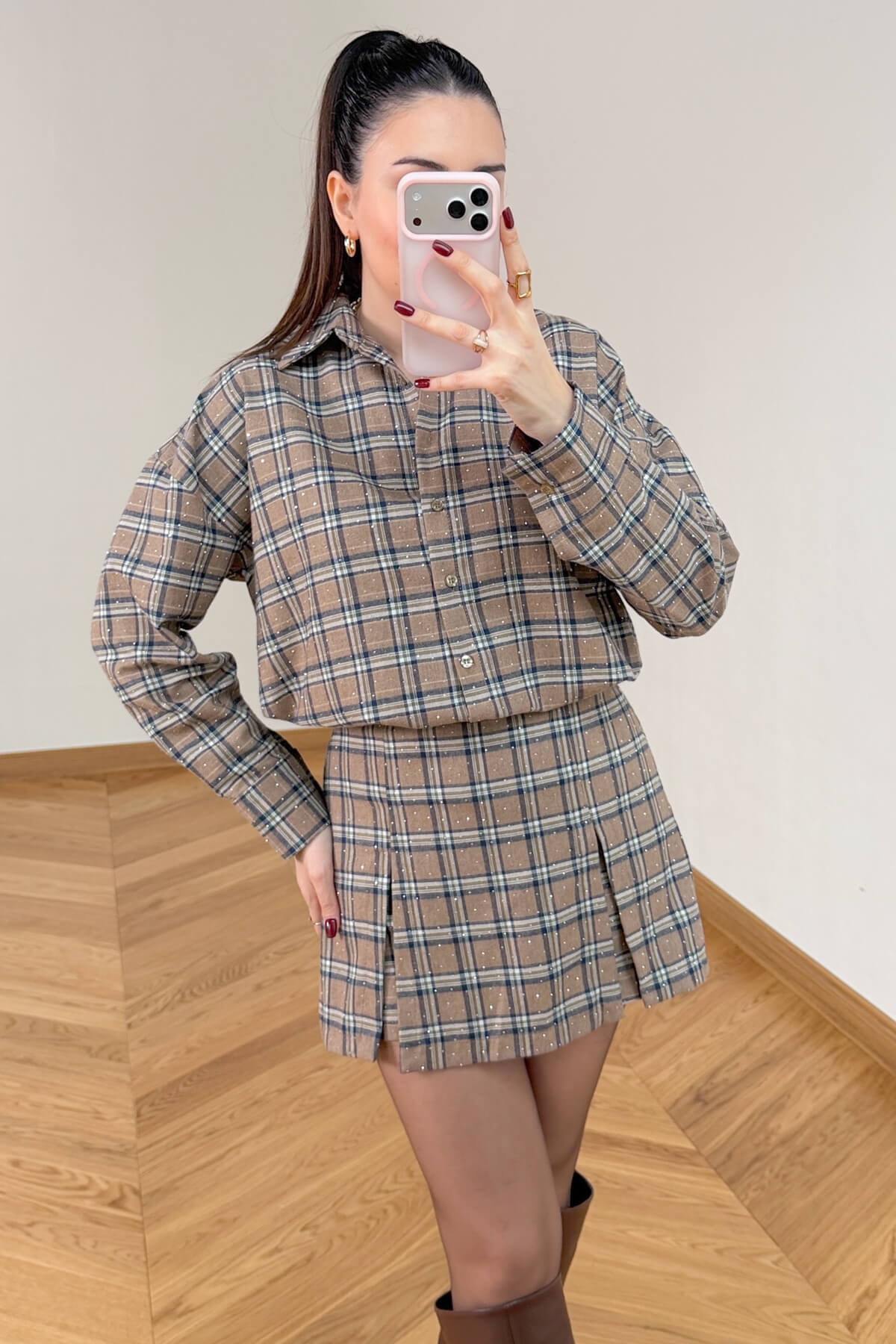 Klasik ekose desenini modern bir ışıltıyla buluşturan bu ikili takım, zahmetsiz şıklığın anahtarını sunuyor. Kahve ve laci tonlarının sofistike uyumu, kumaş üzerine serpiştirilmiş zarif taş işlemeleriyle hareket kazanıyor. Rahat kesim gömleği ve pile detaylı mini eteği ile hem feminen hem de dinamik bir "preppy" (kolej) stili vadeden bu takım, kusursuz silüetiyle gardırobunuzun favorisi olacak.