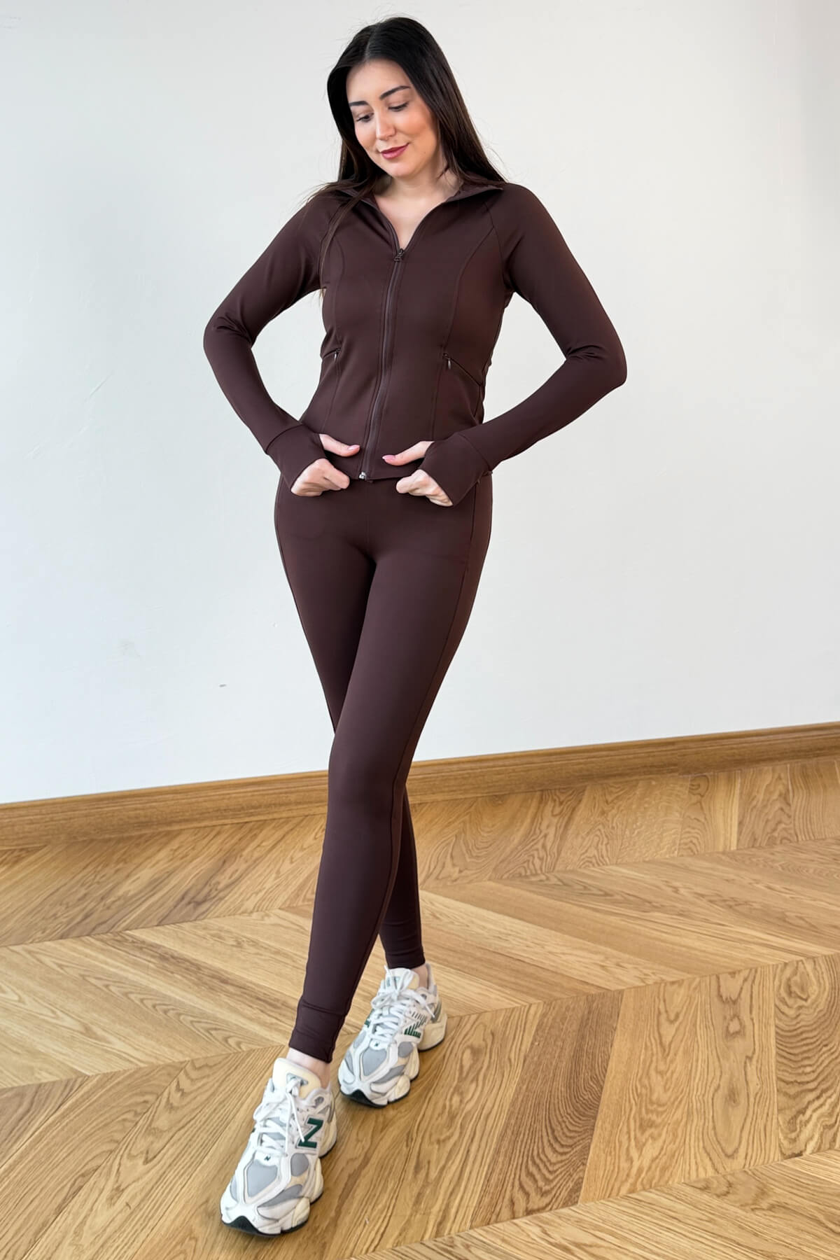 Spor şıklığı fonksiyonel detaylarla buluşturan bu ikili takım, gardırobunuzun en dinamik parçası olmaya aday. Vücudu saran özel toparlayıcı alt yapısı sayesinde daha fit ve sıkı bir görünüm sunarken, 95 cm uzunluğundaki tayt, bacak boyunuzu zarifçe vurgular. 56 cm ideal boya sahip üst parça, modern dik yaka tasarımı ve pratik fermuarlı cepleri ile hem sabah yürüyüşlerinde hem de günlük koşturmacada konforunuzdan ödün vermemenizi sağlar. Esnek yapısı hareket özgürlüğü tanırken, mat ve pürüzsüz dokusu sofistike bir stil vadeder.