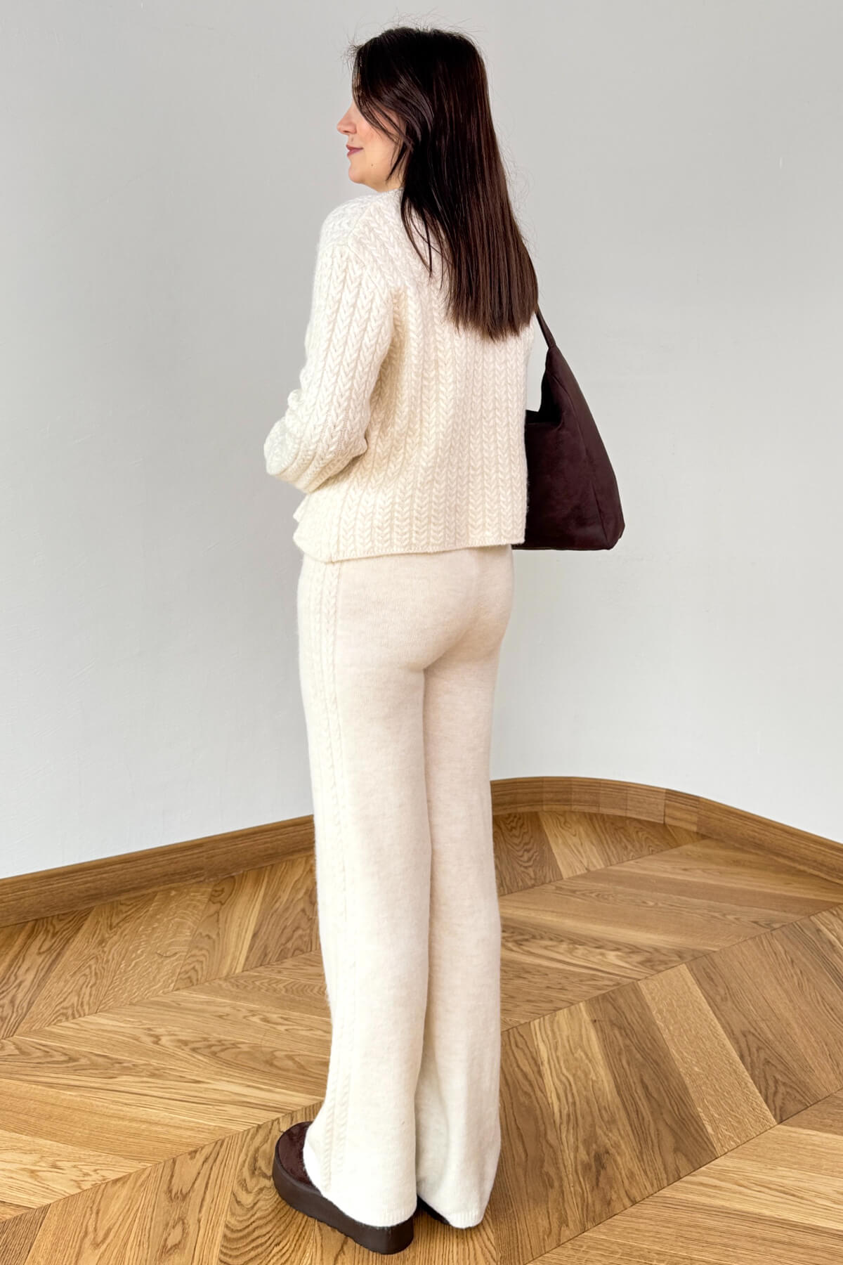 Örgü desen detayları, takıma hem modern hem de şık bir görünüm kazandırır.