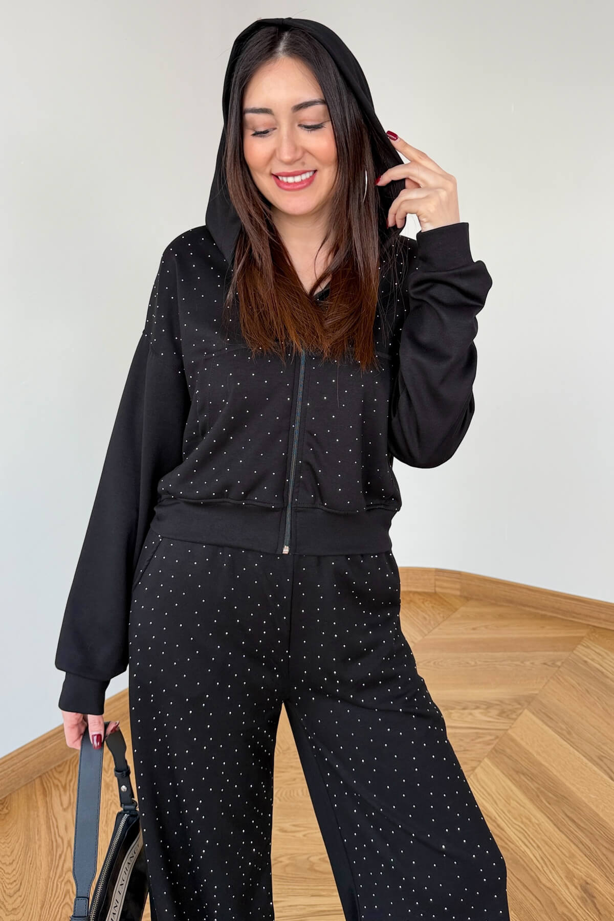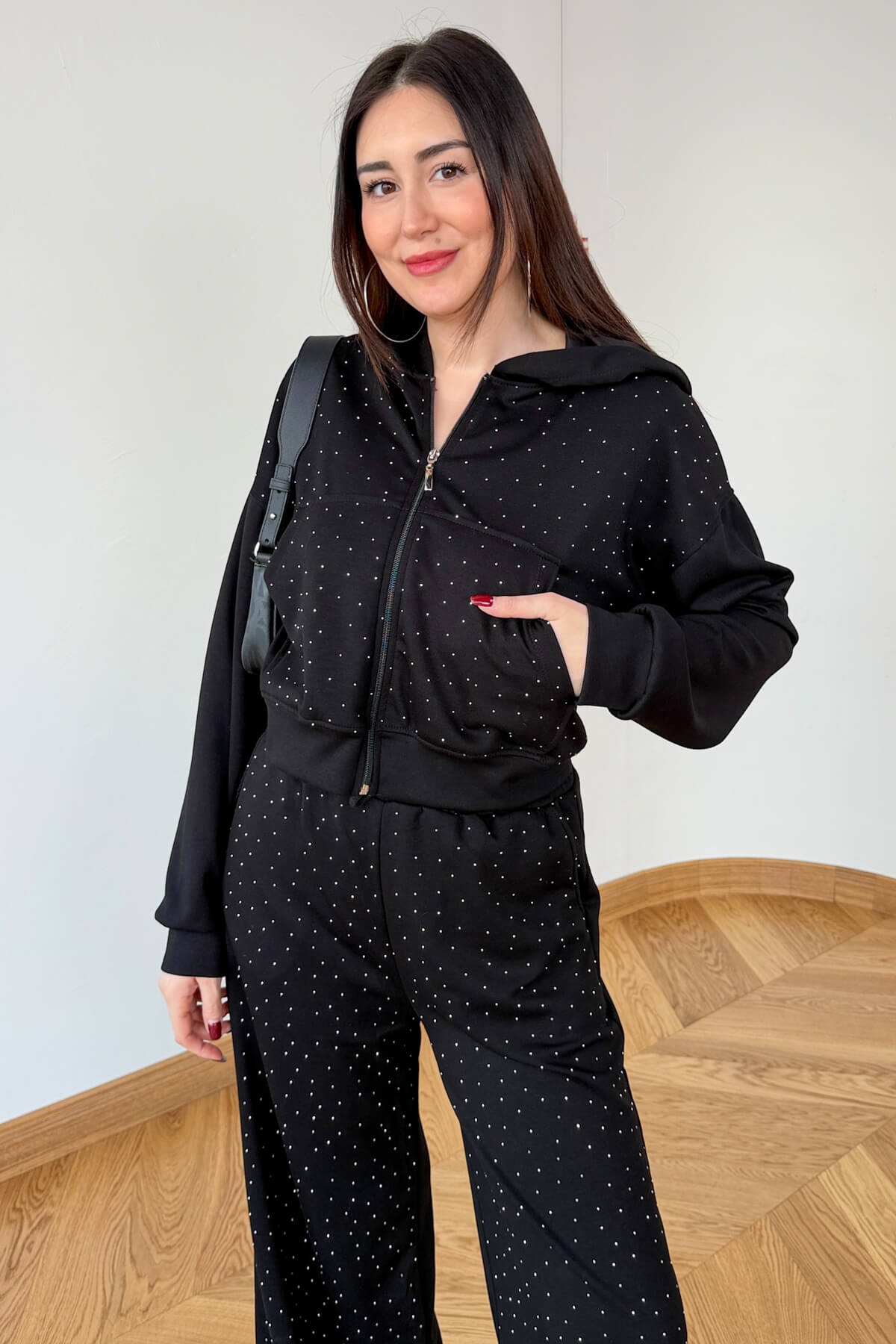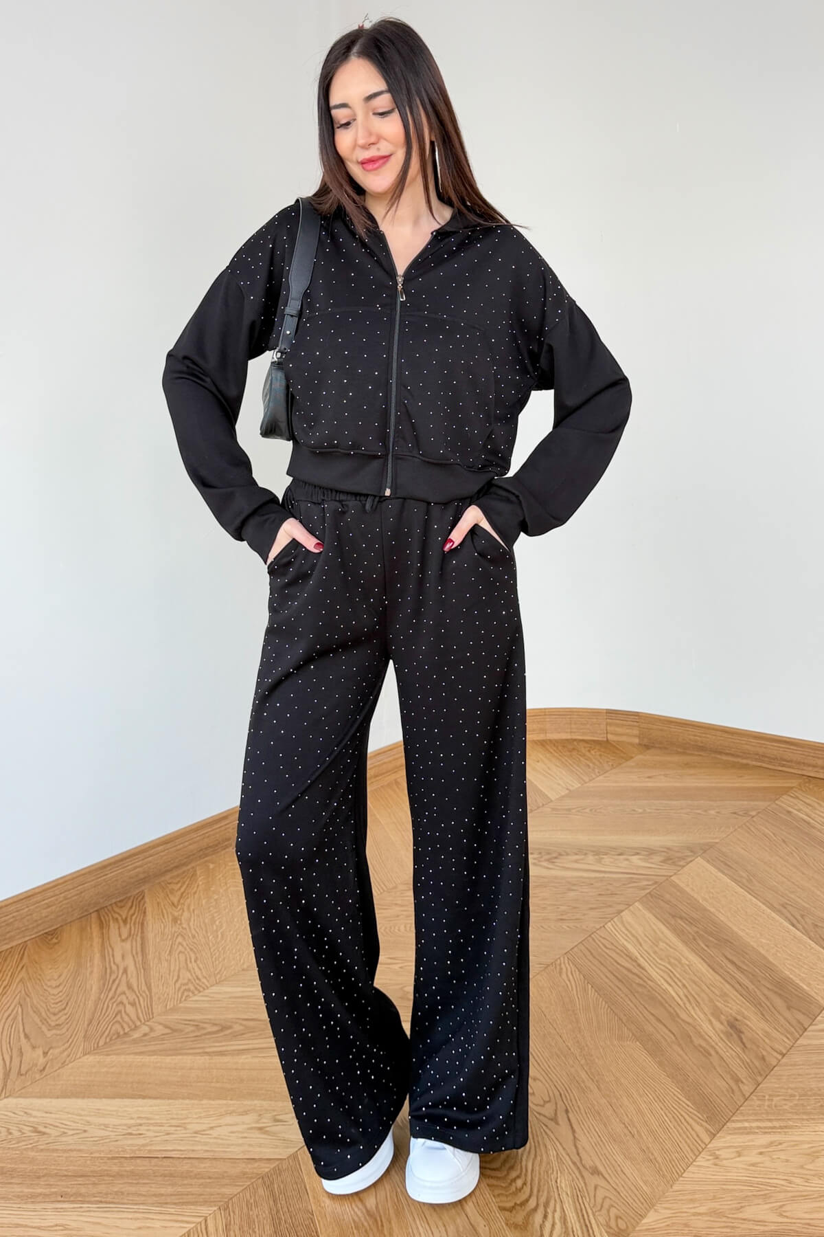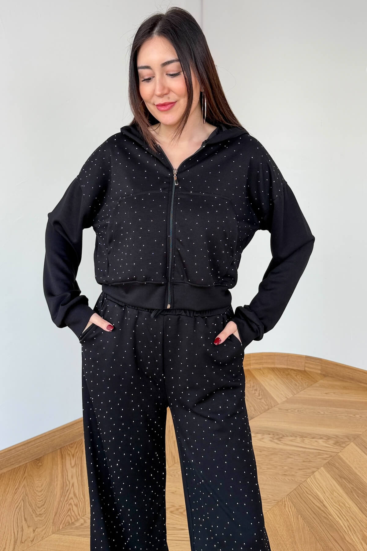 Spor giyimin konforunu ışıltılı detaylarla lüks bir seviyeye taşıyan bu takım, sokak stilinde fark yaratmak isteyenler için tasarlandı. Modal kumaşın ipeksi yumuşaklığı ve dökümlü yapısı, tüm yüzeye serpiştirilmiş zarif taş işlemeleriyle buluşarak göz alıcı bir silüet sunar. 52 cm boyundaki kapüşonlu ve kanguru cepli üst parça, modern crop kesimiyle bel hattını vurgularken; 104 cm uzunluğundaki rahat kesim pantolon, bacak boyunuzu olduğundan uzun gösterir. Acı kahve ve siyah seçenekleriyle hem ev şıklığında hem de dışarıda stilinizden ödün vermeden kullanabilirsiniz.