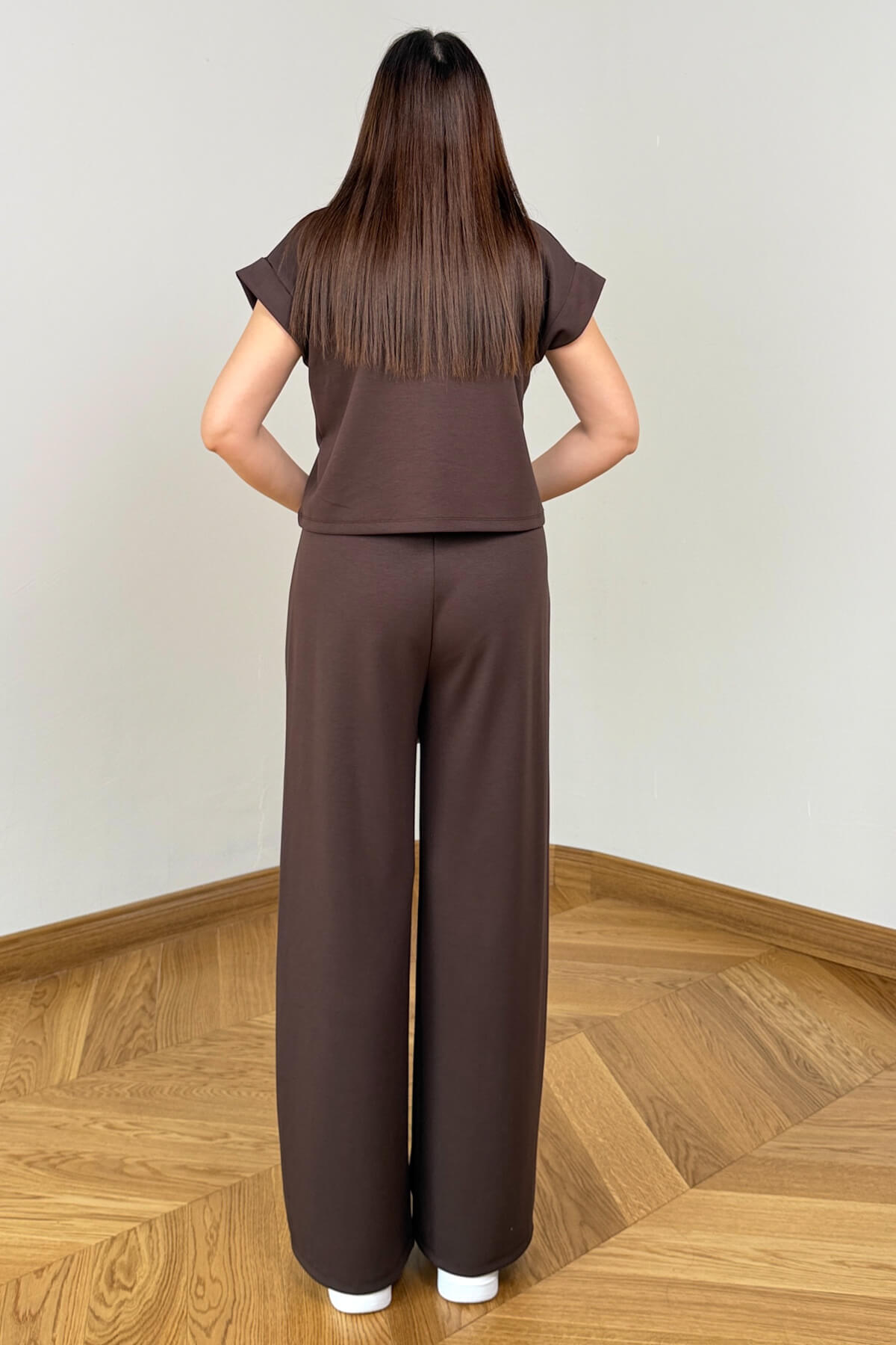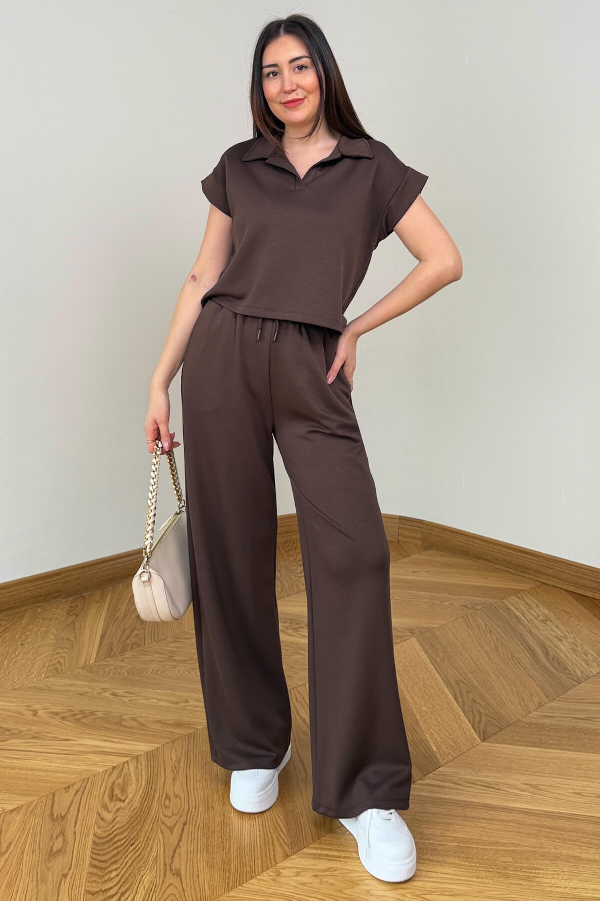 Modal kumaşın ipeksi yumuşaklığını ve nefes alan yapısını sportif bir zarafetle buluşturan bu ikili takım, günlük şıklığınızda konforu en üst seviyeye taşıyor. 46 cm boyundaki modern polo yaka üst tasarımı ve 106 cm boyundaki dökümlü alt parçasıyla kusursuz bir uyum sergileyen bu takım, akışkan dokusu sayesinde gün boyu hafiflik hissi veriyor. Yarım kol detayı ve minimal kesimiyle hem ev konforunda hem de dış mekan kombinlerinde sofistike ve modern bir silüet çizmenize yardımcı oluyor.
