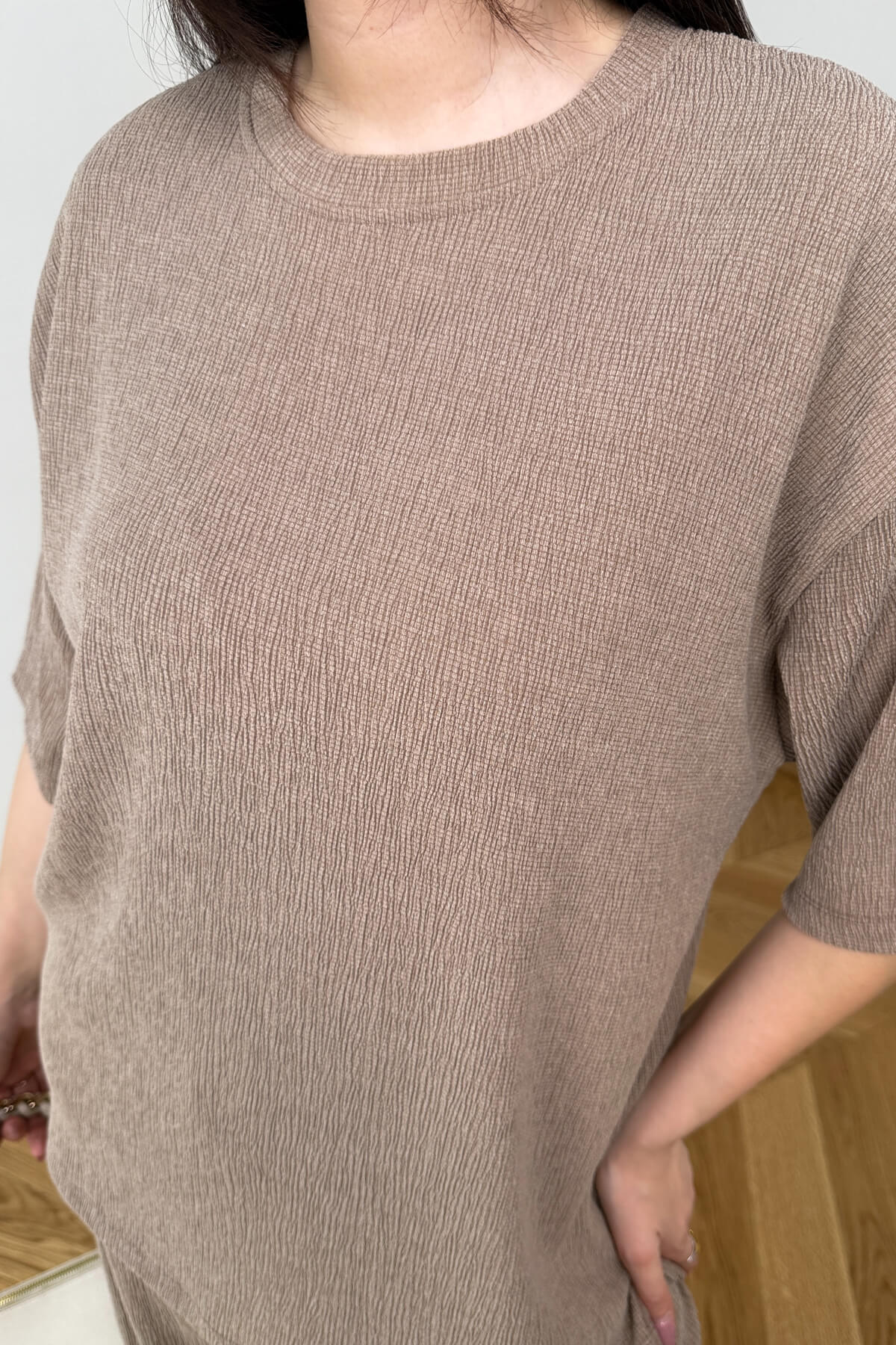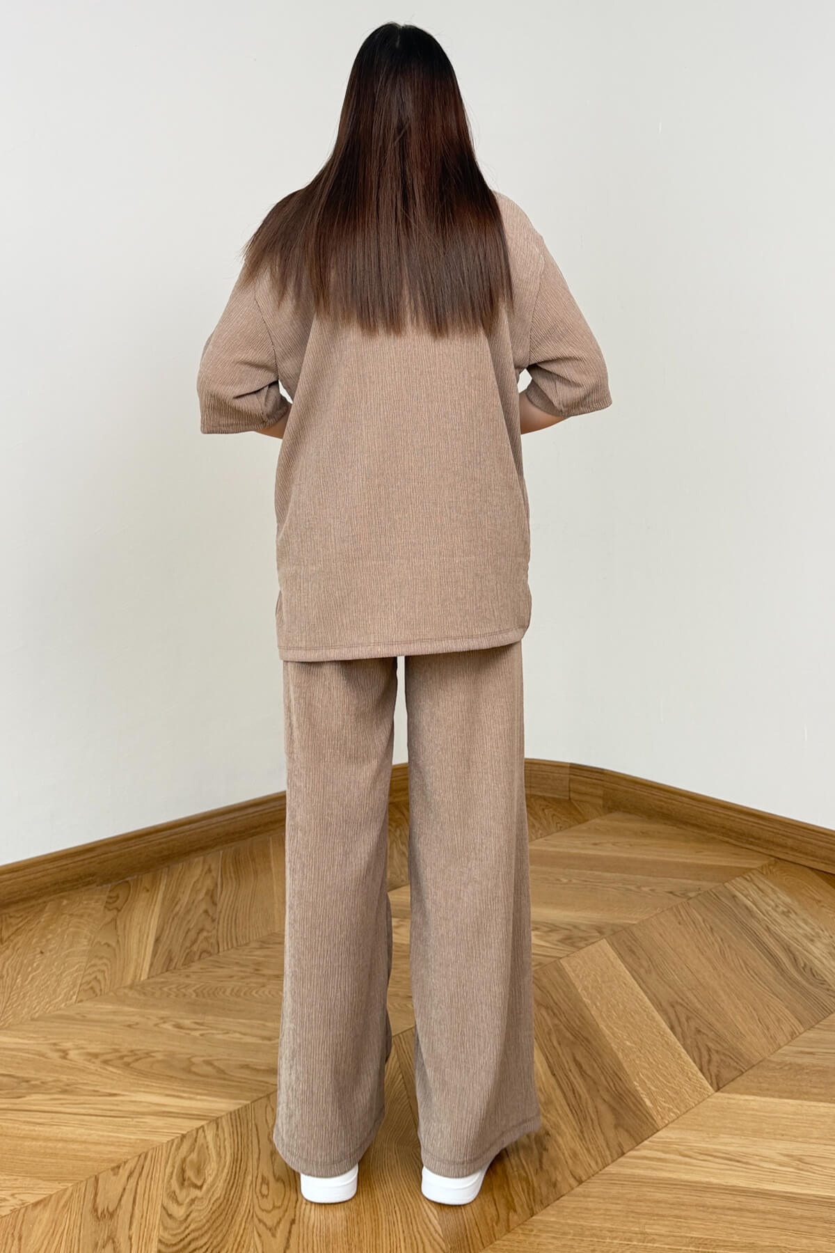 Bürümcük kumaşın kendine has dokusuyla hayat bulan bu ikili takım, eforsuz şıklığı ve üst düzey konforu bir arada sunuyor. 72 cm boyundaki salaş kesim bluzu ve 106 cm boyundaki dökümlü pantolonuyla modern bir silüet çizen takım, ütü gerektirmeyen yapısı sayesinde günlük hayatınızda büyük kolaylık sağlıyor. Hafif ve nefes alan dokusuyla gün boyu ferah hissetmenizi sağlayan bu tasarım, hem ev stilinizde hem de şehir hayatında kusursuz bir duruş sergiliyor.