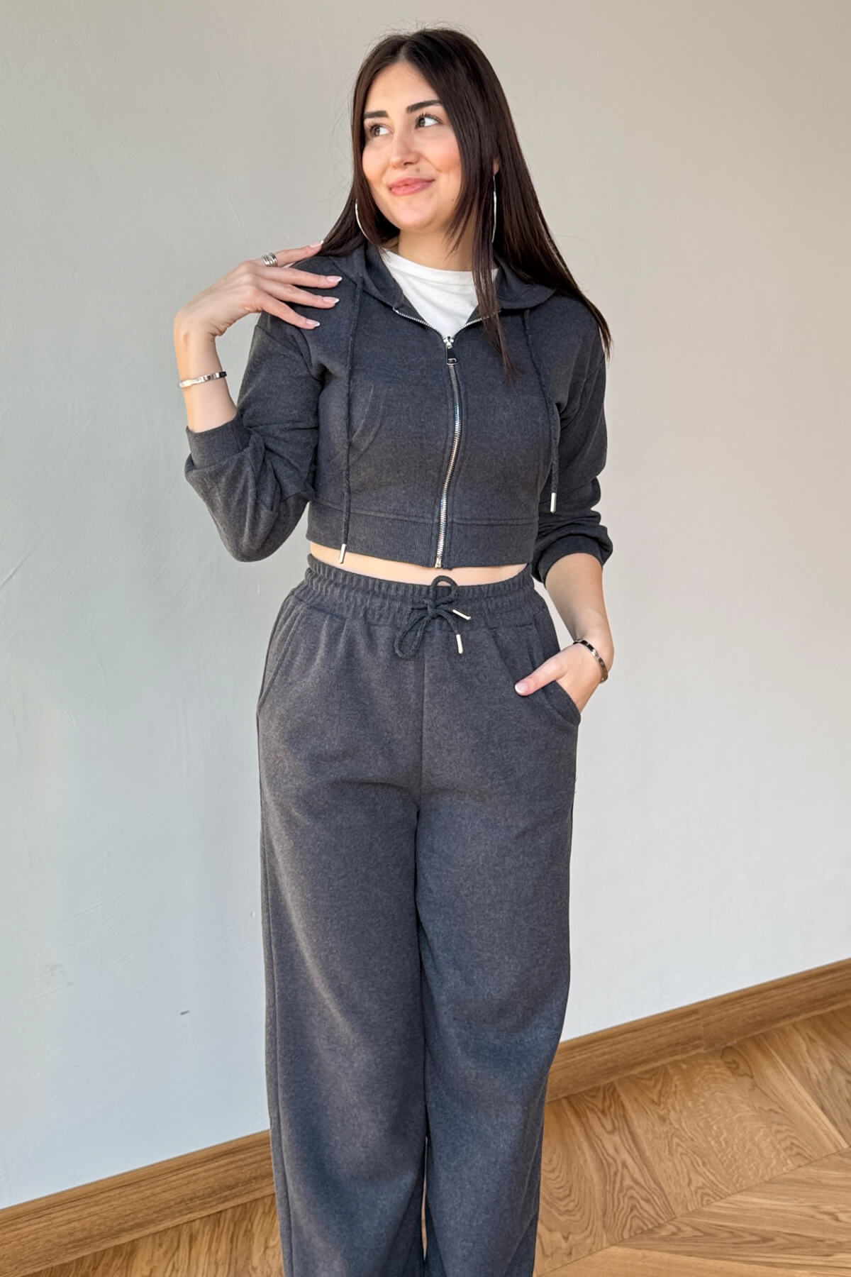 Kapüşonlu, fermuarlı crop üst ile dinamik ve modern görünüm