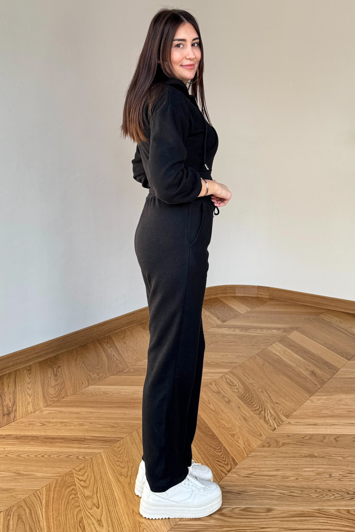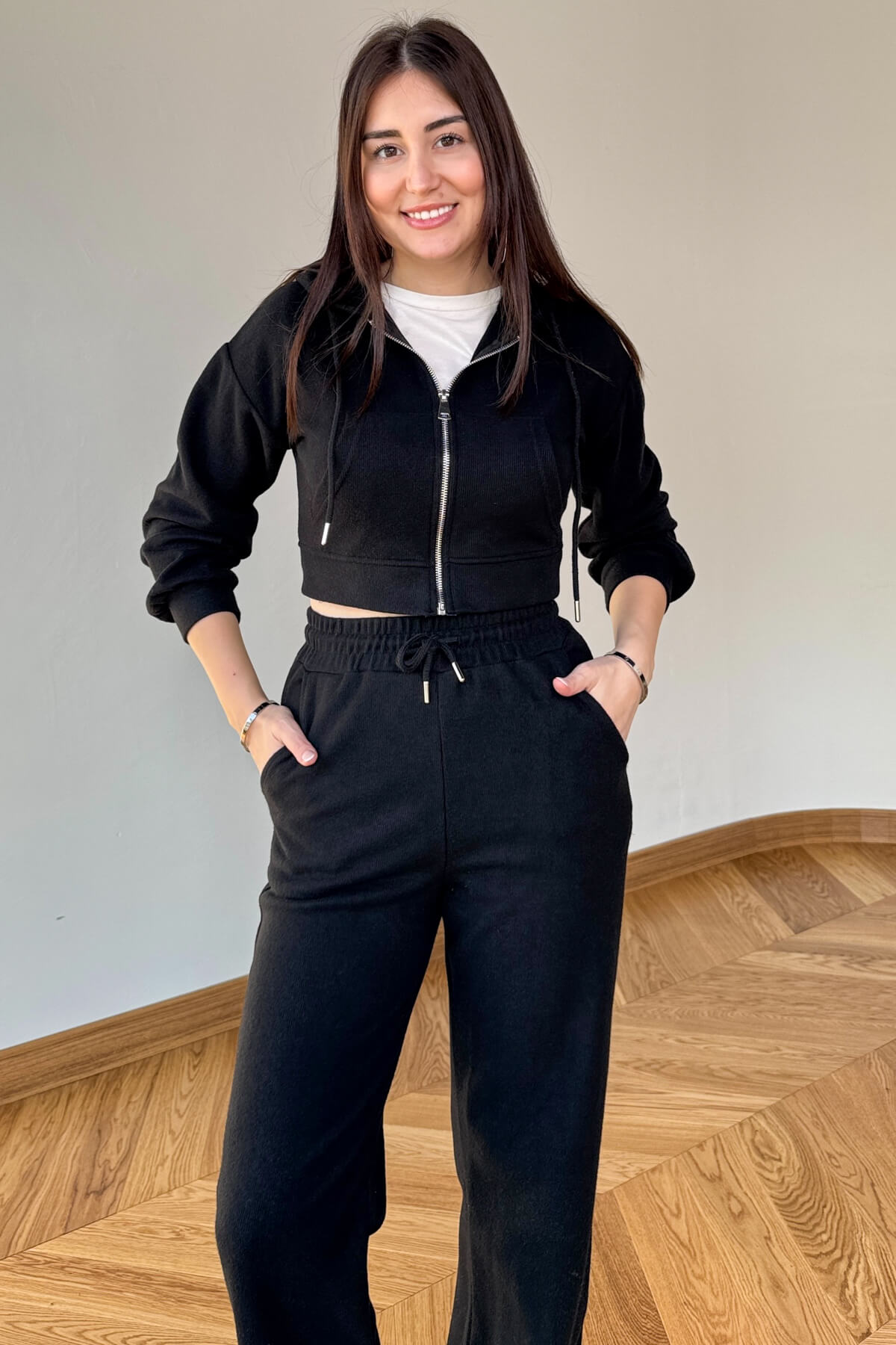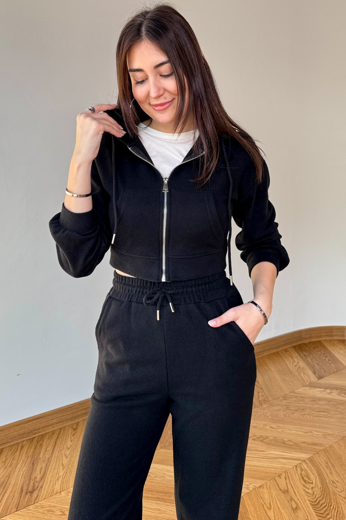 Kapüşonlu, fermuarlı crop üst ile dinamik ve modern görünüm