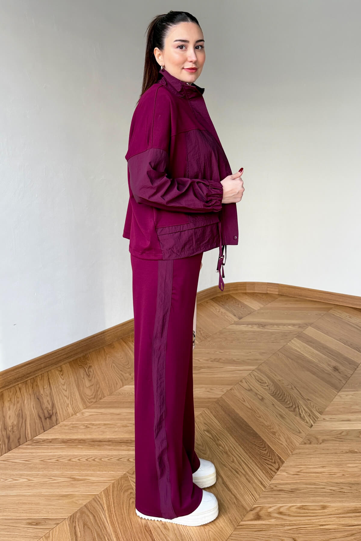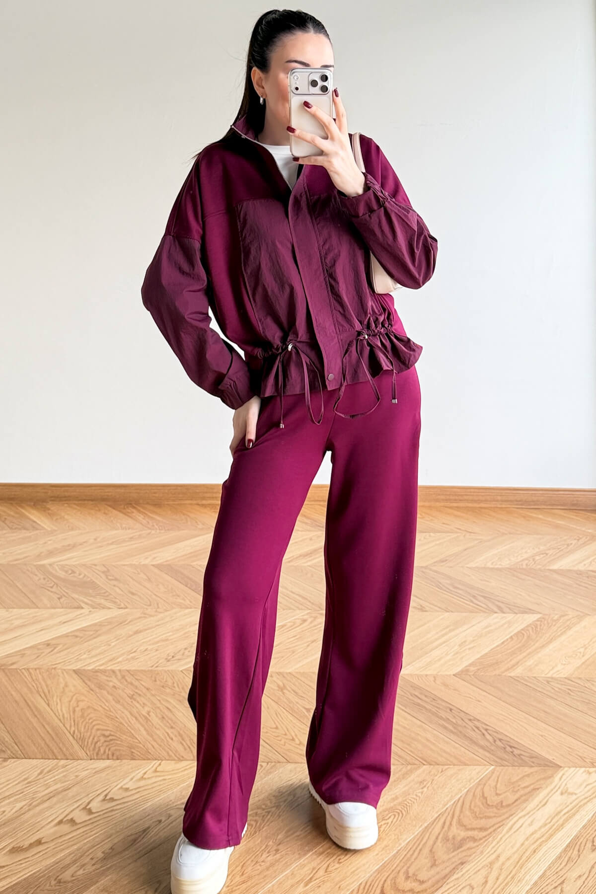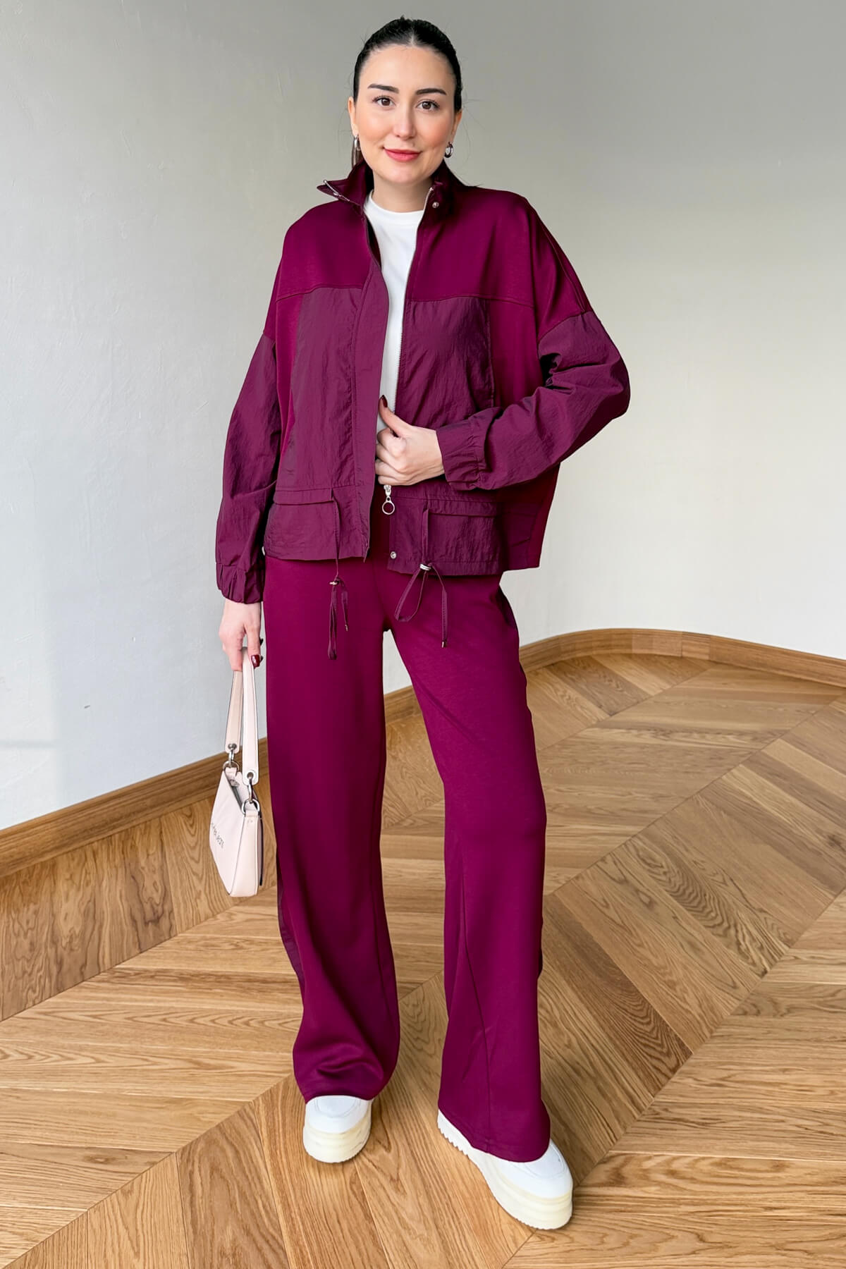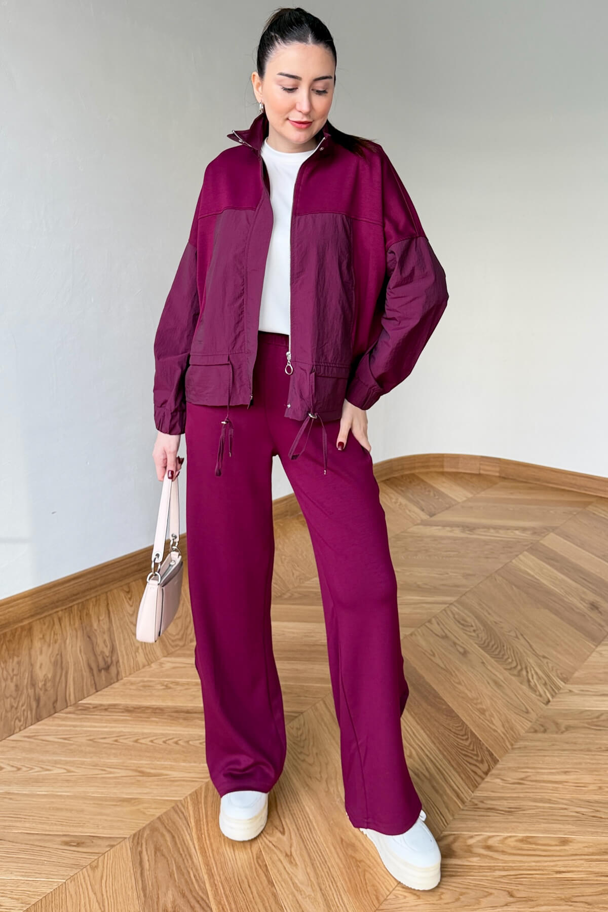Paraşüt modal kumaşın hafifliği ve tok duruşu, 62 cm uzunluğundaki dik yakalı üst tasarımda modern bir form kazanıyor. Geniş cep detayları ve metal fermuarı tasarıma işlevsel bir şıklık katarken, 60 cm göğüs genişliği ile vücudu sıkmayan ferah bir kullanım sağlıyor. 110 cm boyundaki pantolonu ise silüetinizi uzun ve zarif göstererek takımı kusursuzca tamamlıyor.