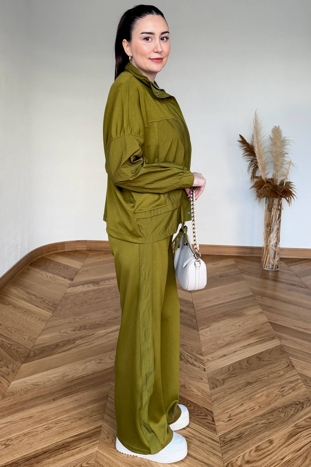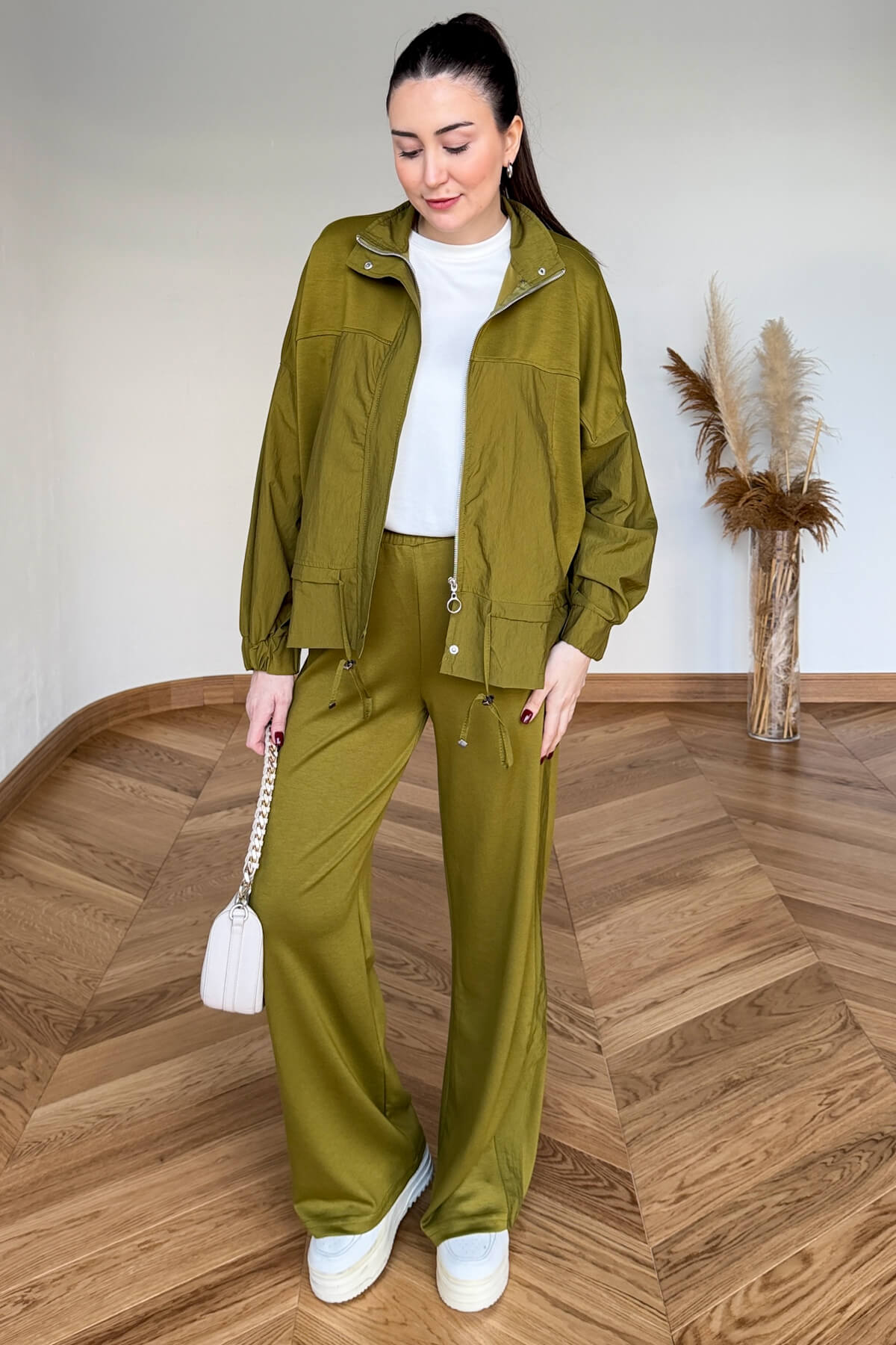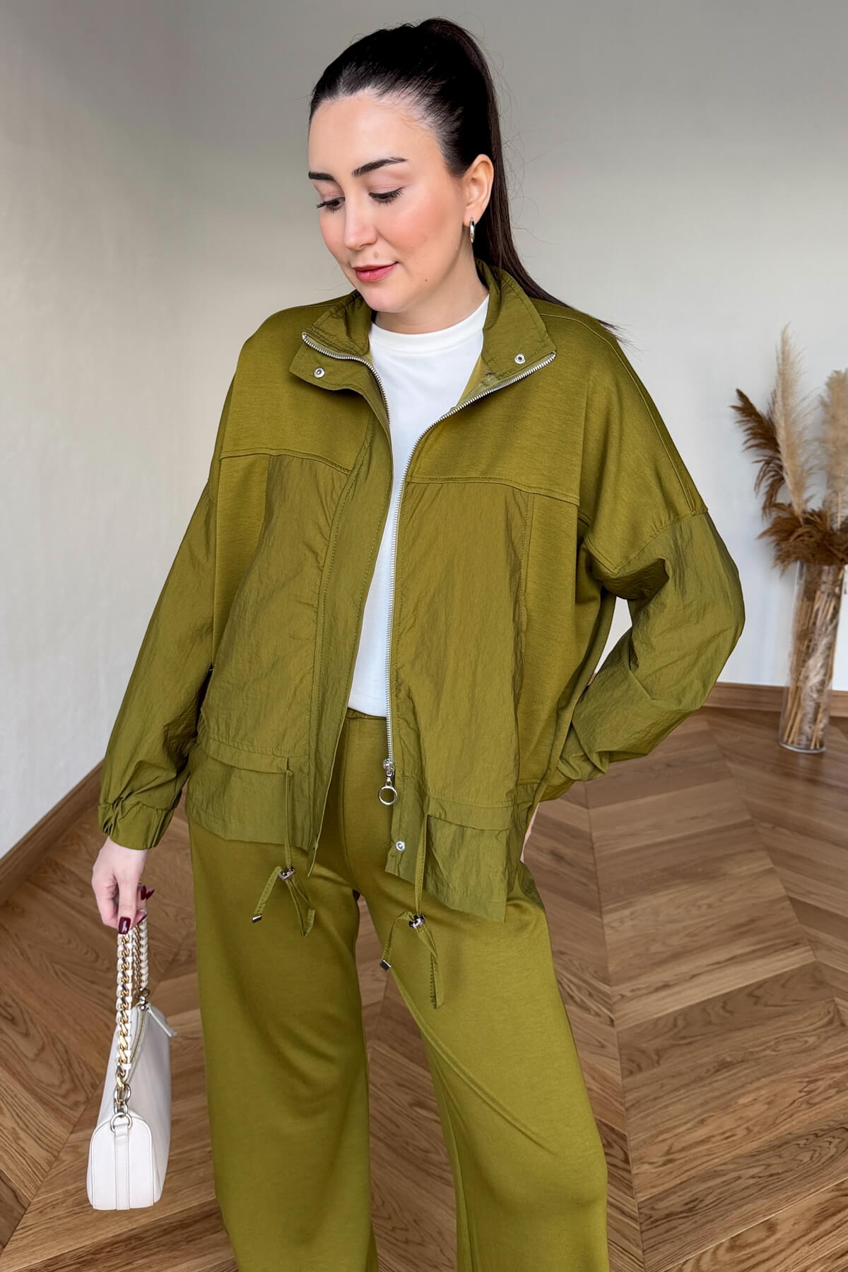 Paraşüt modal kumaşın hafifliği ve tok duruşu, 62 cm uzunluğundaki dik yakalı üst tasarımda modern bir form kazanıyor. Geniş cep detayları ve metal fermuarı tasarıma işlevsel bir şıklık katarken, 60 cm göğüs genişliği ile vücudu sıkmayan ferah bir kullanım sağlıyor. 110 cm boyundaki pantolonu ise silüetinizi uzun ve zarif göstererek takımı kusursuzca tamamlıyor.