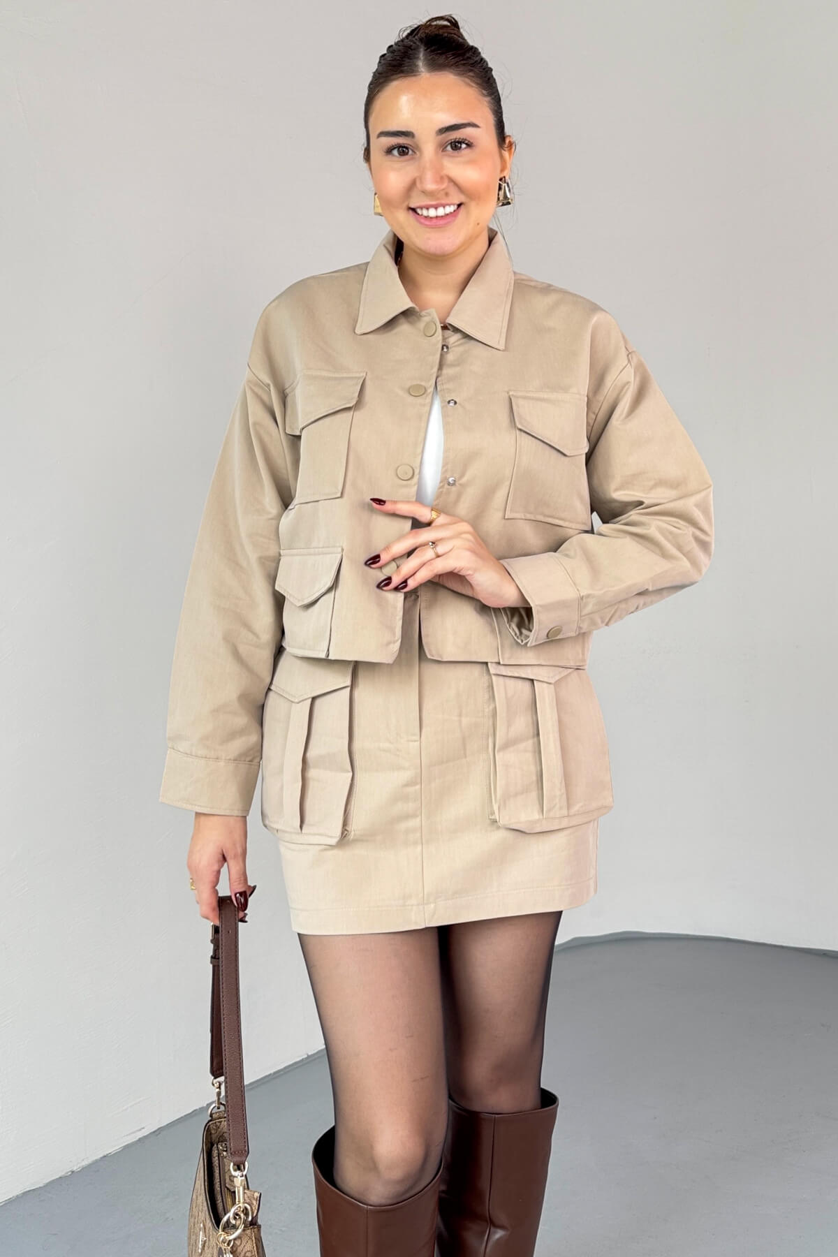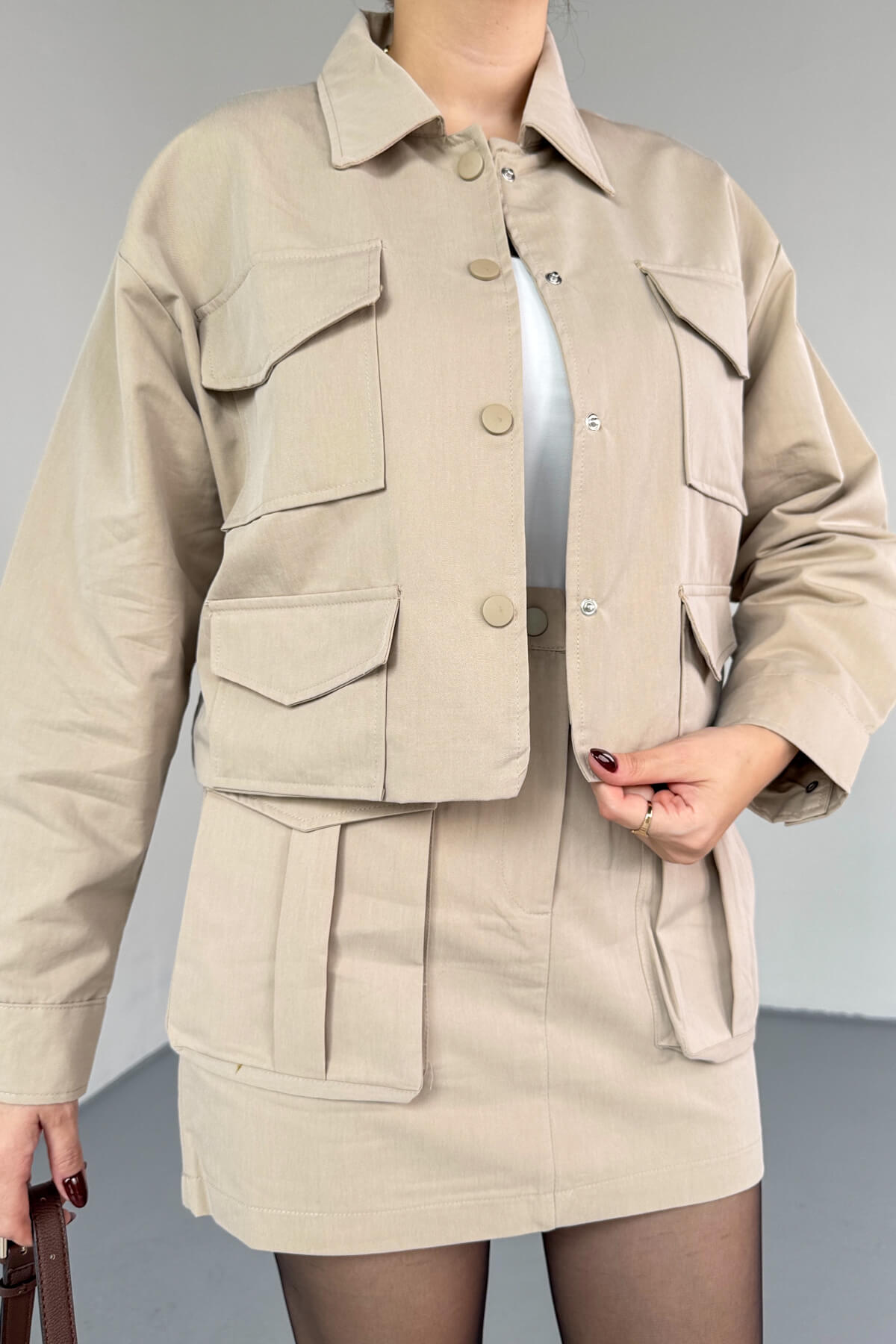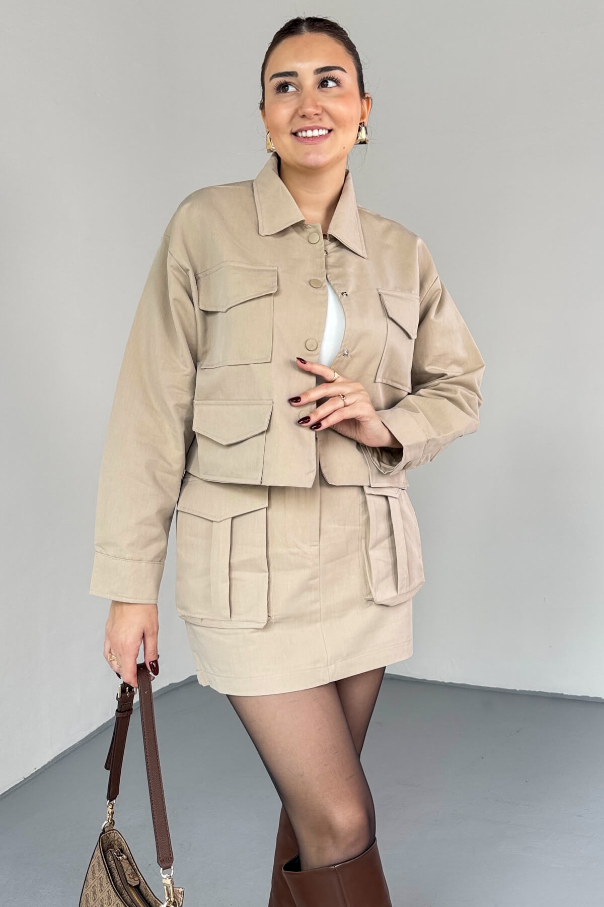 TKM-7168 Bej Astarlı Utility Ceket & Mini Etek İkili Takım