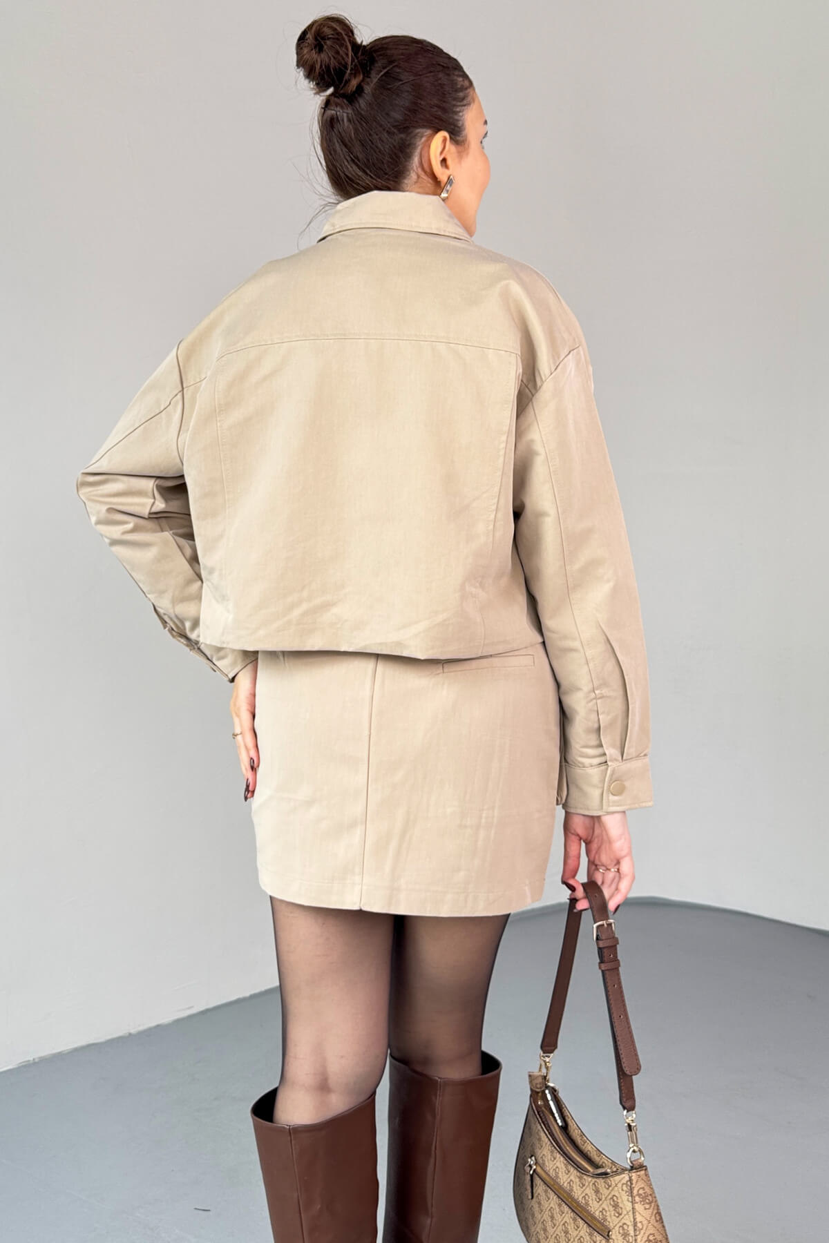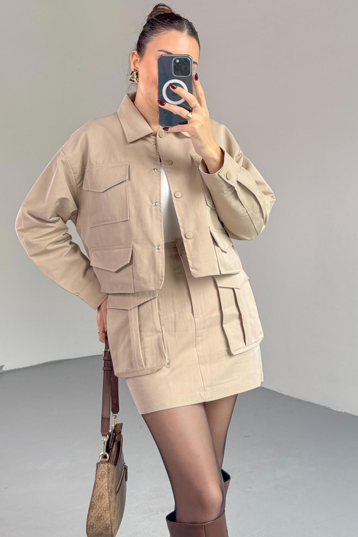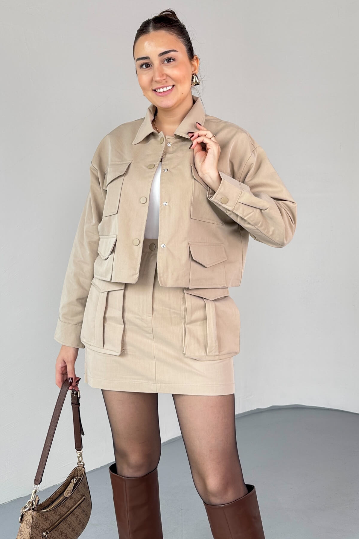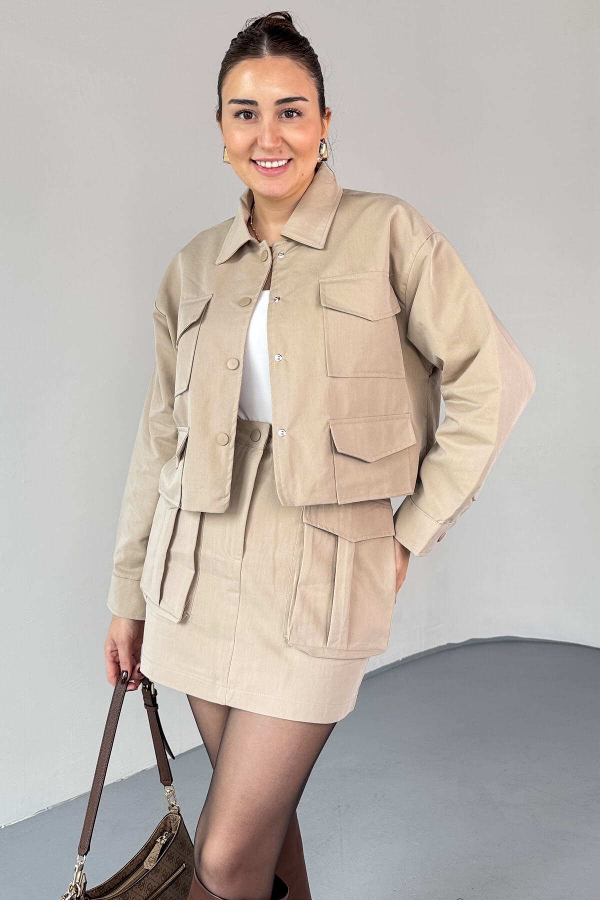 TKM-7168 Bej Astarlı Utility Ceket & Mini Etek İkili Takım