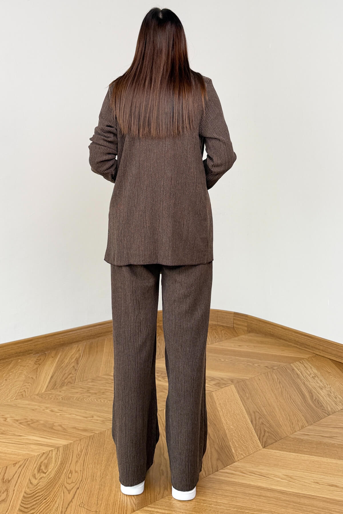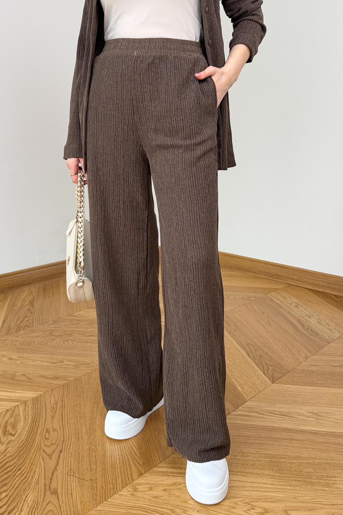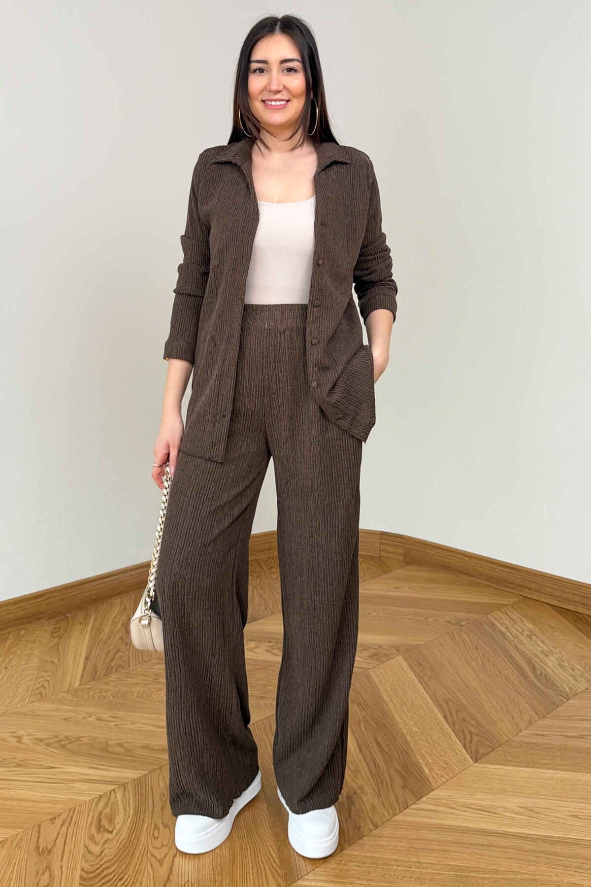 Bürümcük dokusunun sağladığı doğal ve eforsuz şıklığı modern bir kesimle buluşturan bu ikili takım, konforundan ödün vermeyen kadınların favorisi olacak. Fitilli yapısı sayesinde kumaşa derinlik katan bu tasarım, 53 cm boyundaki klasik gömlek yaka üst ve 107 cm boyundaki dökümlü pantolonuyla kusursuz bir silüet çiziyor. Akışkan ve hafif dokusuyla gün boyu hareket özgürlüğü sunarken, sofistike duruşuyla hem ev şıklığında hem de günlük dış mekan kombinlerinde kendinizi özel hissetmenizi sağlıyor.