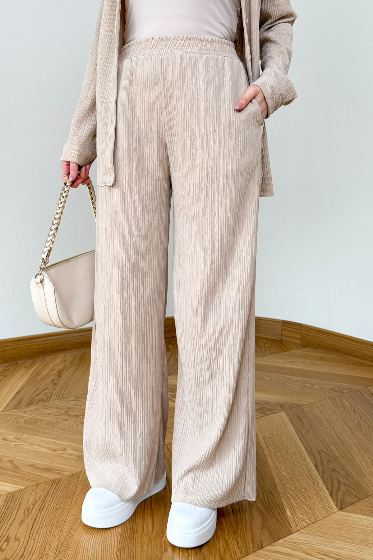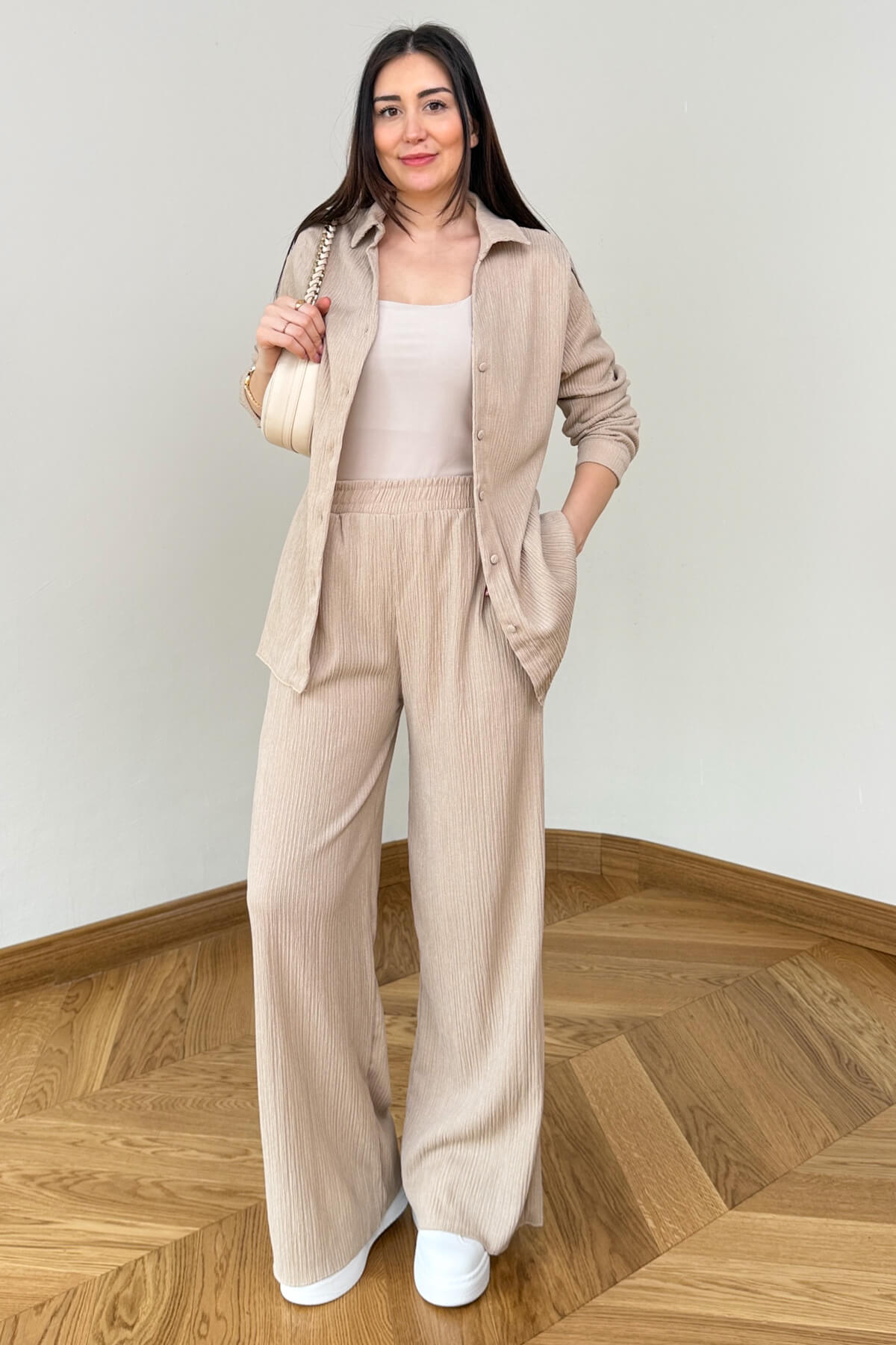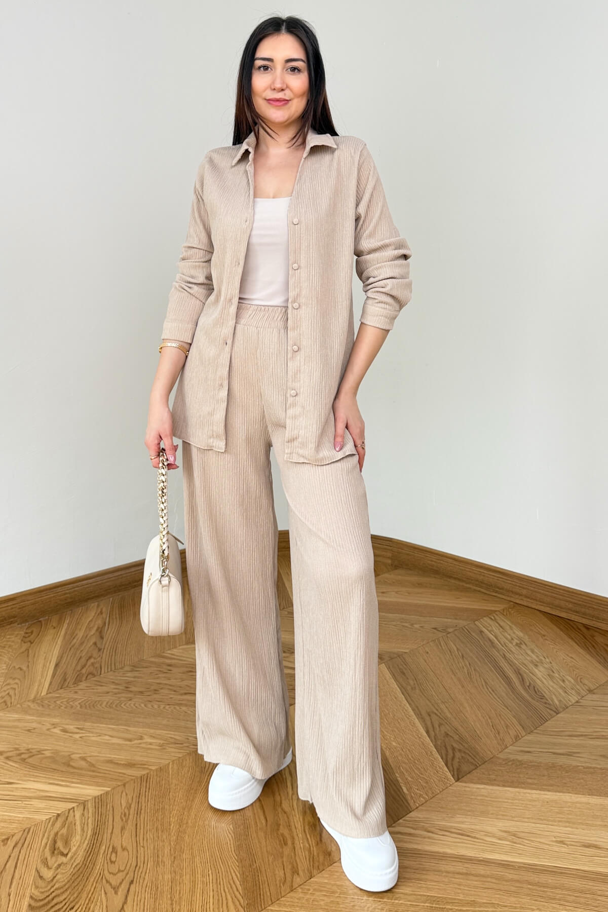 Bürümcük dokusunun sağladığı doğal ve eforsuz şıklığı modern bir kesimle buluşturan bu ikili takım, konforundan ödün vermeyen kadınların favorisi olacak. Fitilli yapısı sayesinde kumaşa derinlik katan bu tasarım, 53 cm boyundaki klasik gömlek yaka üst ve 107 cm boyundaki dökümlü pantolonuyla kusursuz bir silüet çiziyor. Akışkan ve hafif dokusuyla gün boyu hareket özgürlüğü sunarken, sofistike duruşuyla hem ev şıklığında hem de günlük dış mekan kombinlerinde kendinizi özel hissetmenizi sağlıyor.