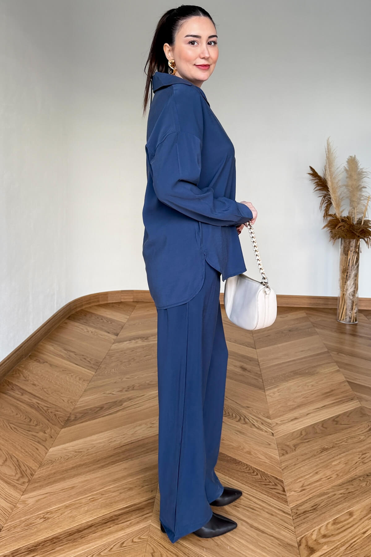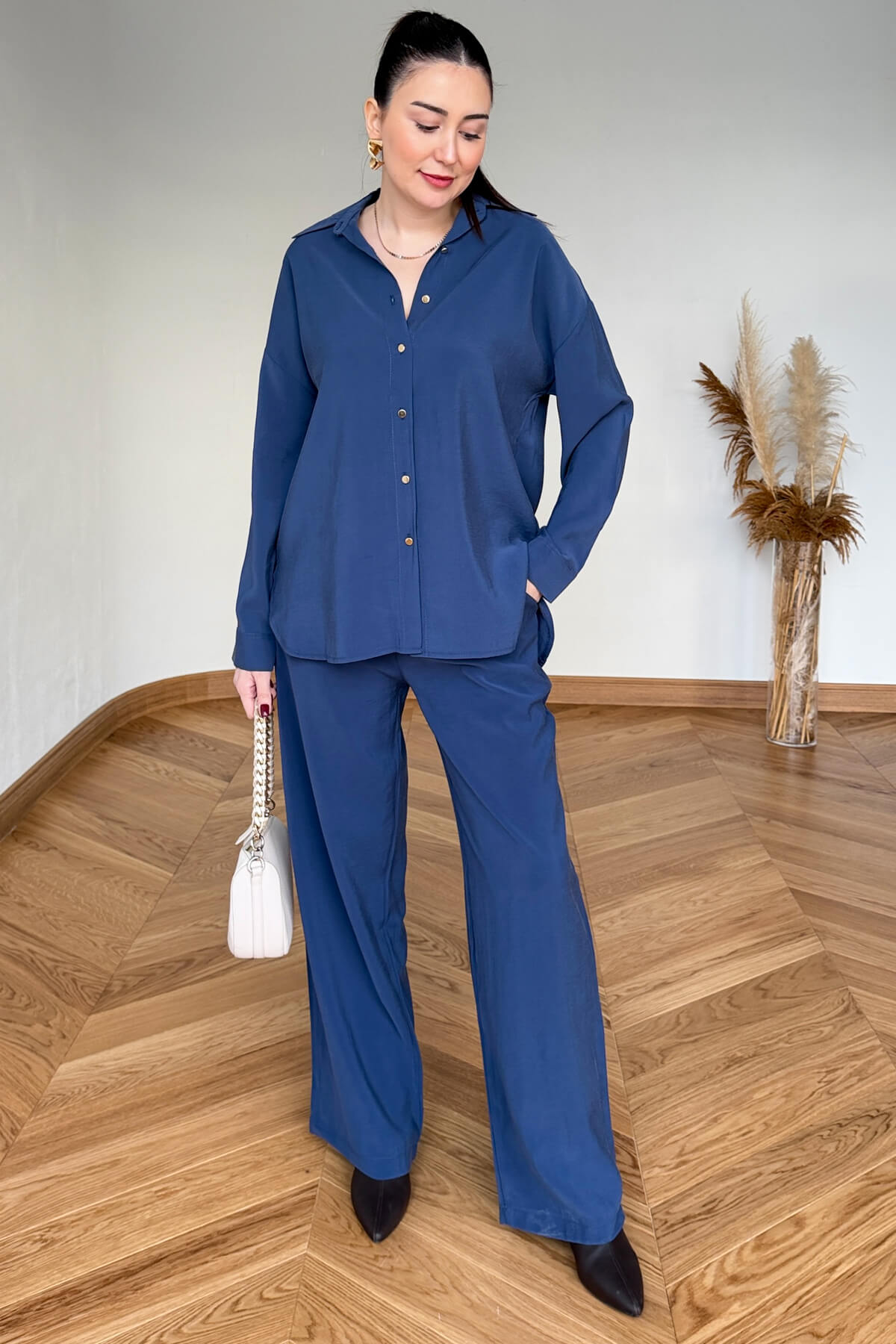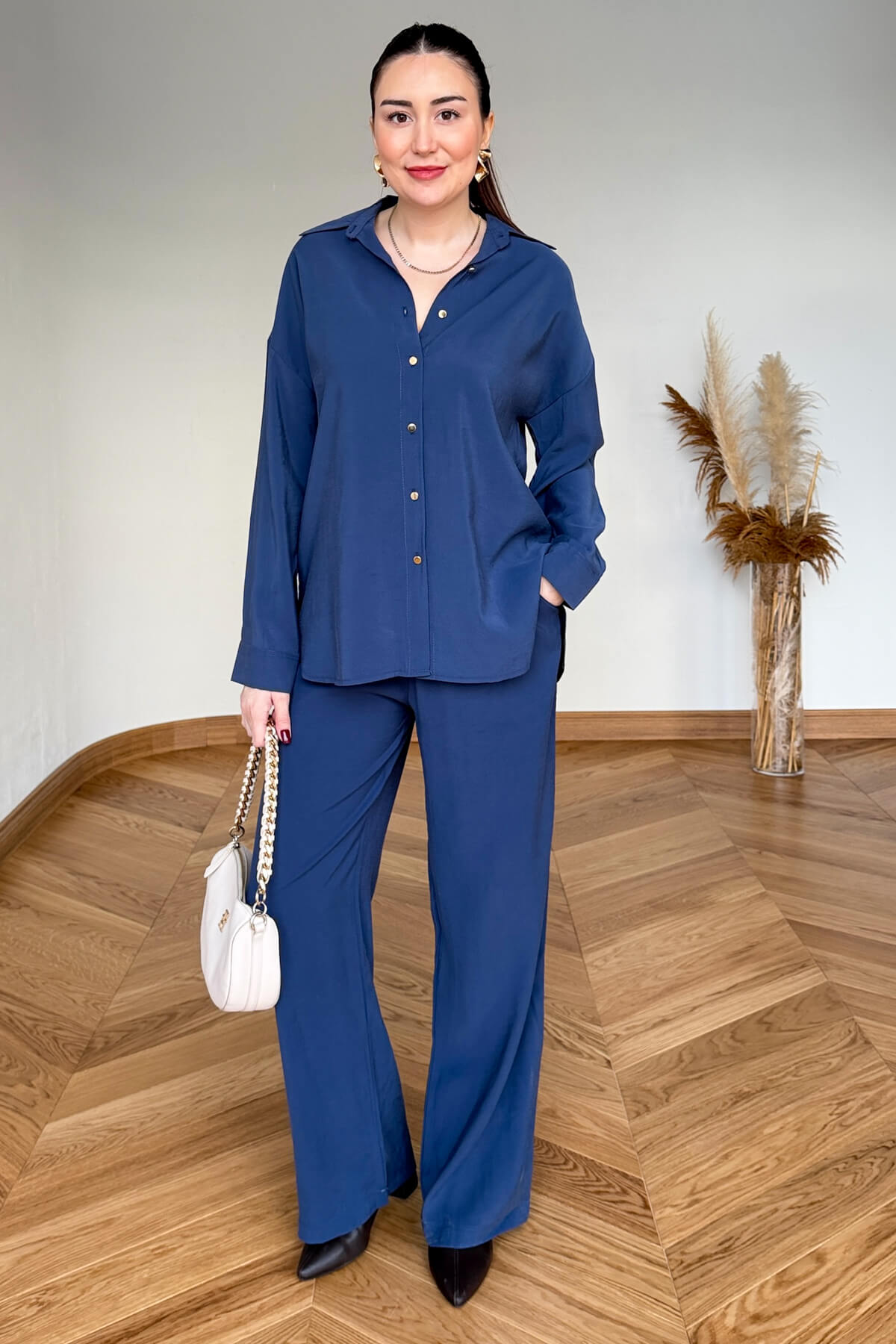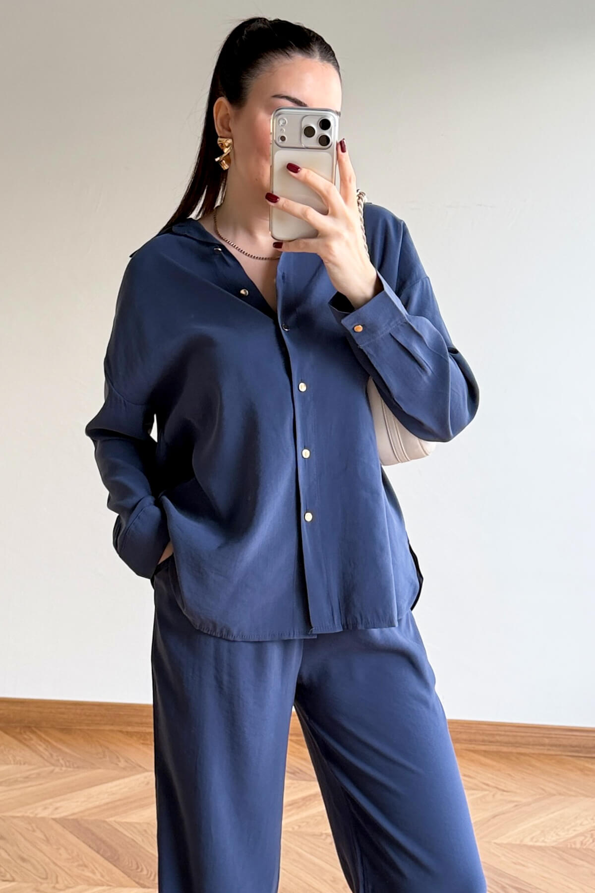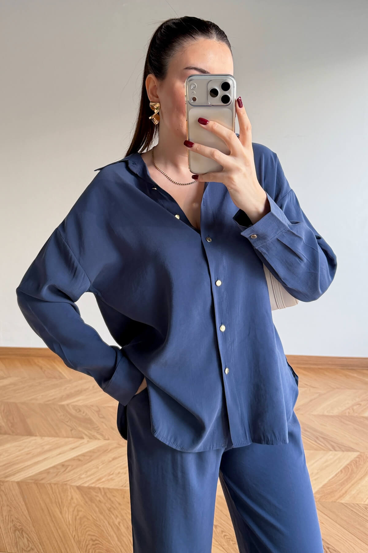 İthal modal kumaşın ipeksi yumuşaklığını ve akışkan dokusunu teninizde hissedeceğiniz bu ikili takım, konforu lüks detaylarla buluşturuyor. Oversize kalıbın sunduğu modern ve salaş silüet, ön hattı boyunca uzanan gold düğme işlemeleriyle sofistike bir karaktere bürünüyor. Hem gömlekteki fonksiyonel cep detayları hem de rahat kesimiyle gün boyu hareket özgürlüğü sunan bu takım, zahmetsiz şıklığı arayanlar için kusursuz bir tercih.