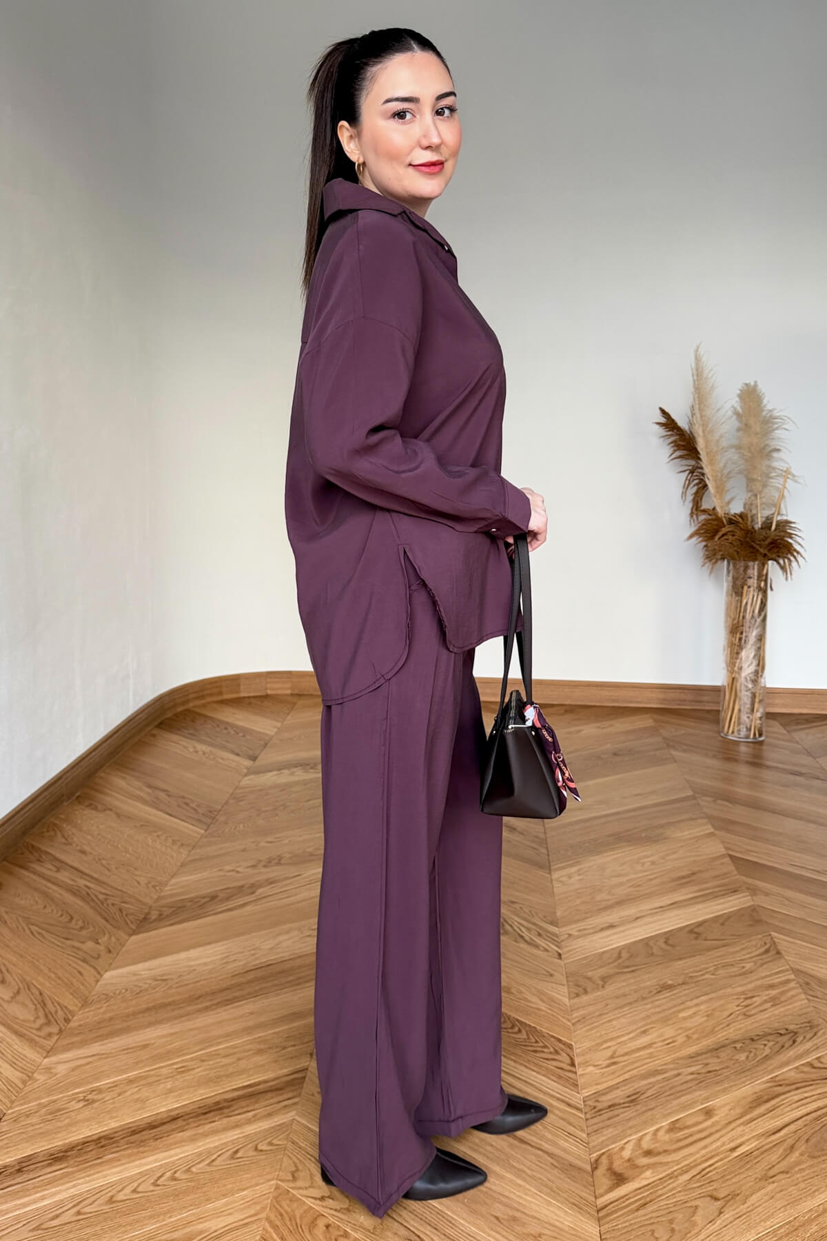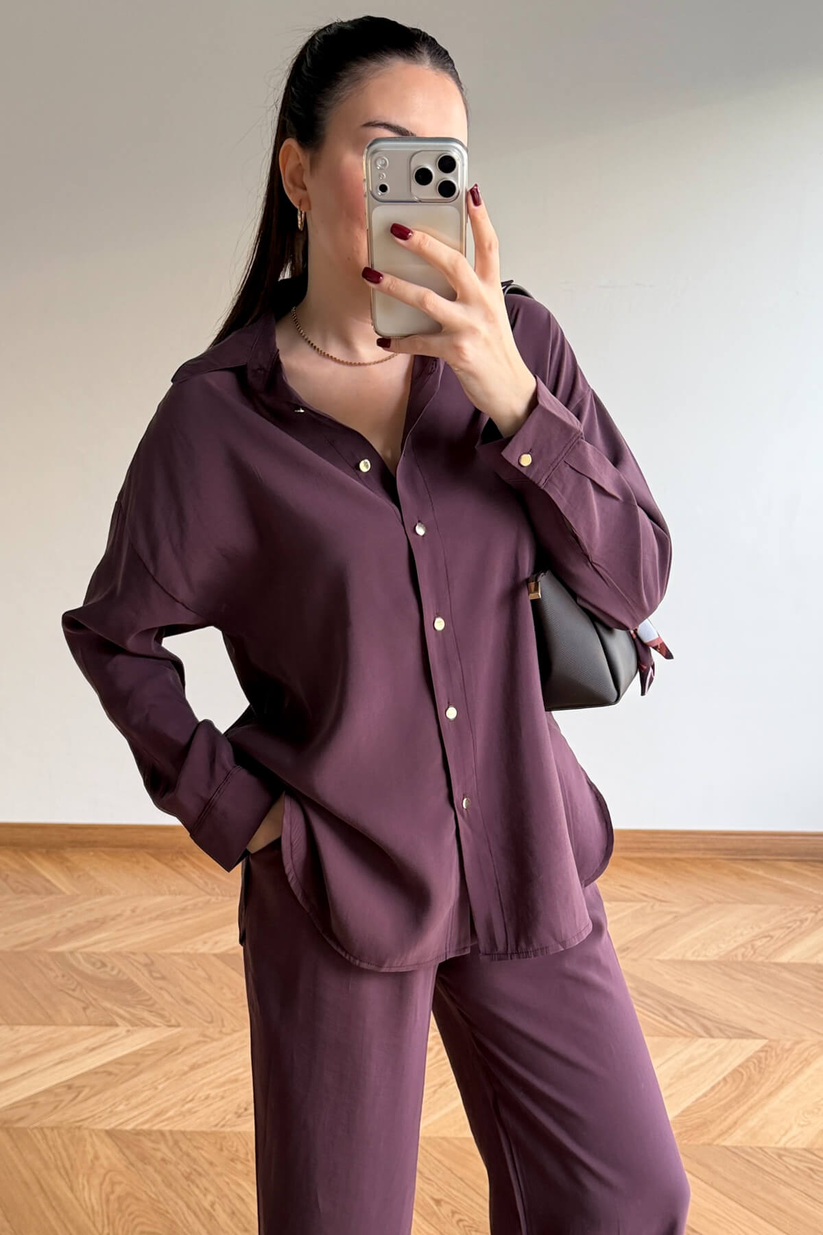 İthal modal kumaşın ipeksi yumuşaklığını ve akışkan dokusunu teninizde hissedeceğiniz bu ikili takım, konforu lüks detaylarla buluşturuyor. Oversize kalıbın sunduğu modern ve salaş silüet, ön hattı boyunca uzanan gold düğme işlemeleriyle sofistike bir karaktere bürünüyor. Hem gömlekteki fonksiyonel cep detayları hem de rahat kesimiyle gün boyu hareket özgürlüğü sunan bu takım, zahmetsiz şıklığı arayanlar için kusursuz bir tercih.