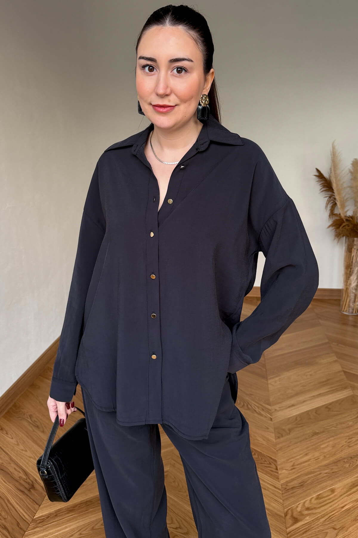 İthal modal kumaşın ipeksi yumuşaklığını ve akışkan dokusunu teninizde hissedeceğiniz bu ikili takım, konforu lüks detaylarla buluşturuyor. Oversize kalıbın sunduğu modern ve salaş silüet, ön hattı boyunca uzanan gold düğme işlemeleriyle sofistike bir karaktere bürünüyor. Hem gömlekteki fonksiyonel cep detayları hem de rahat kesimiyle gün boyu hareket özgürlüğü sunan bu takım, zahmetsiz şıklığı arayanlar için kusursuz bir tercih.