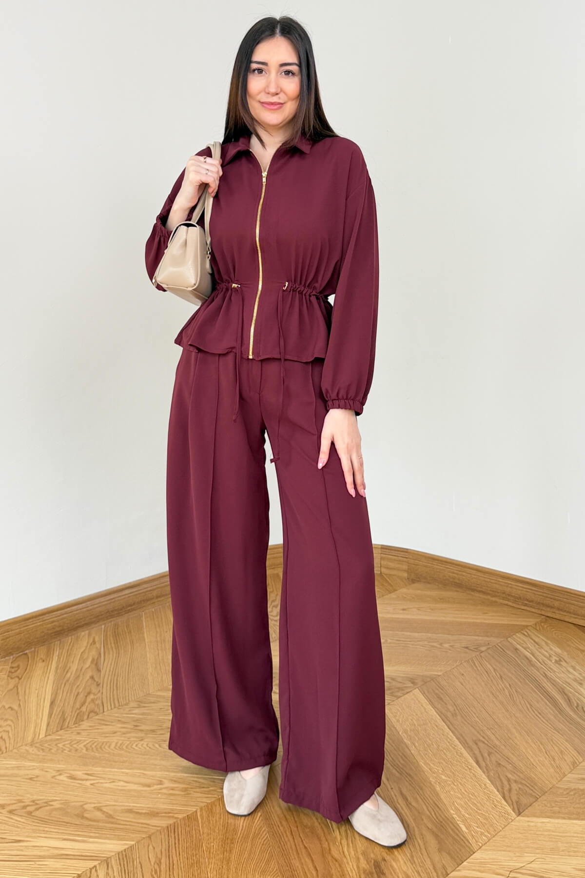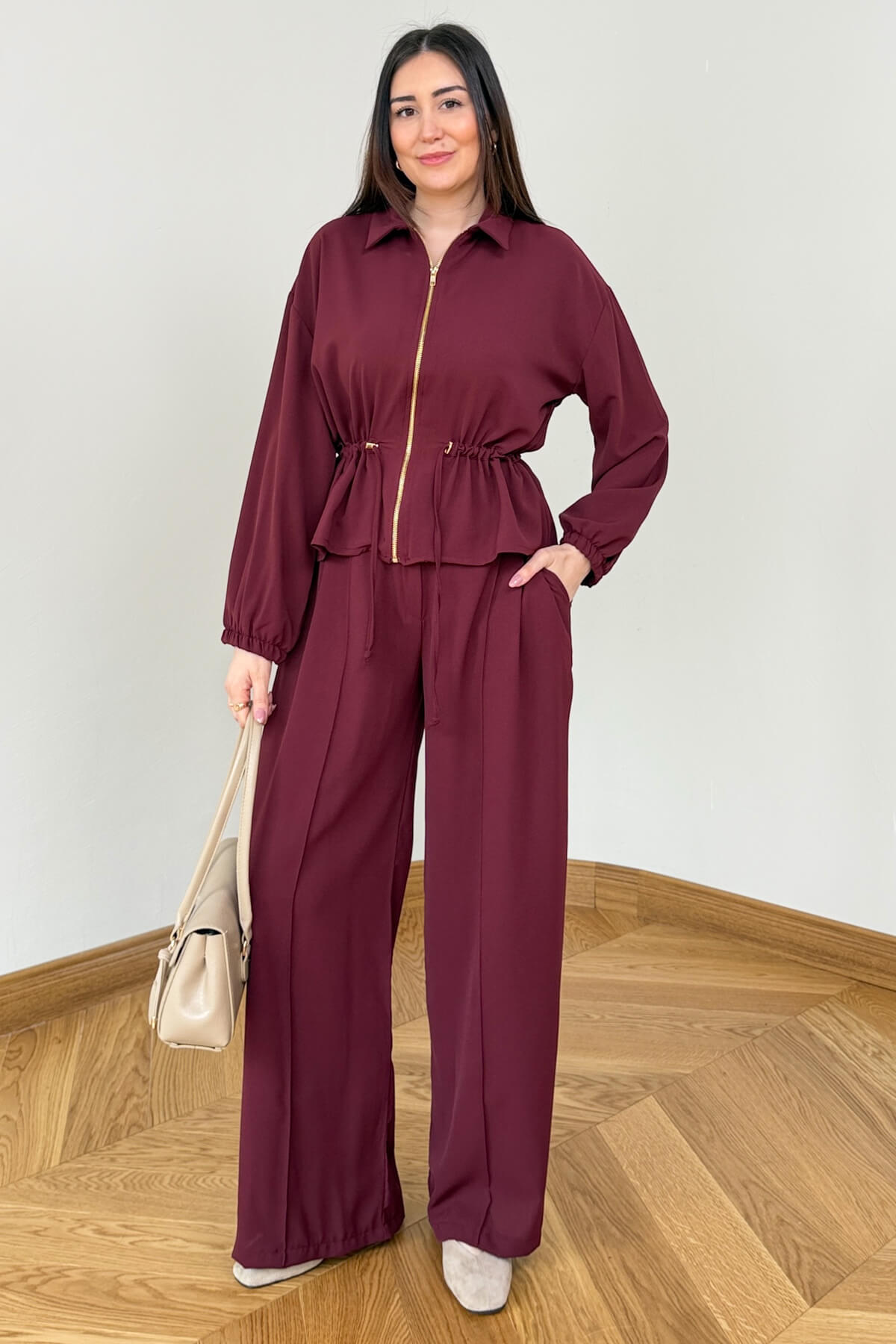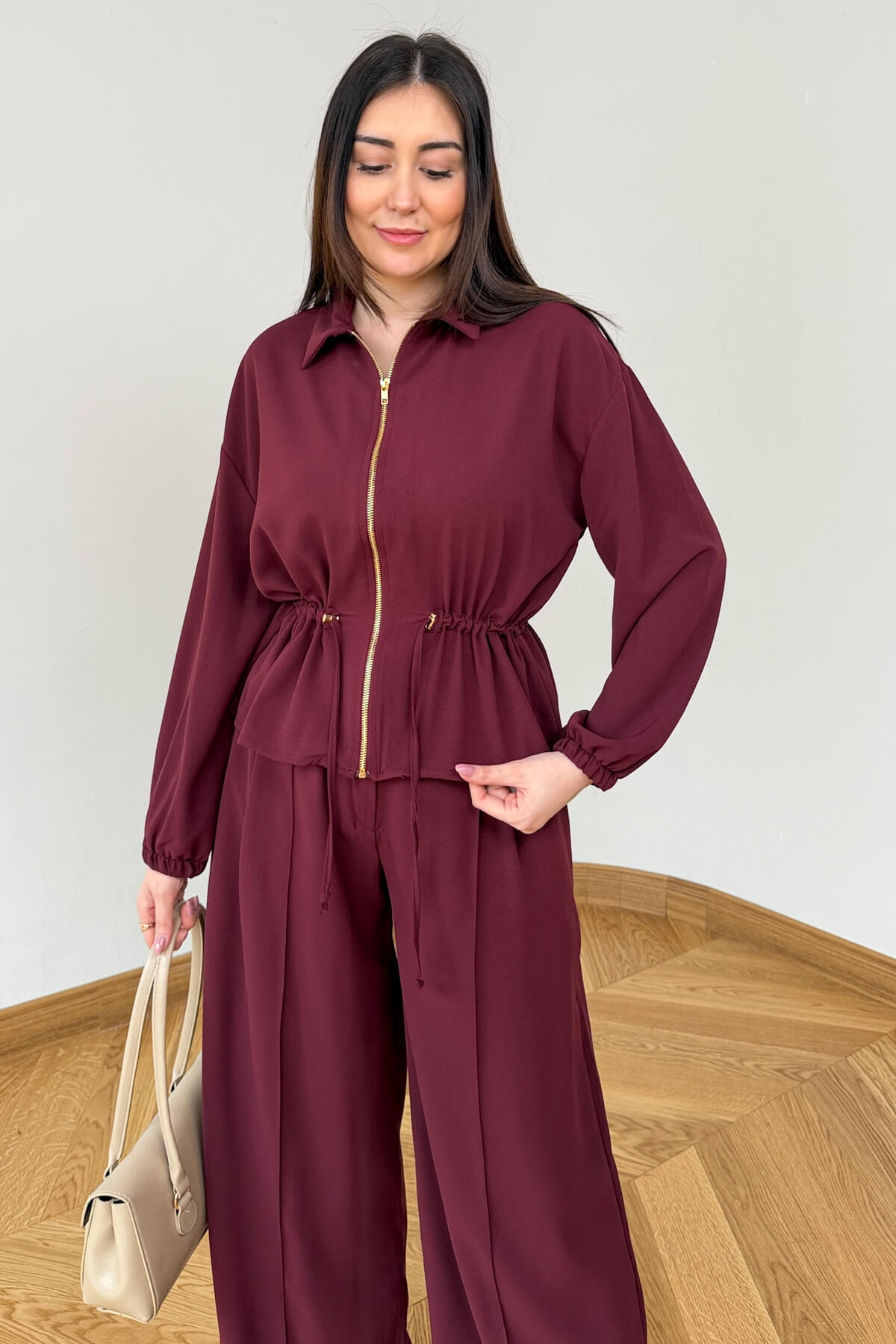 Tasarım Detayı: Üst parçada tam boy metal fermuar, ayarlanabilir bel büzgü kordonu ve pantolonda bilek lastikleri.