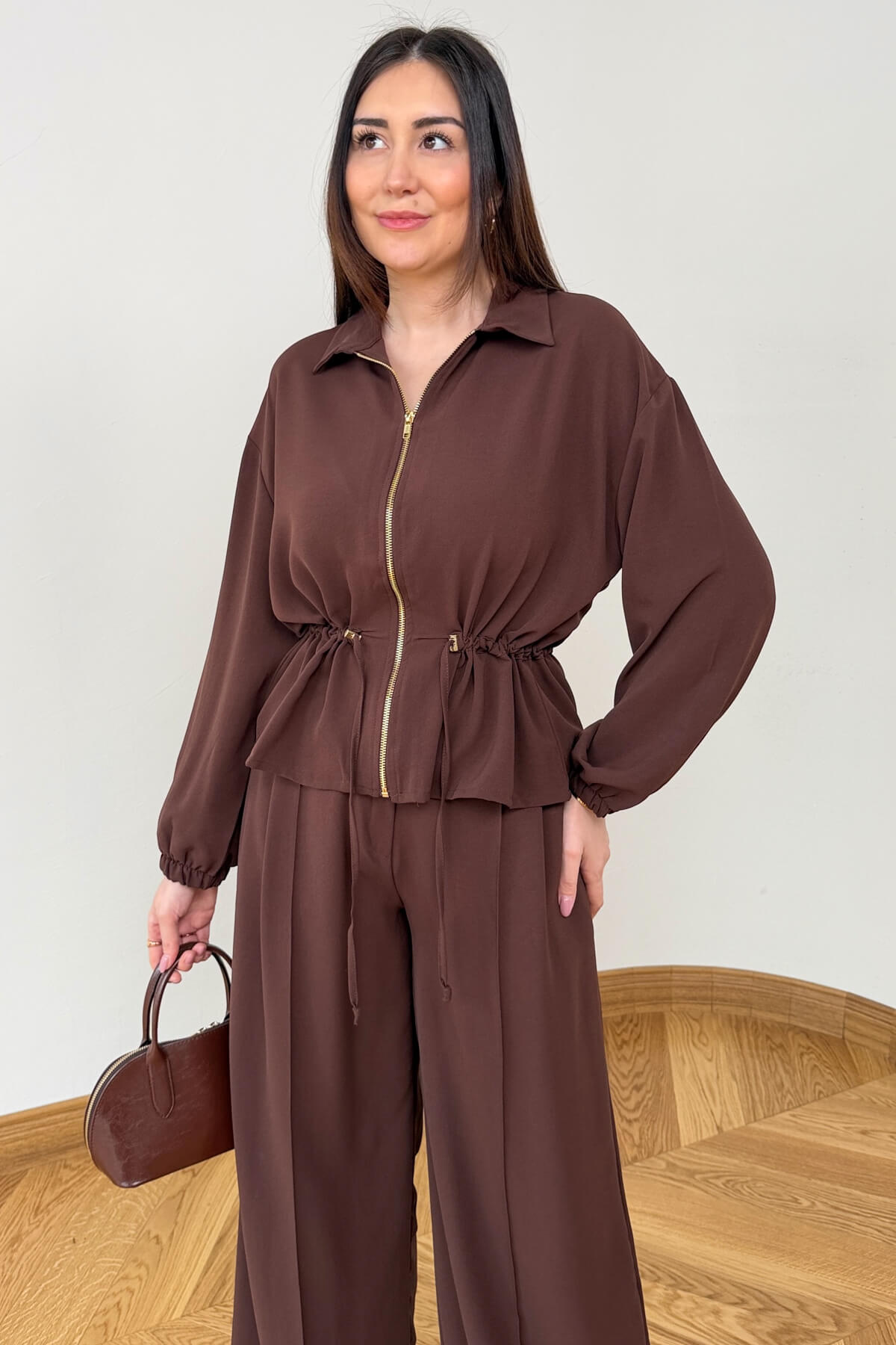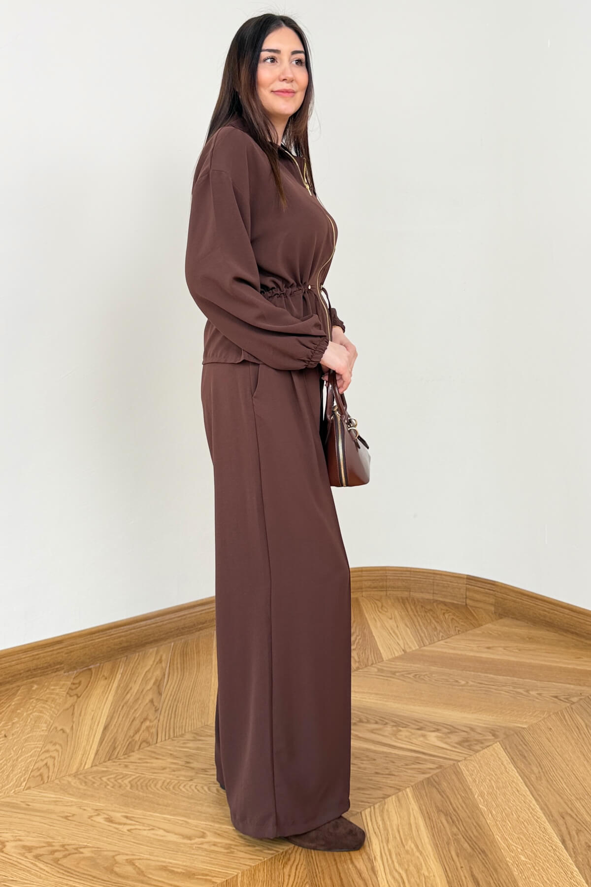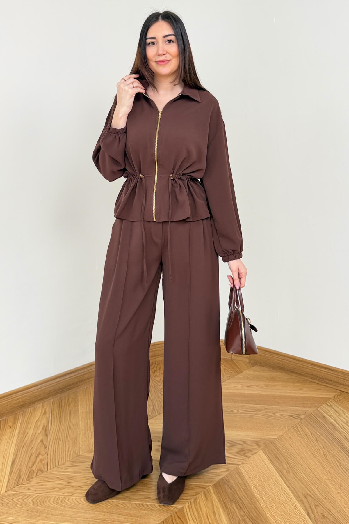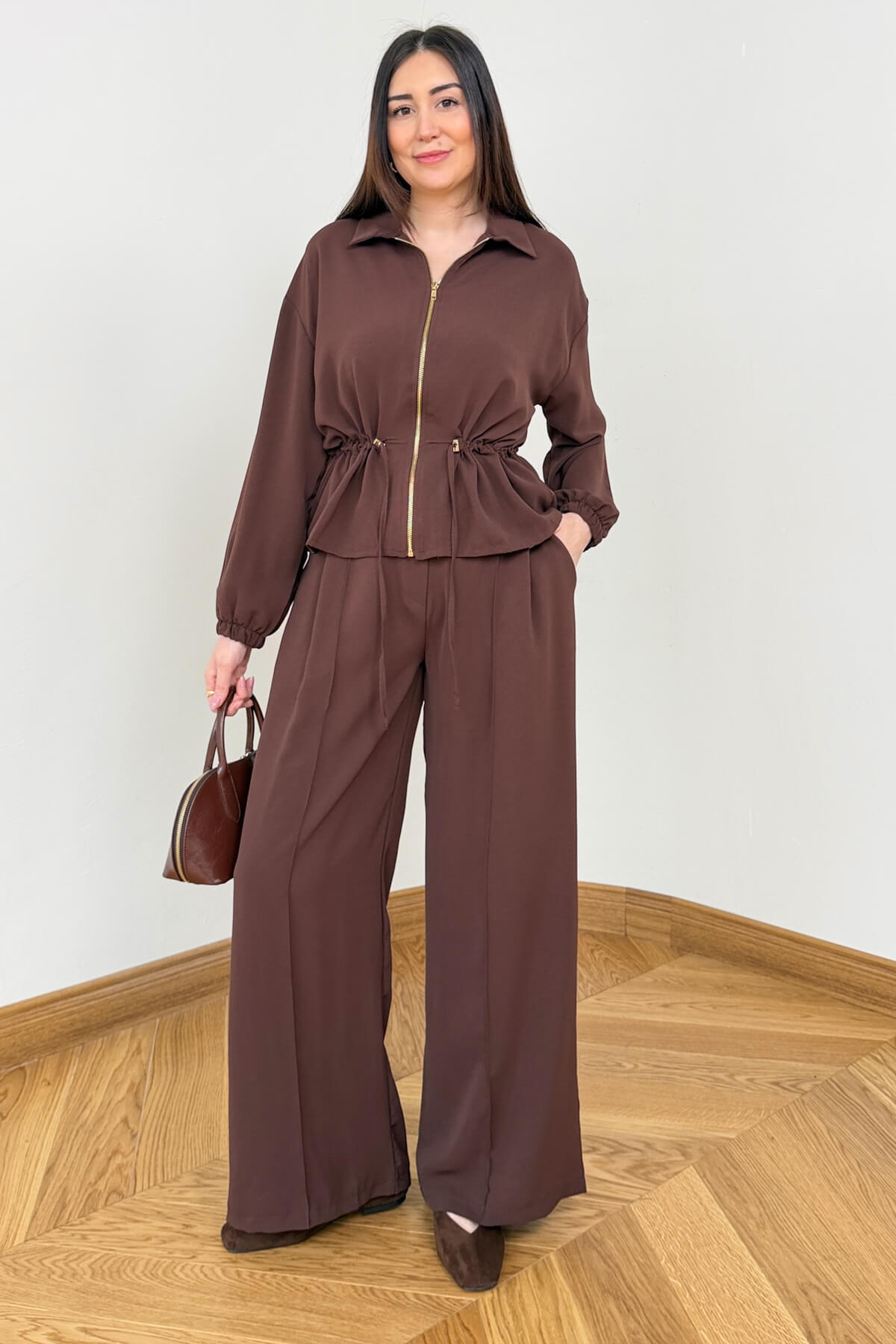 Poliviskon kumaşın sunduğu konforlu dokuyu modern ve sportif bir tasarımla buluşturan bu ikili takım, günlük stilinize dinamik bir soluk getiriyor. Üst parçada yer alan tam boy fermuar ve ayarlanabilir bel büzgüsü, silüetinizi dilediğiniz gibi formize etmenize olanak tanırken; 102 cm boyundaki rahat kesim pantolon, fonksiyonel cep detaylarıyla kullanım kolaylığı sunuyor. Bileklerdeki lastik detayı ve 58 cm boyundaki şık üst tasarımıyla hem ev konforunda hem de dışarıda eforsuz bir şıklık vadediyor.
