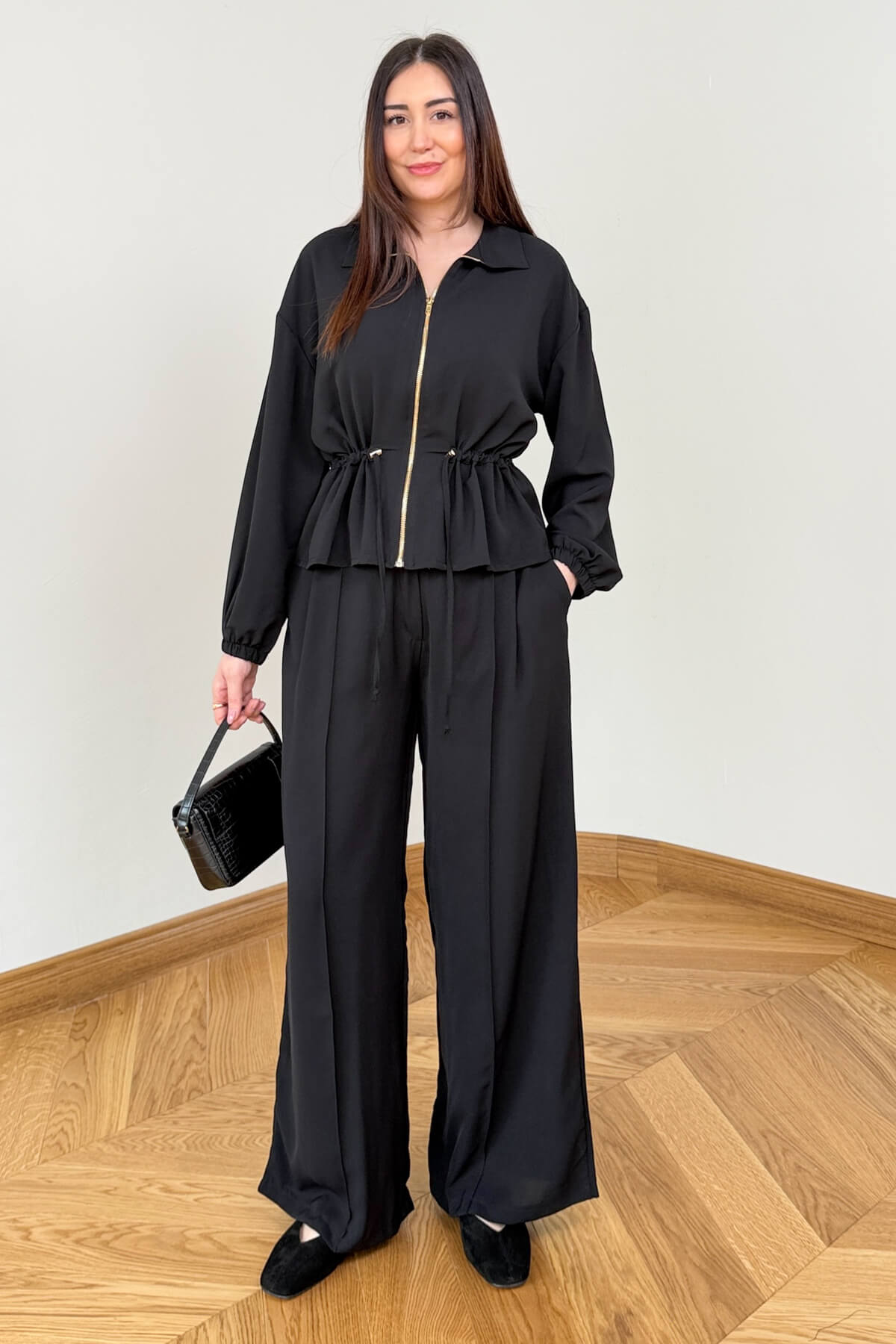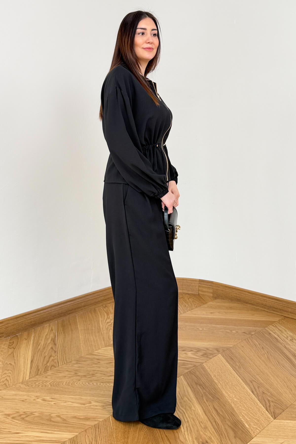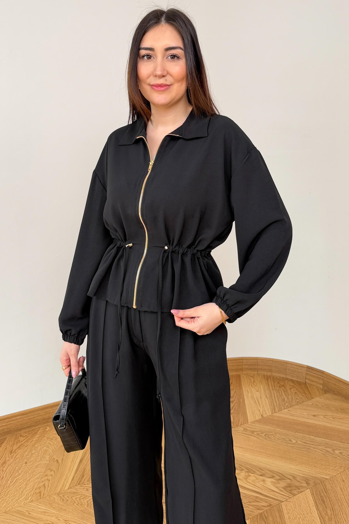 Tasarım Detayı: Üst parçada tam boy metal fermuar, ayarlanabilir bel büzgü kordonu ve pantolonda bilek lastikleri.