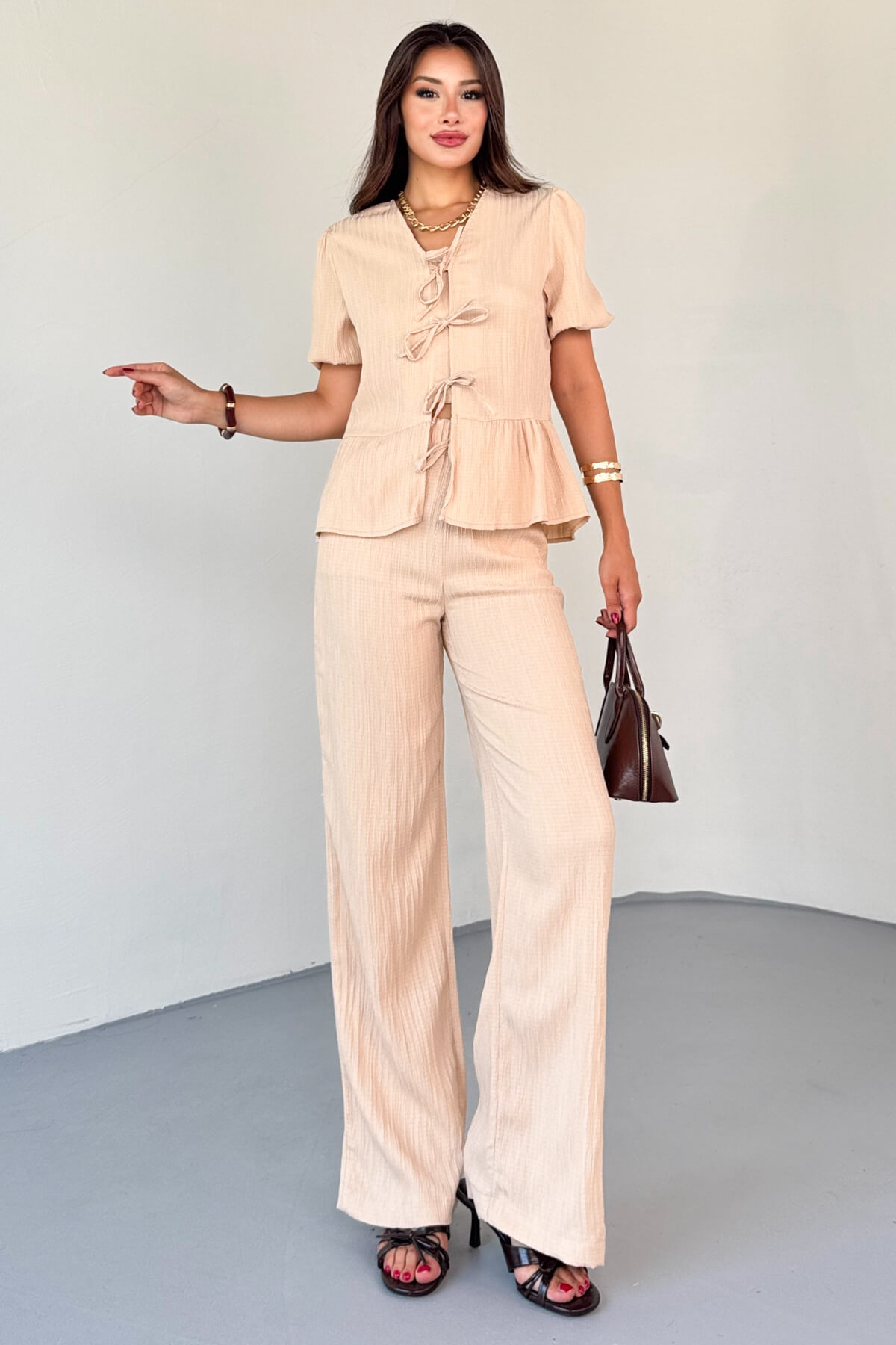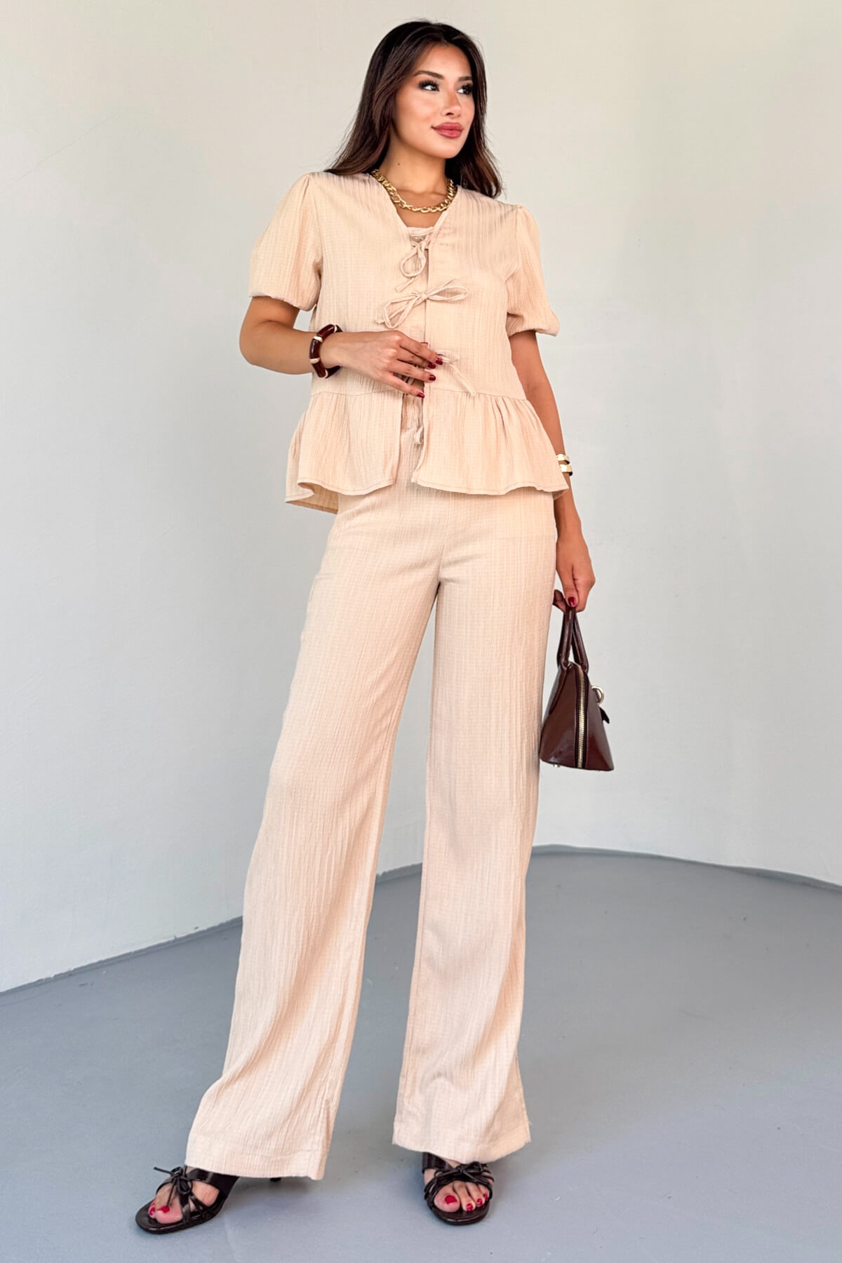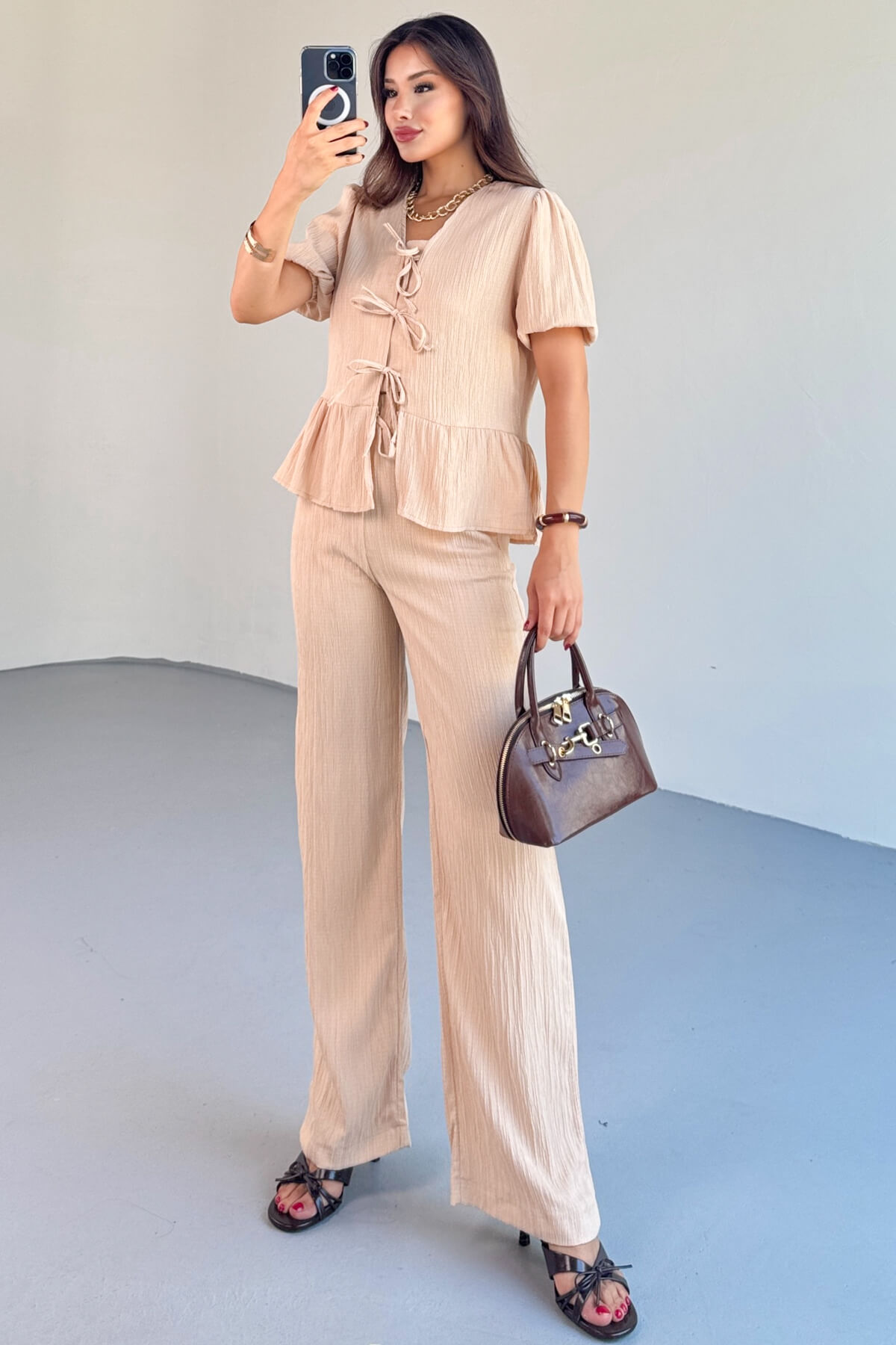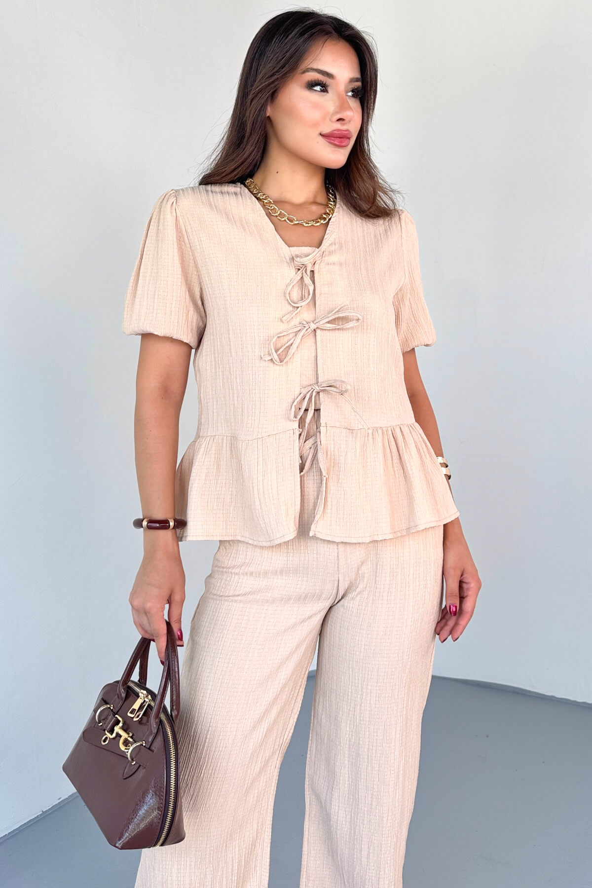 Lastik detaylı kısa kol bluz, fırfırlı etek ucu ve ön bağlama detayı ile şıklık katıyor