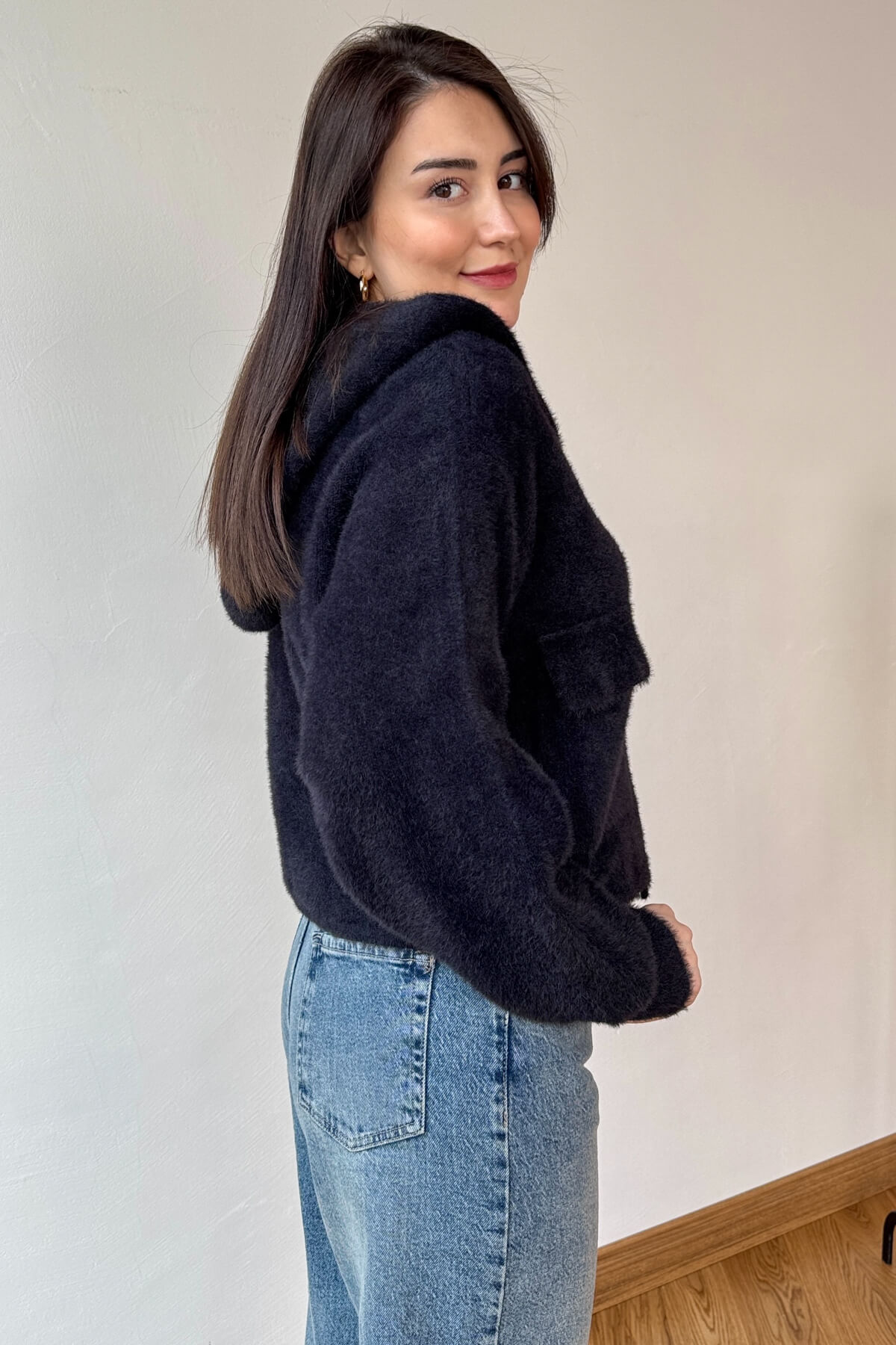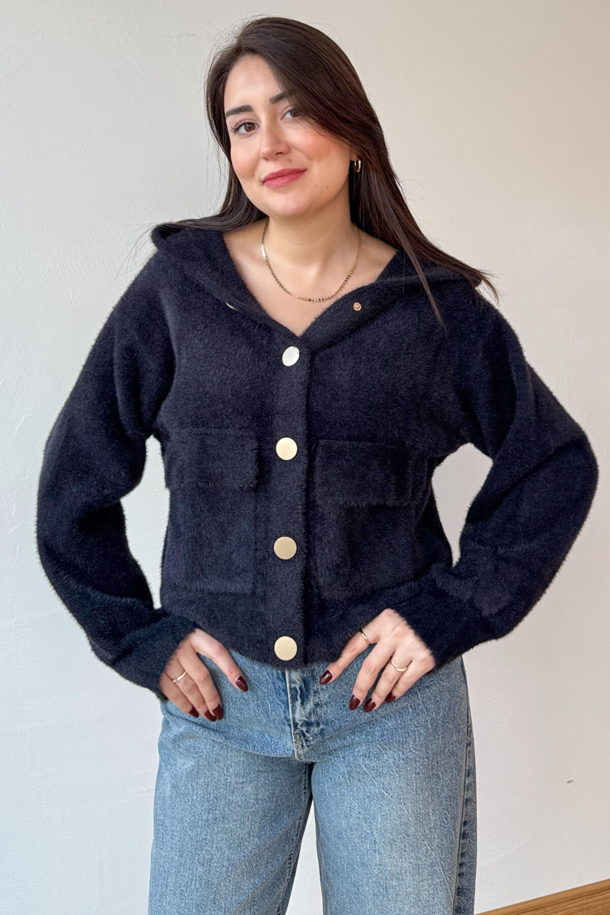 TRK-1232 Siyah Kapüşonlu Sakallı Örme Çıtçıtlı Triko Hırka