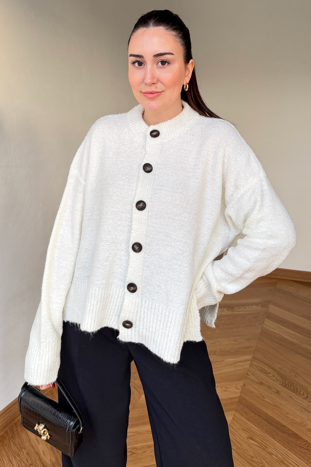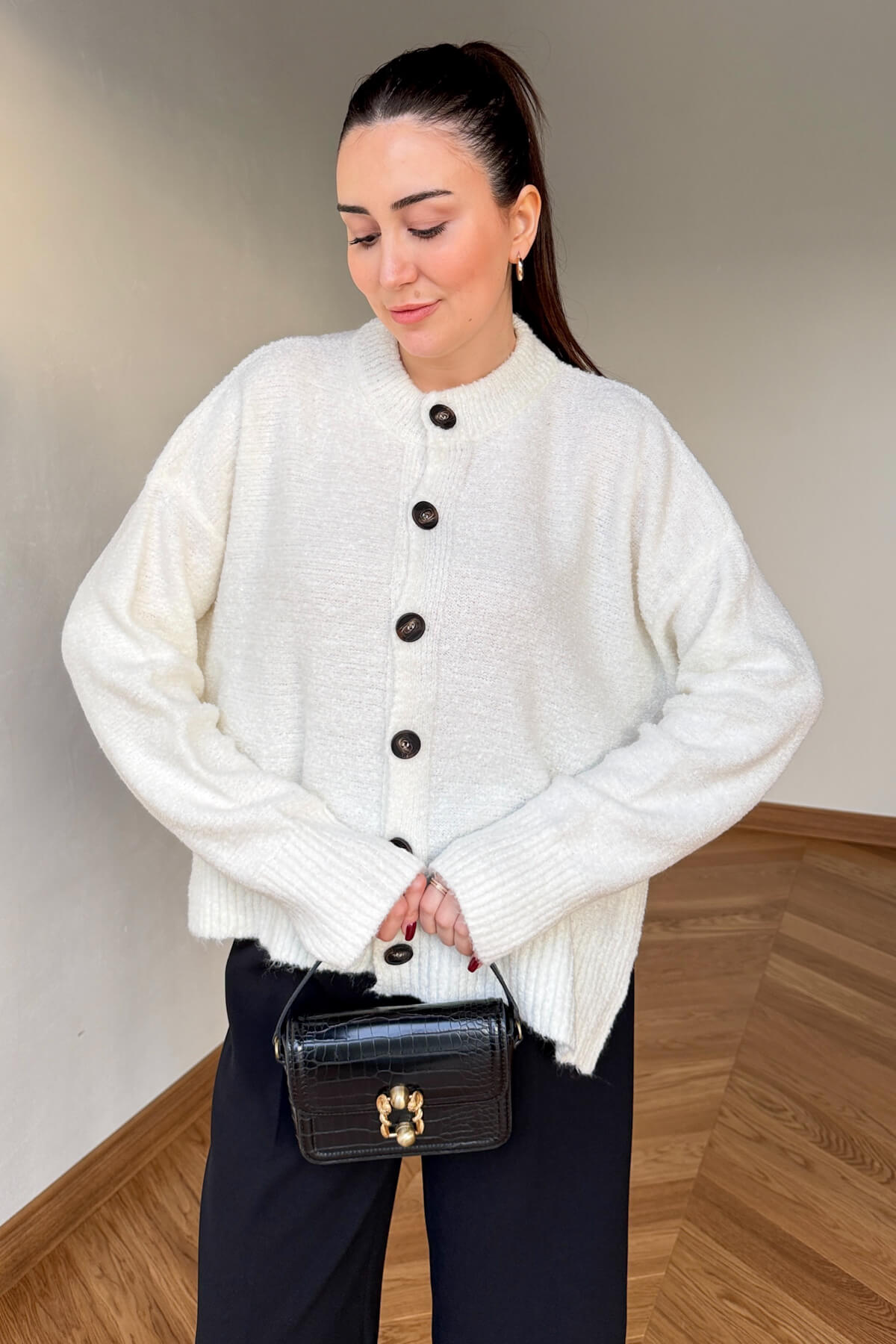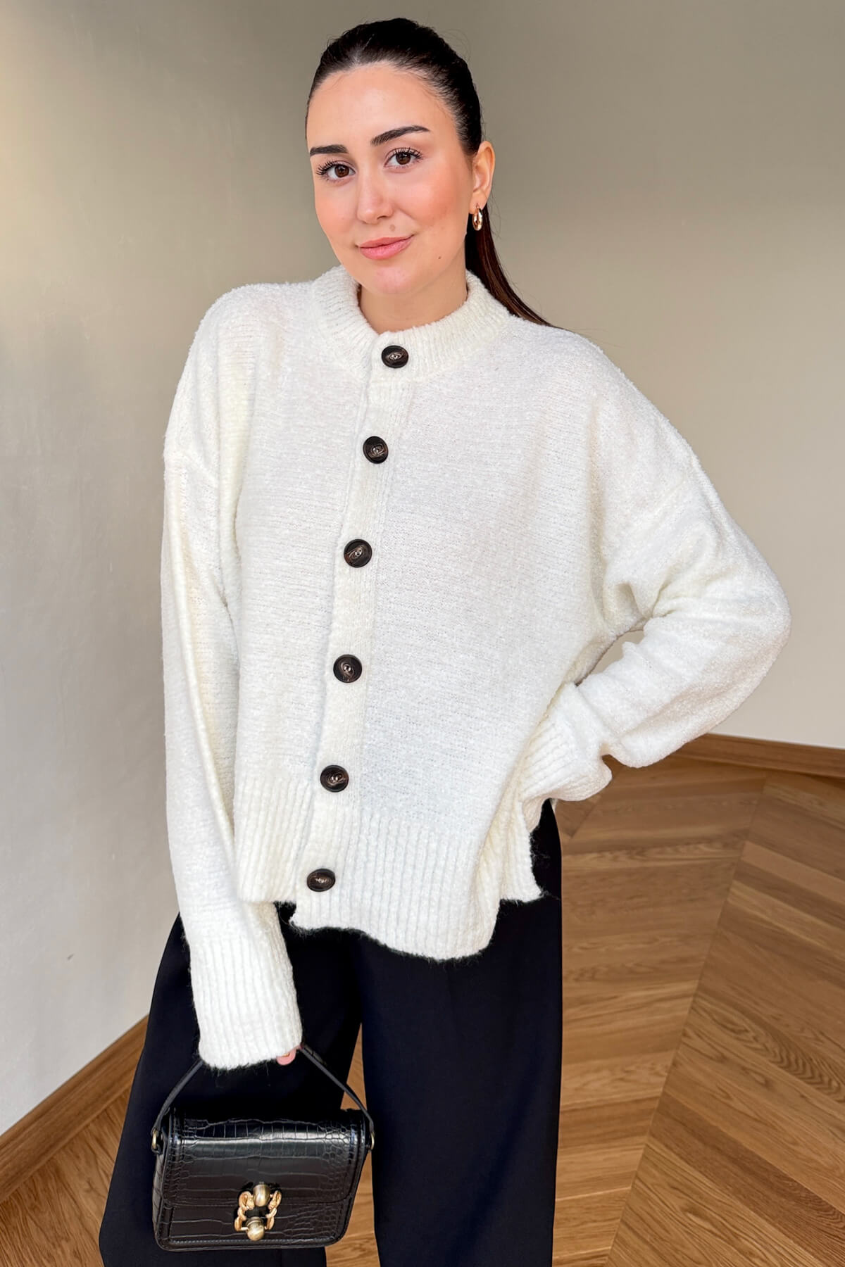 Buklet dokunun karakteristik kıvırcık yüzeyi ve yumuşak tuşesi, bu tasarım hırkada modern bir stil ikonuna dönüşüyor. Ön cepheyi süsleyen iddialı büyük düğmeleri, sadeliğe hareket katan en çarpıcı detay olarak öne çıkıyor. 54 cm’lik ideal bel hizası boyu, özellikle yüksek bel pantolon ve eteklerle kusursuz bir uyum yakalayarak bacak boyunuzu olduğundan uzun gösterir. Serin havalarda hem sıcak tutan yapısı hem de "cool" duruşuyla gardırobunuzun favorisi olacak.