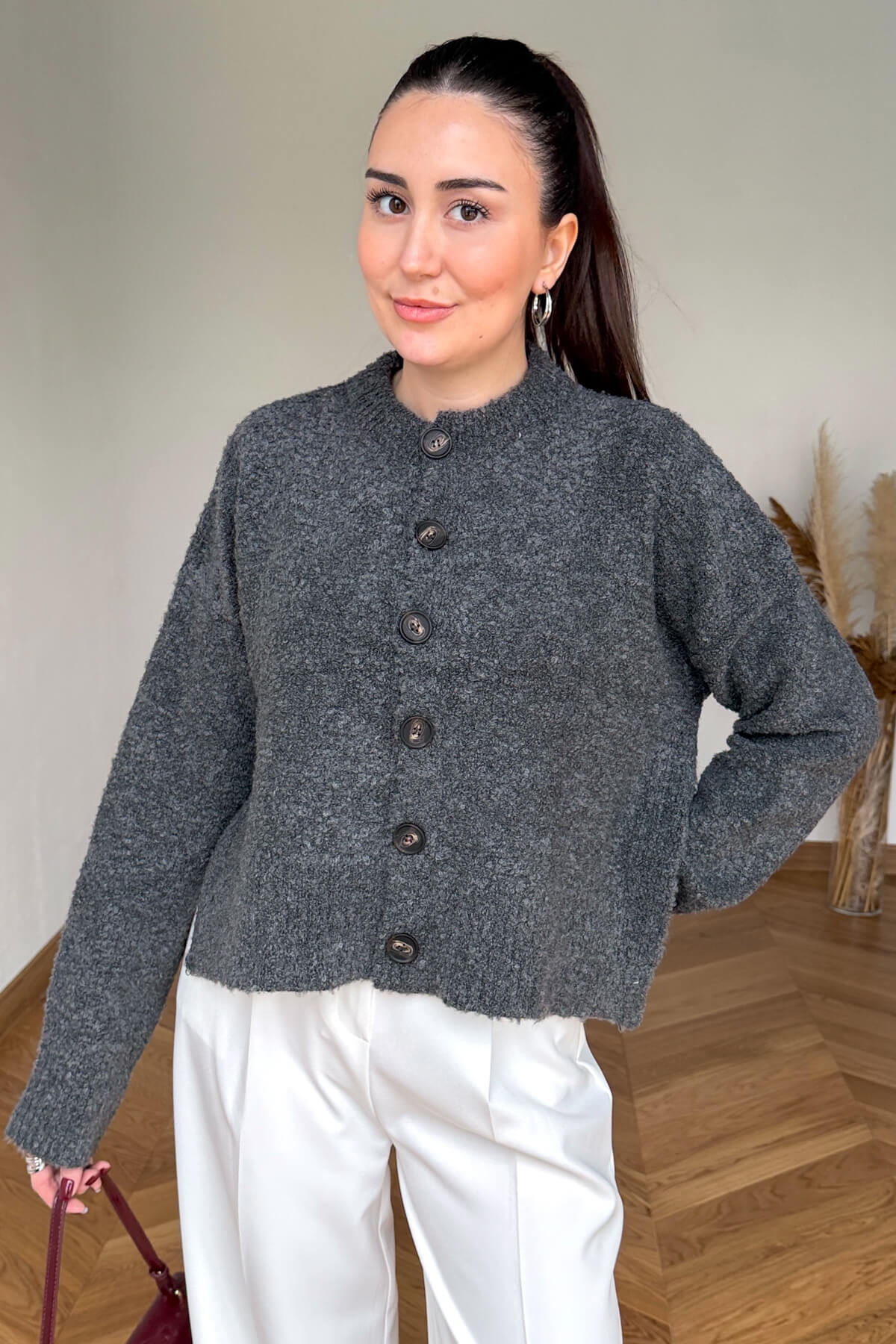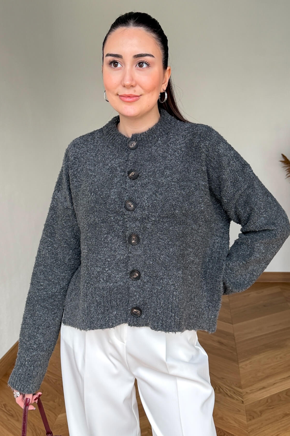 Buklet dokunun karakteristik kıvırcık yüzeyi ve yumuşak tuşesi, bu tasarım hırkada modern bir stil ikonuna dönüşüyor. Ön cepheyi süsleyen iddialı büyük düğmeleri, sadeliğe hareket katan en çarpıcı detay olarak öne çıkıyor. 54 cm’lik ideal bel hizası boyu, özellikle yüksek bel pantolon ve eteklerle kusursuz bir uyum yakalayarak bacak boyunuzu olduğundan uzun gösterir. Serin havalarda hem sıcak tutan yapısı hem de "cool" duruşuyla gardırobunuzun favorisi olacak.