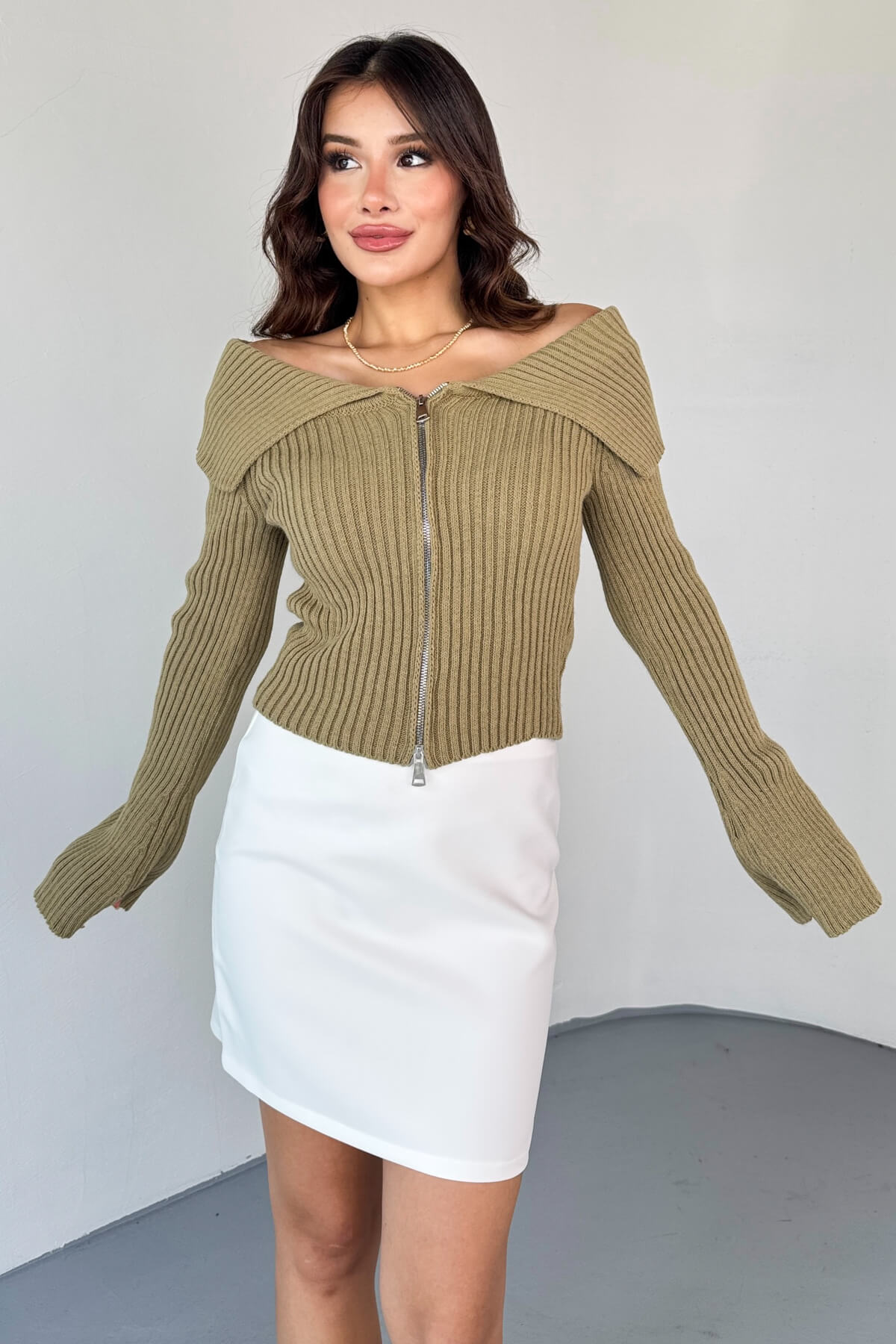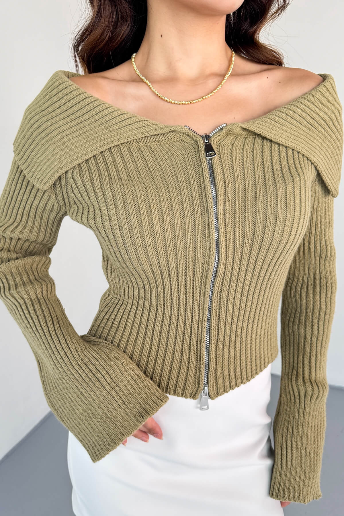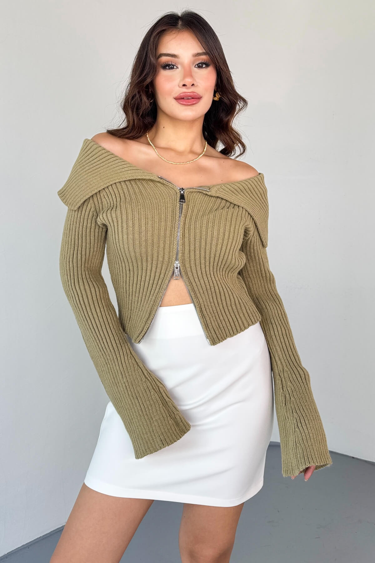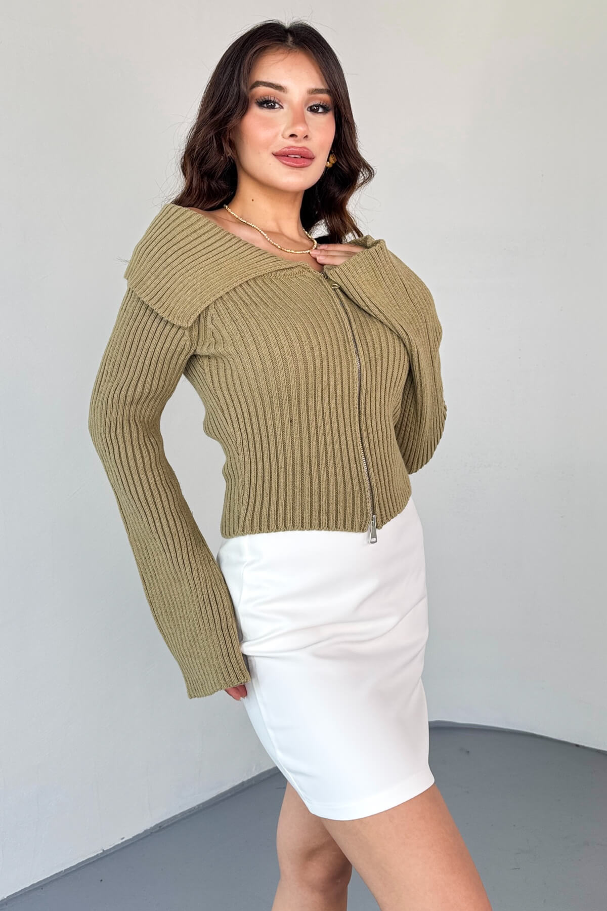 TRK-2131 Haki Geniş Yaka Fermuarlı Ribanalı Triko Hırka