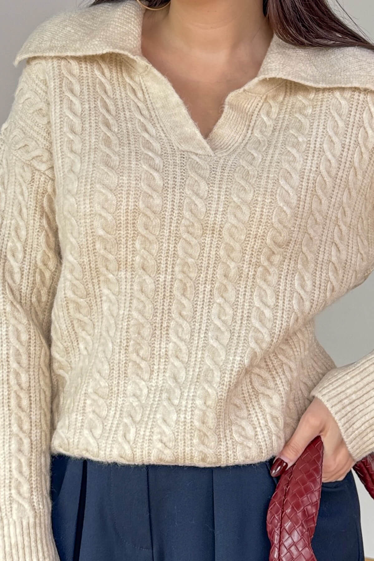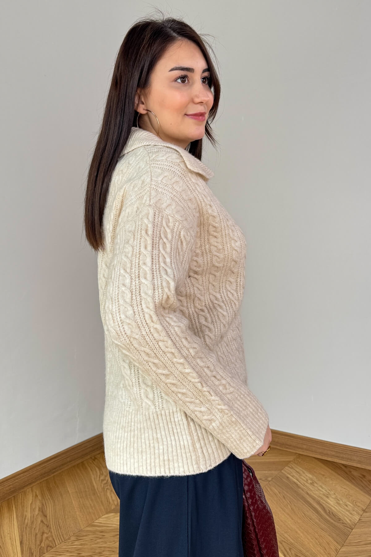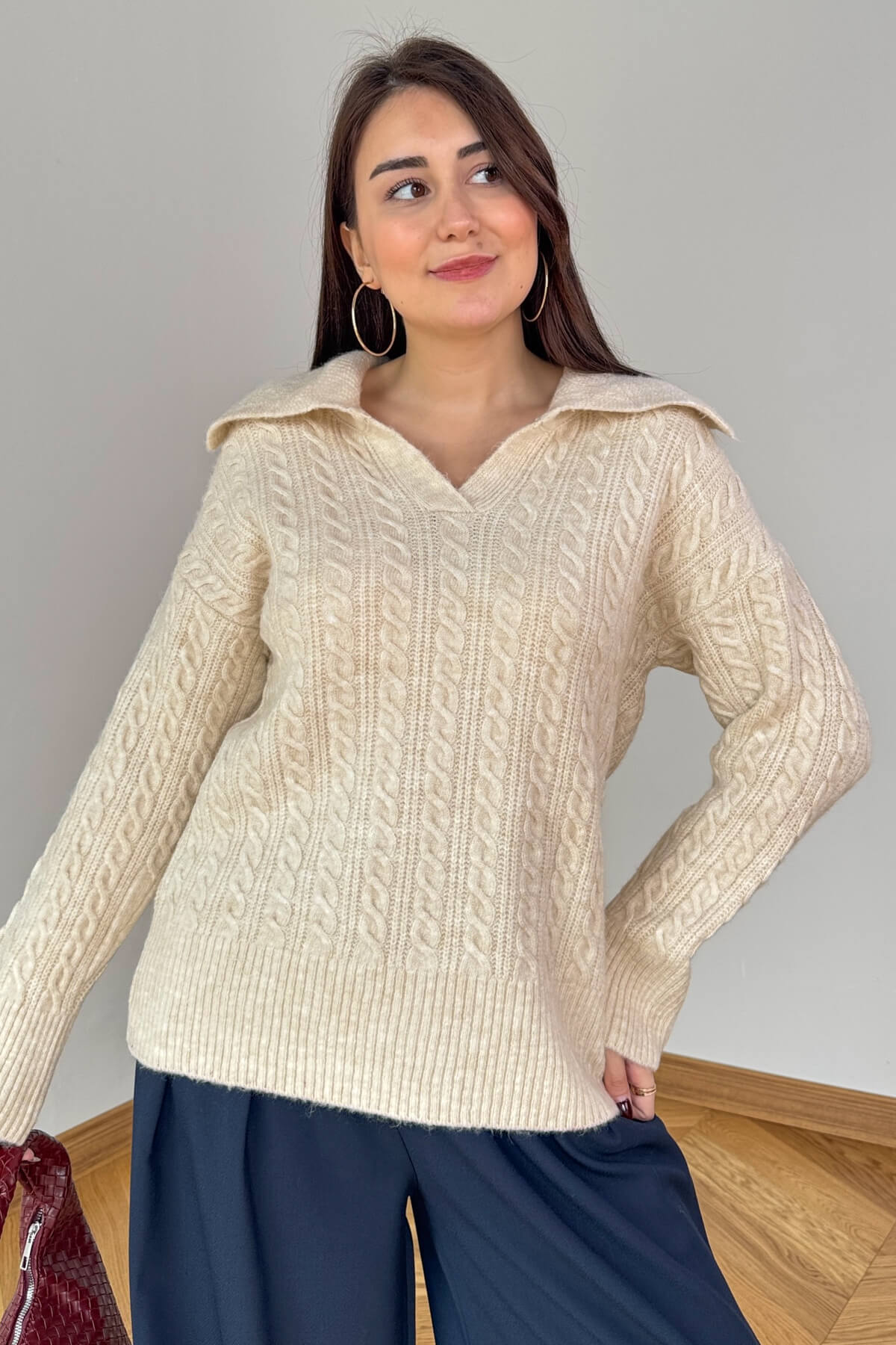 Gelince Haber VerKış sezonunun en şık dokularından saç örgü triko, geniş polo yaka detayla buluştu! Modern ve konforlu bir tarz arayanlar için mükemmel bir seçim.
