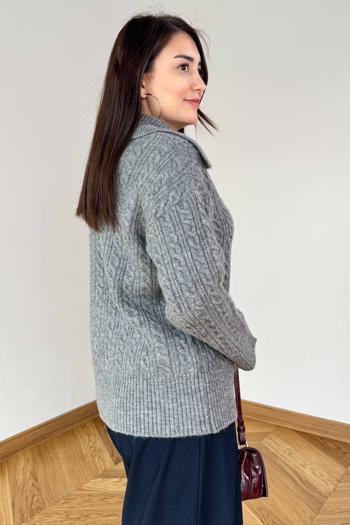 Gelince Haber VerKış sezonunun en şık dokularından saç örgü triko, geniş polo yaka detayla buluştu! Modern ve konforlu bir tarz arayanlar için mükemmel bir seçim.