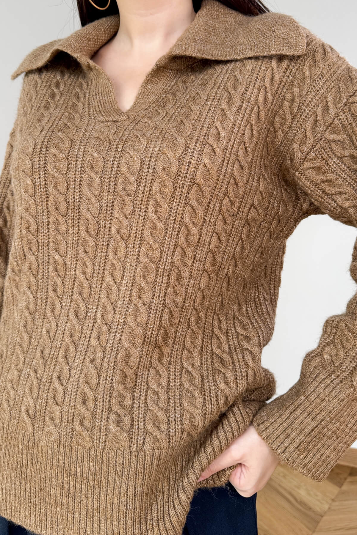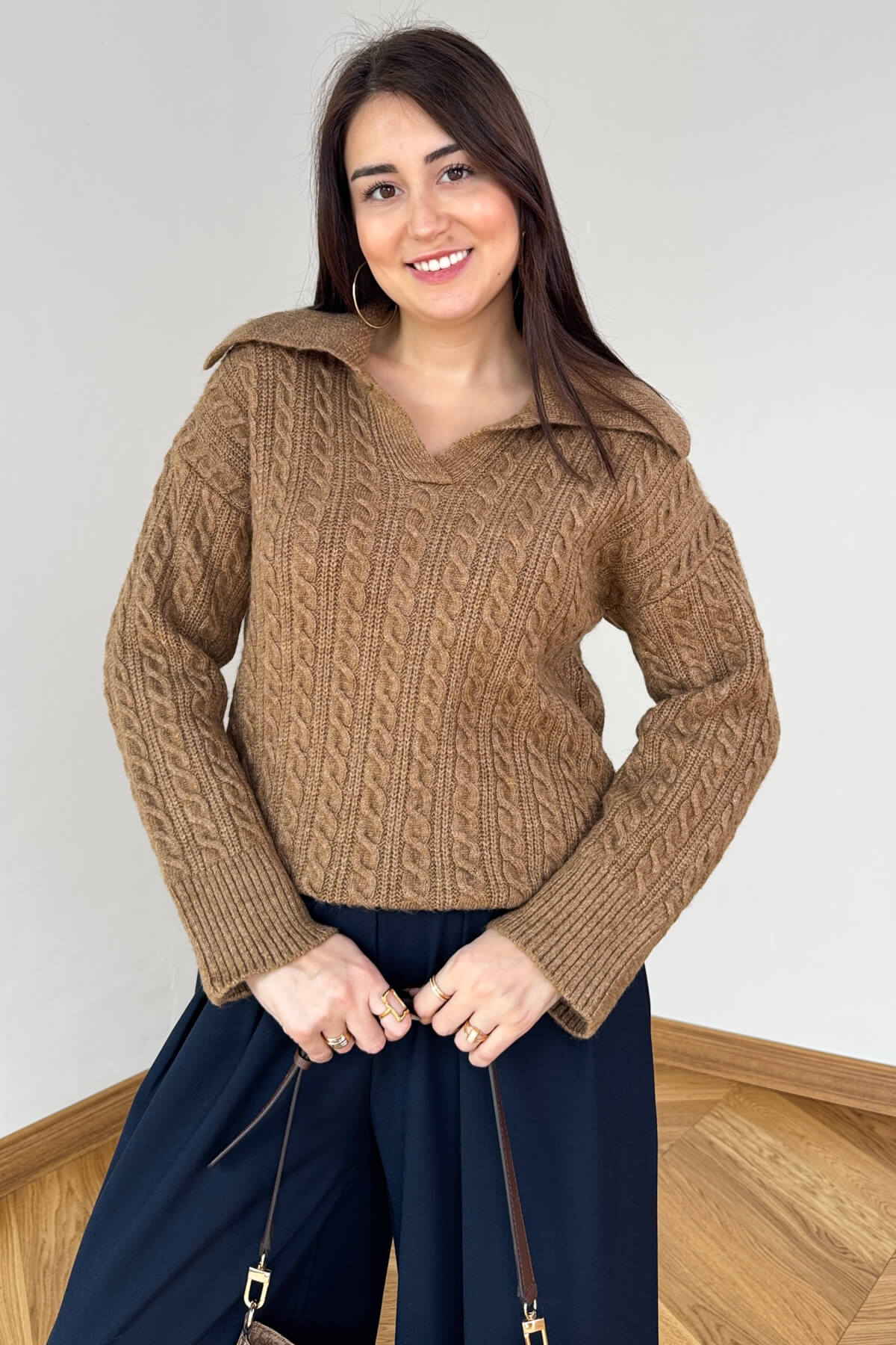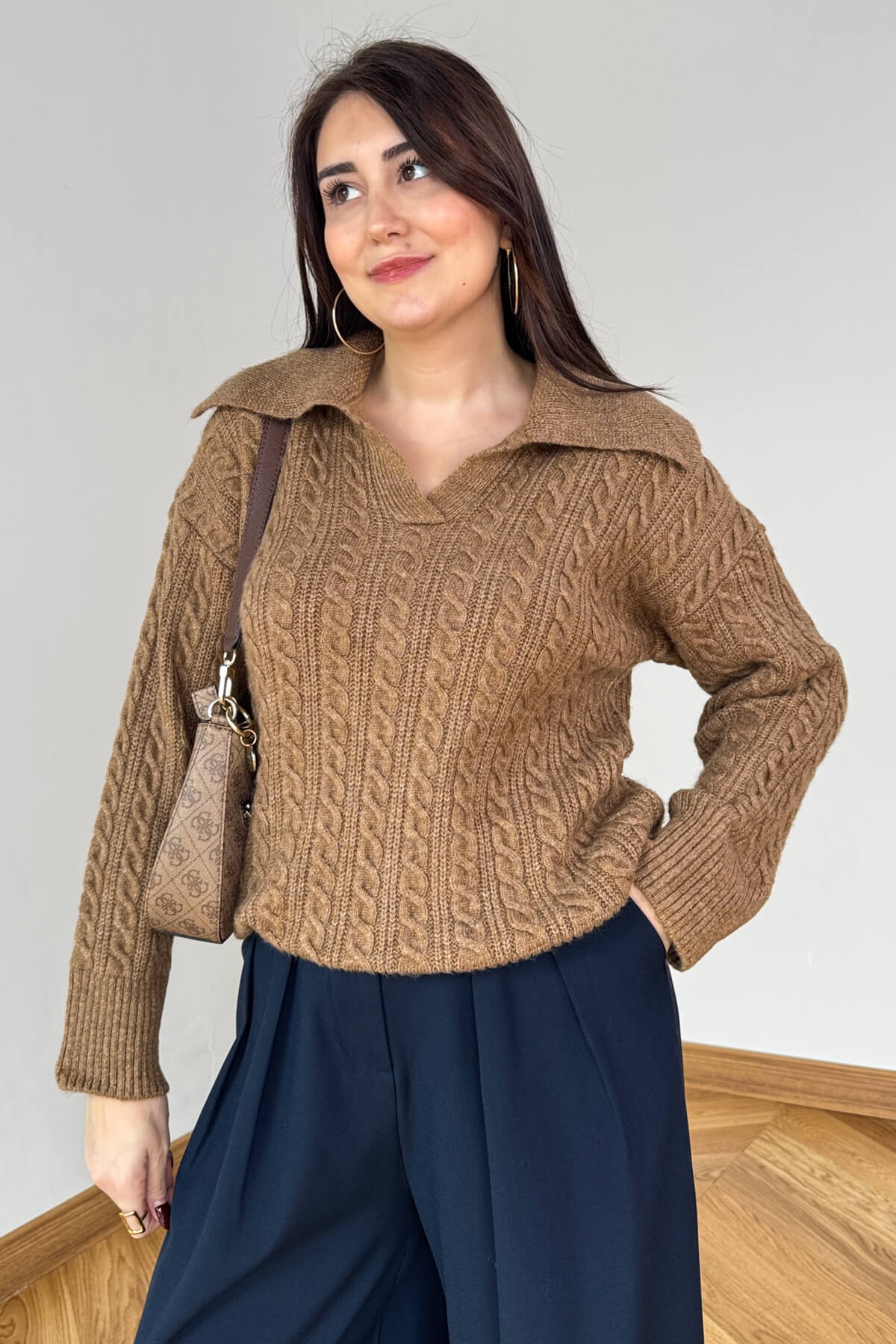 TRK-2510 Vizon Geniş Polo Yaka Saç Örgü Desen Oversize Triko Kazak