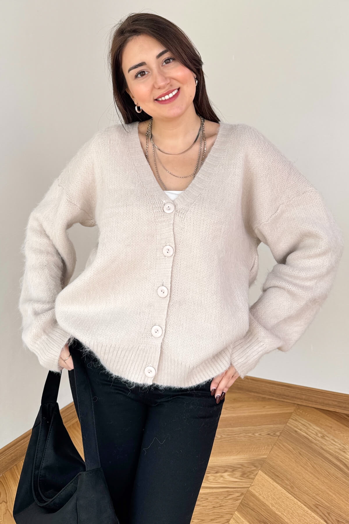 V yaka formu ve ön düğme detayı, klasik tarzı güncel bir görünümle birleştirir.