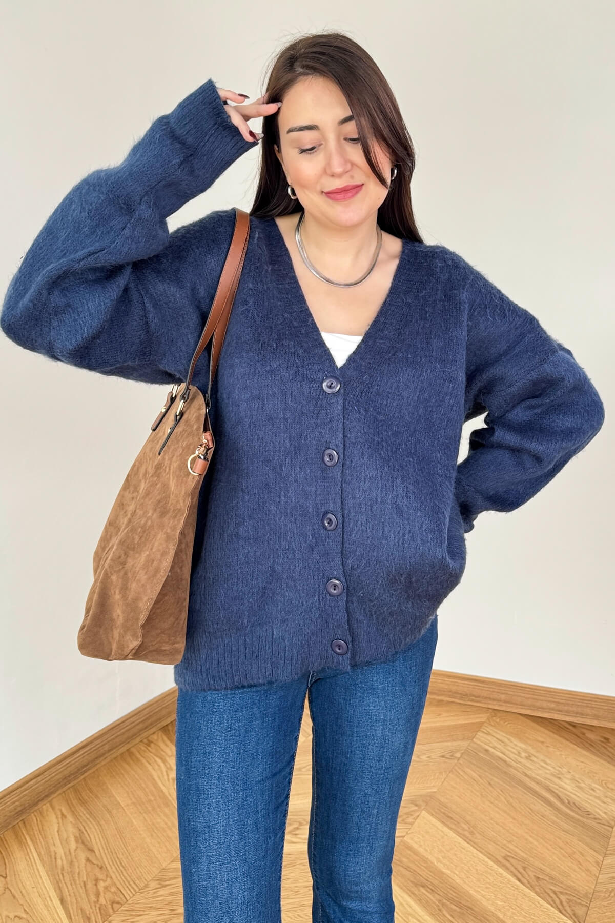 V yaka formu ve ön düğme detayı, klasik tarzı güncel bir görünümle birleştirir.
