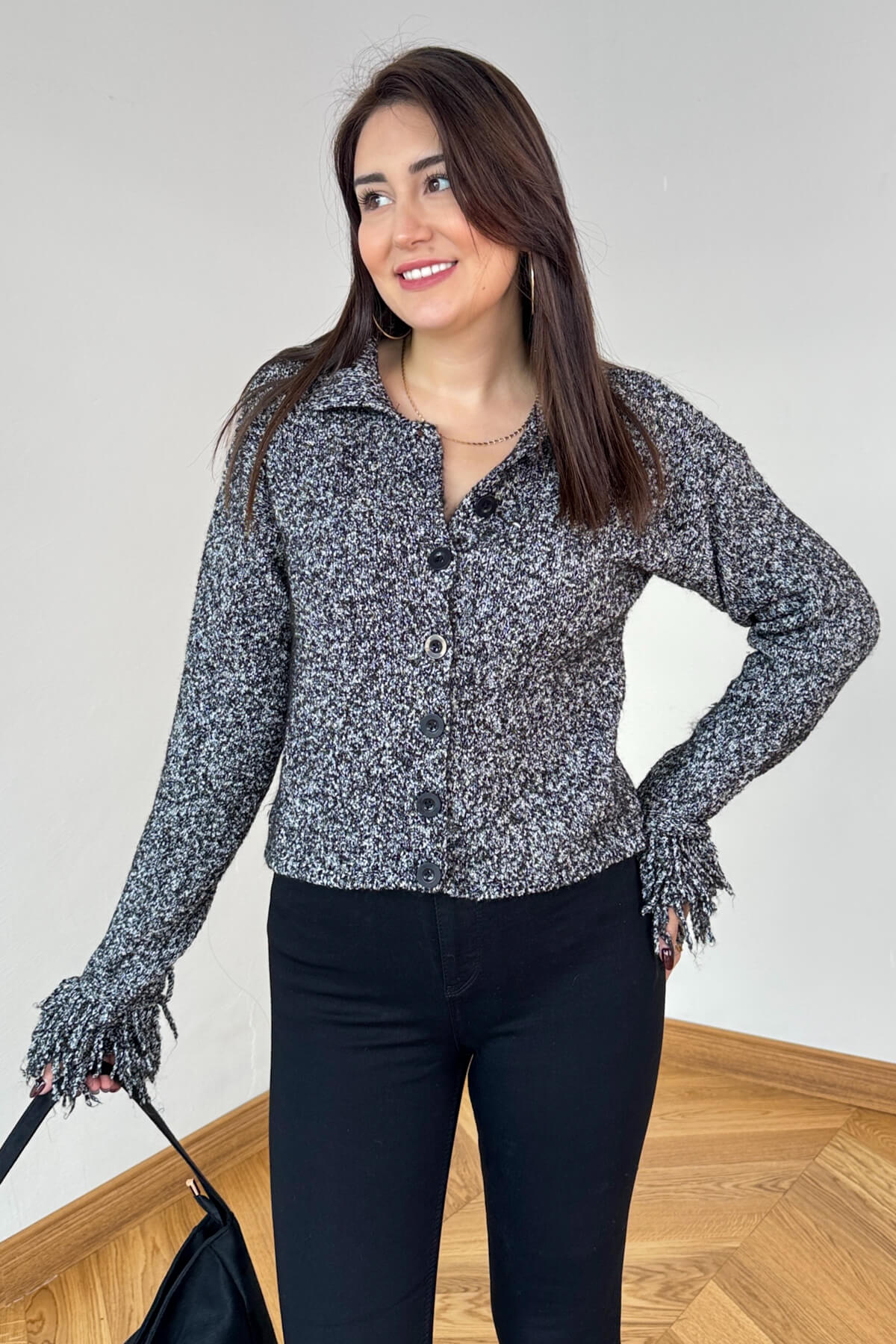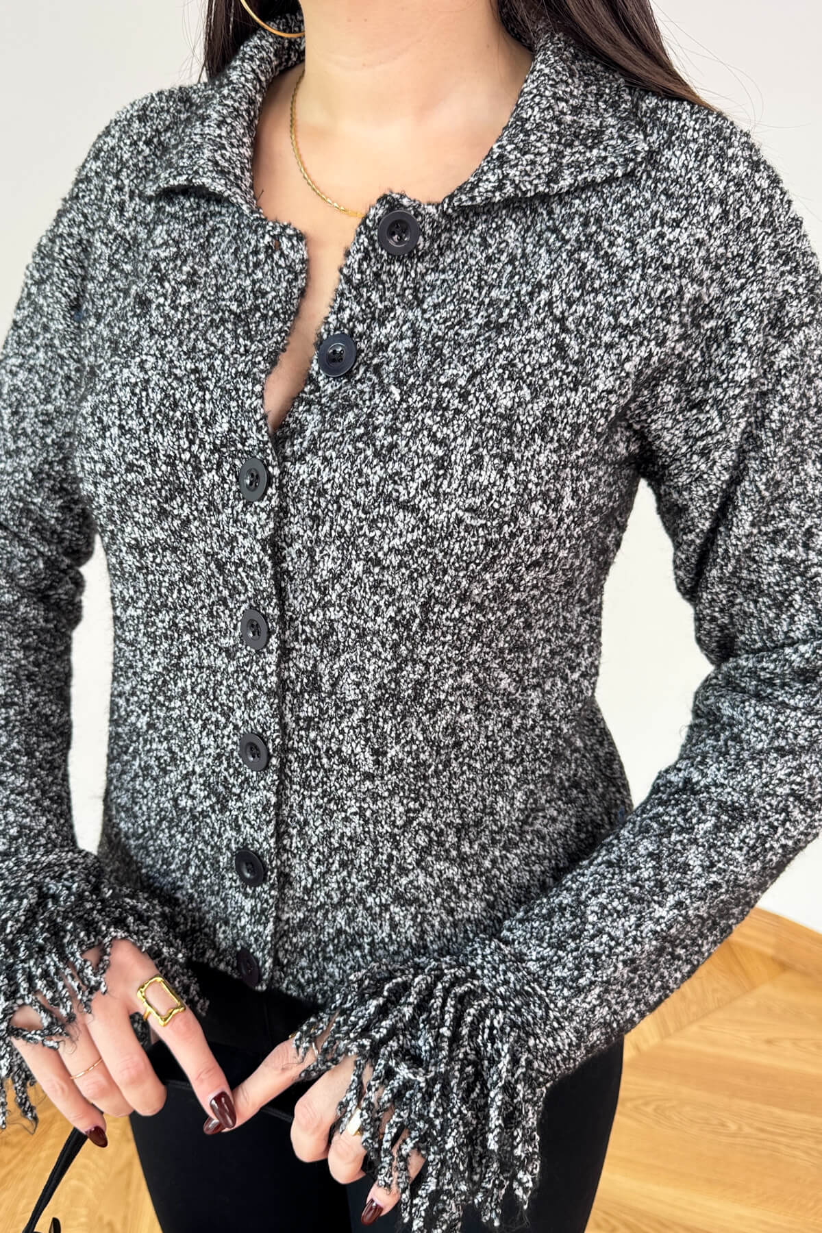 TRK-3838 Siyah Püskül Kol Polo Yaka Düğmeli Yumuşak Dokulu Hırka
