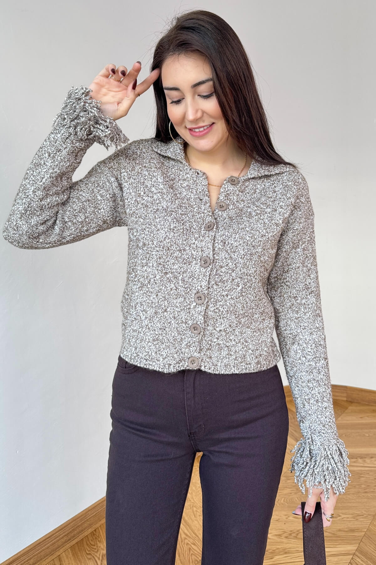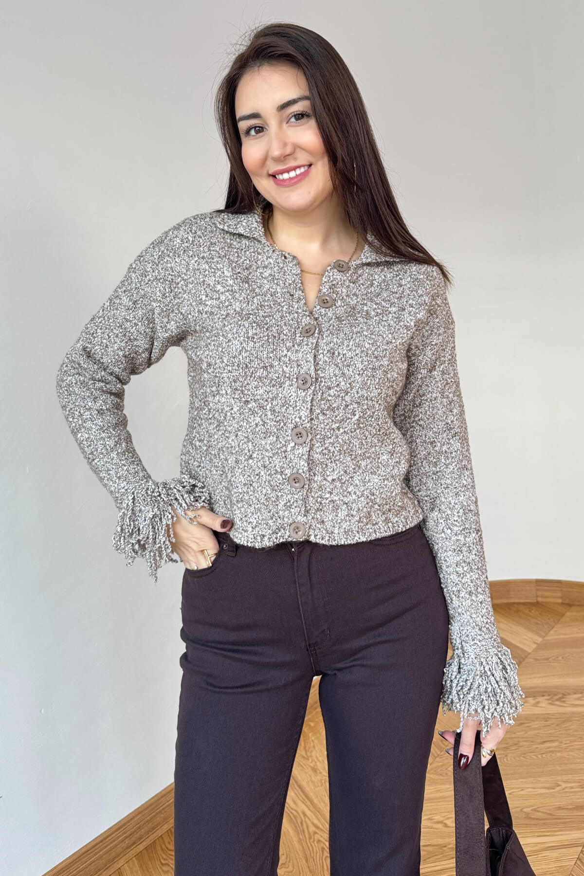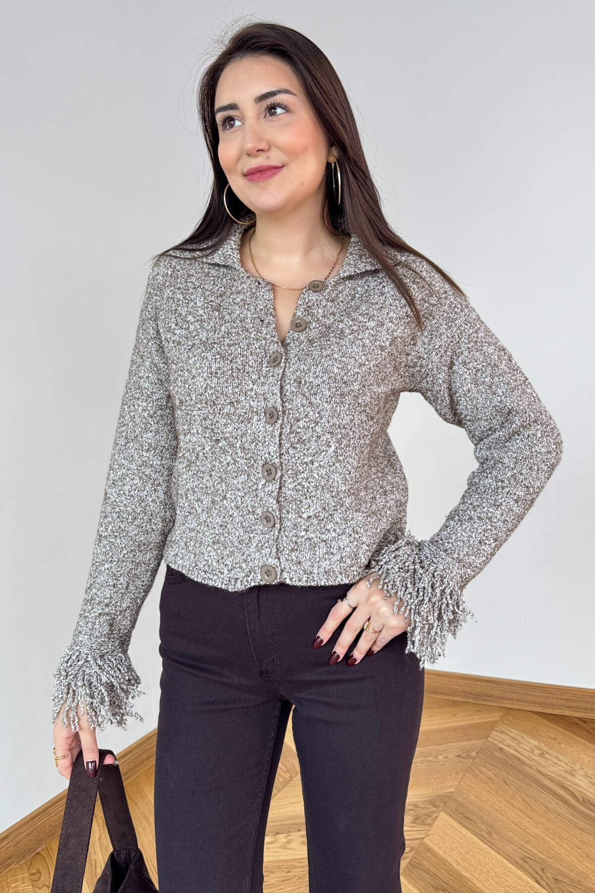 TRK-3838 Vizon Püskül Kol Polo Yaka Düğmeli Yumuşak Dokulu Hırka