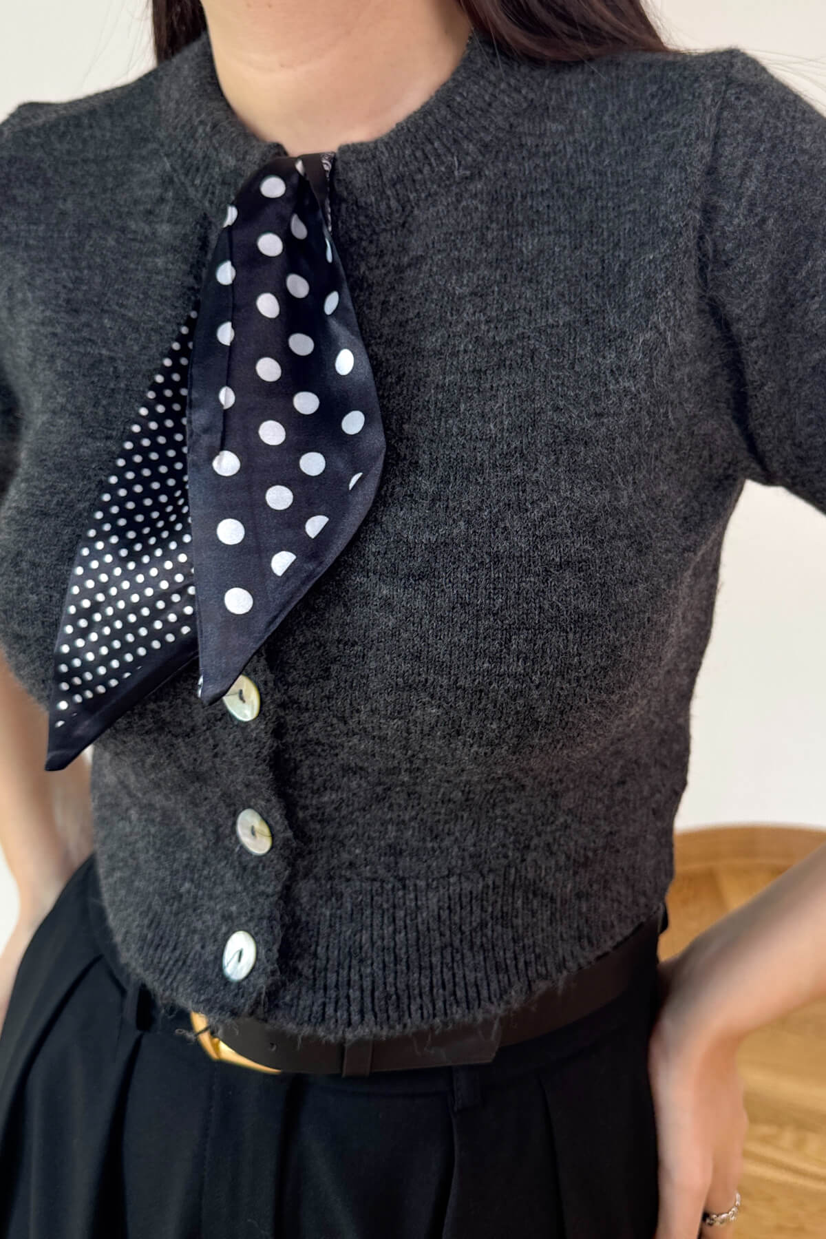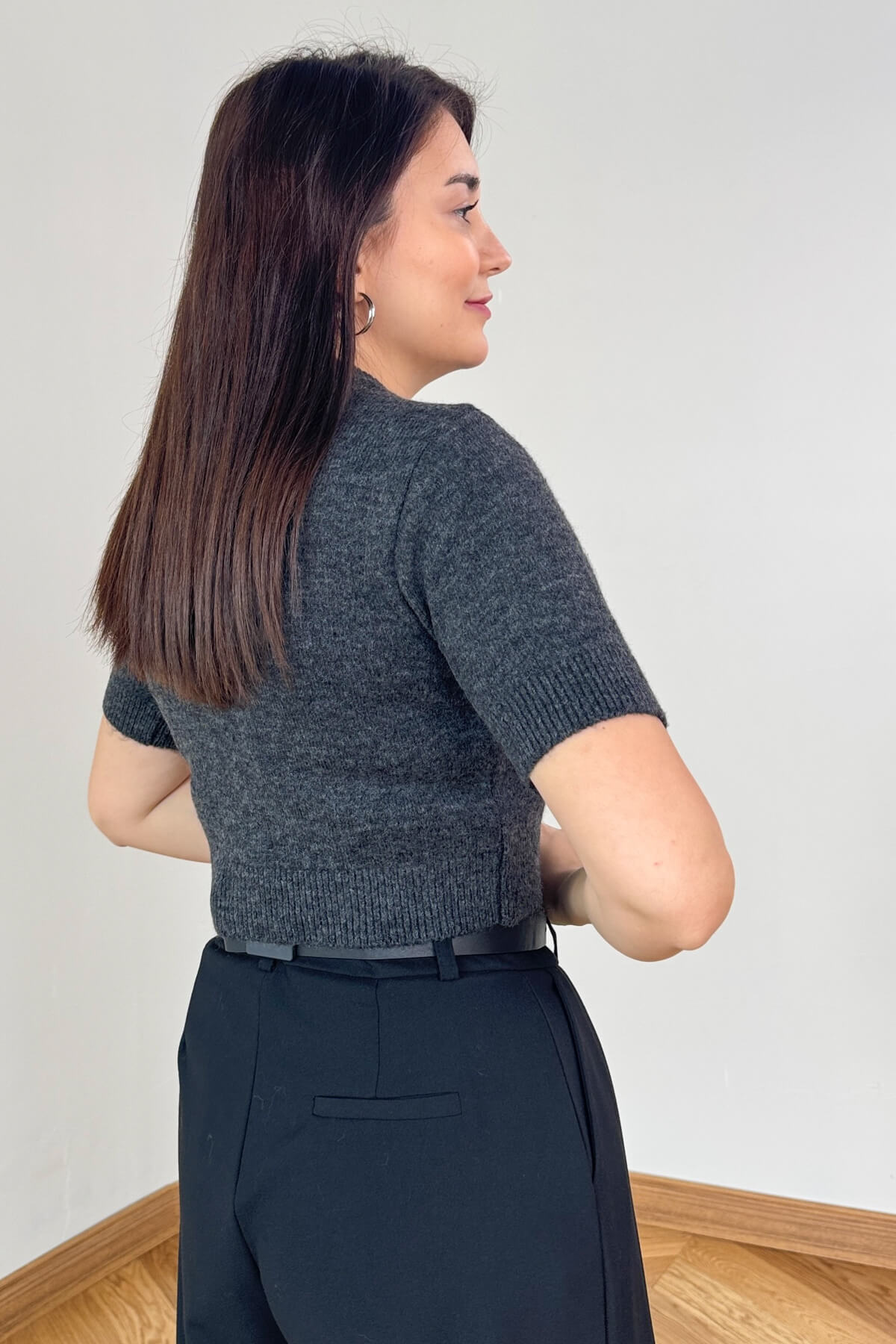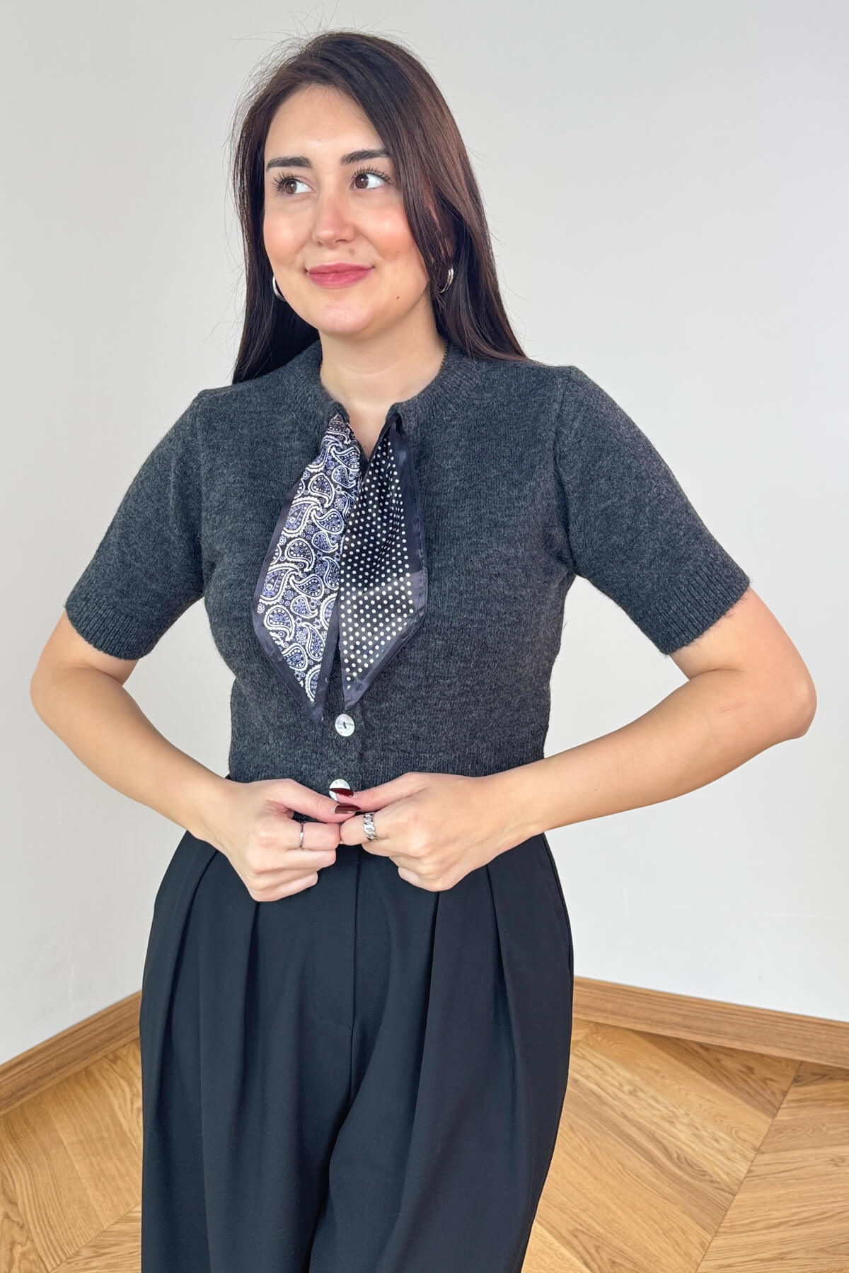 TRK-4540 Füme Fular Detaylı Sedef Düğmeli Kısa Kollu Hırka