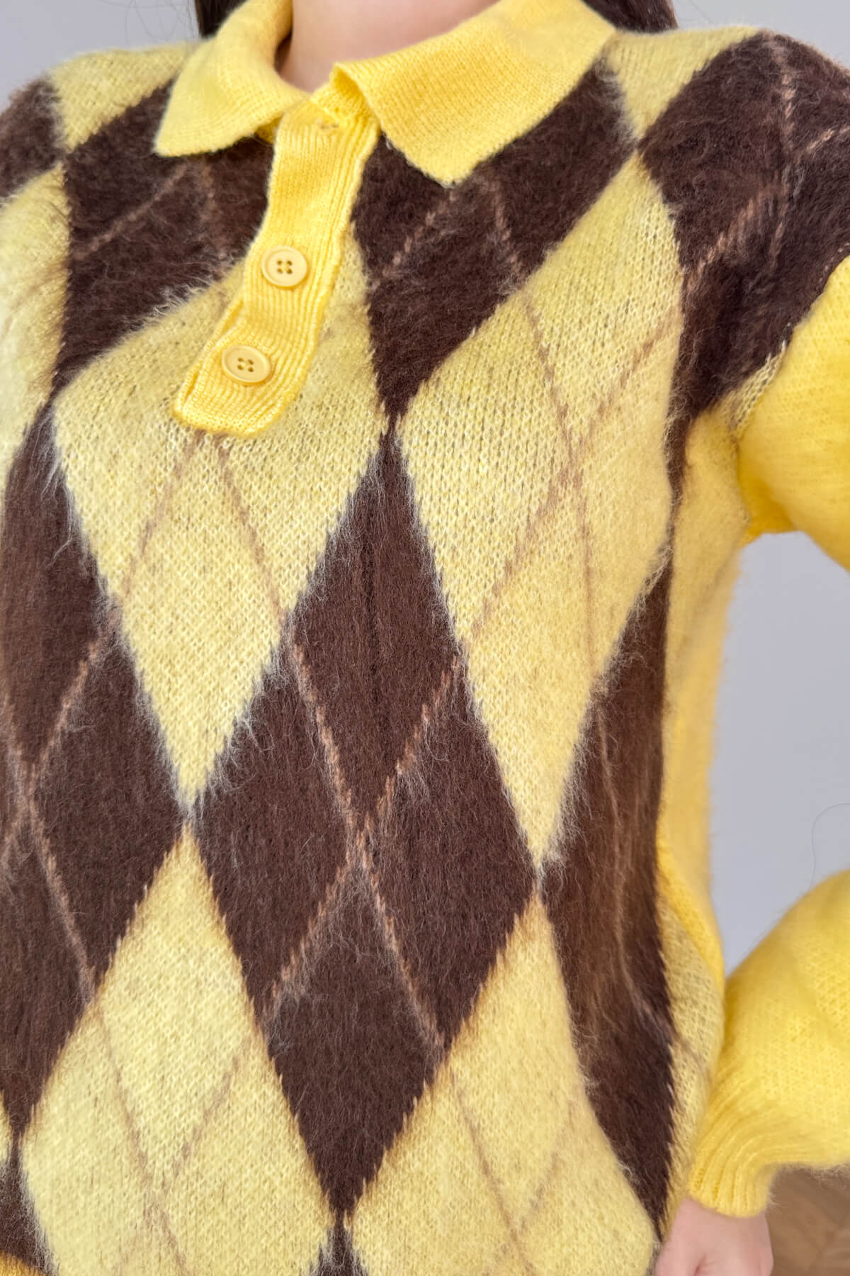 TRK-5320 Sarı Tiftikli Polo Yaka Baklava Desen Triko Kazak