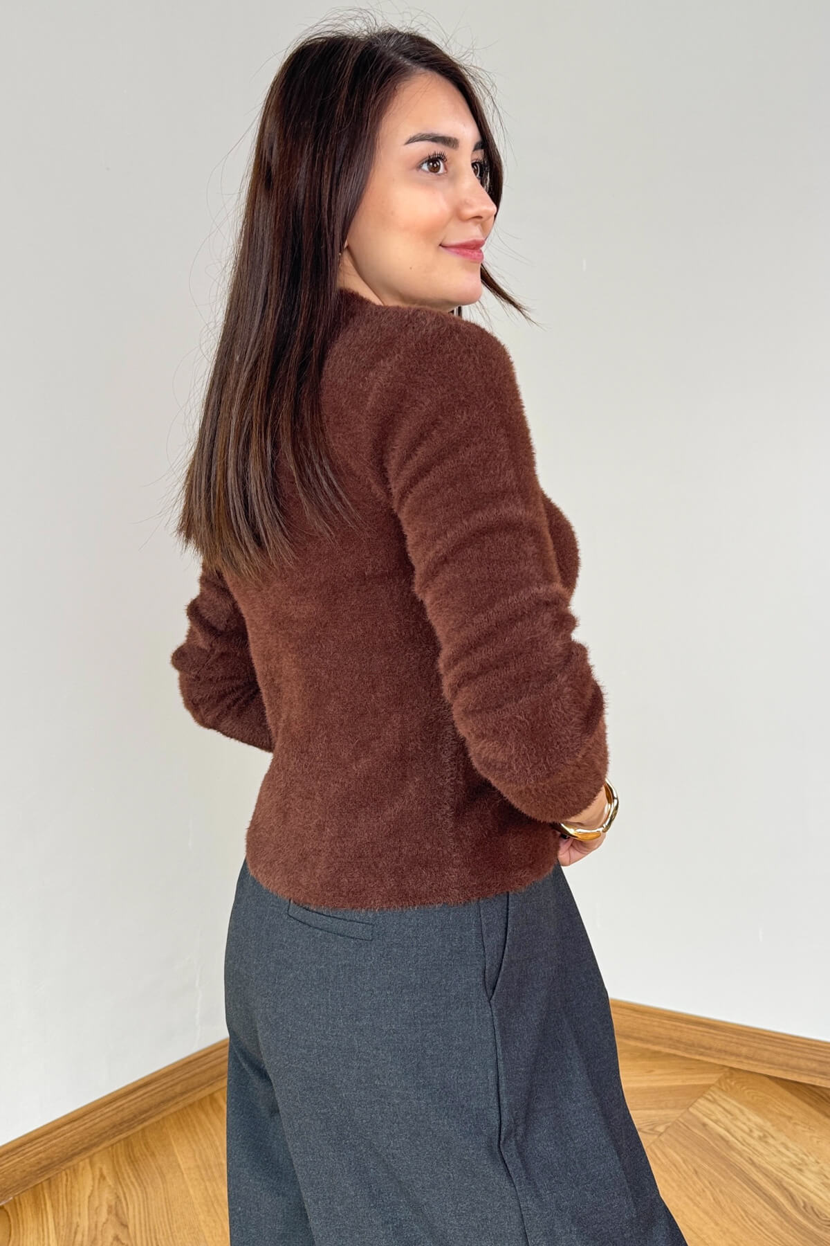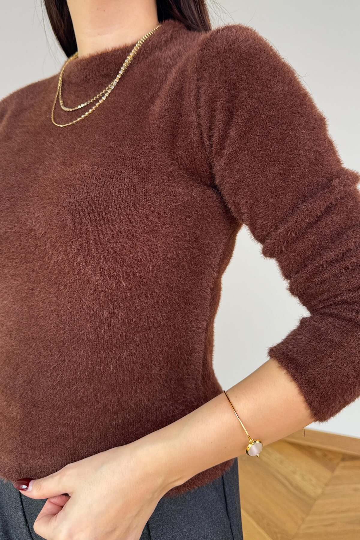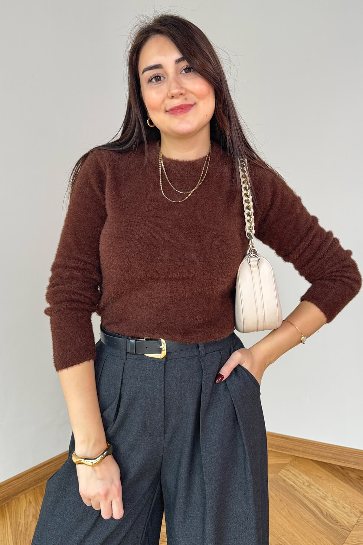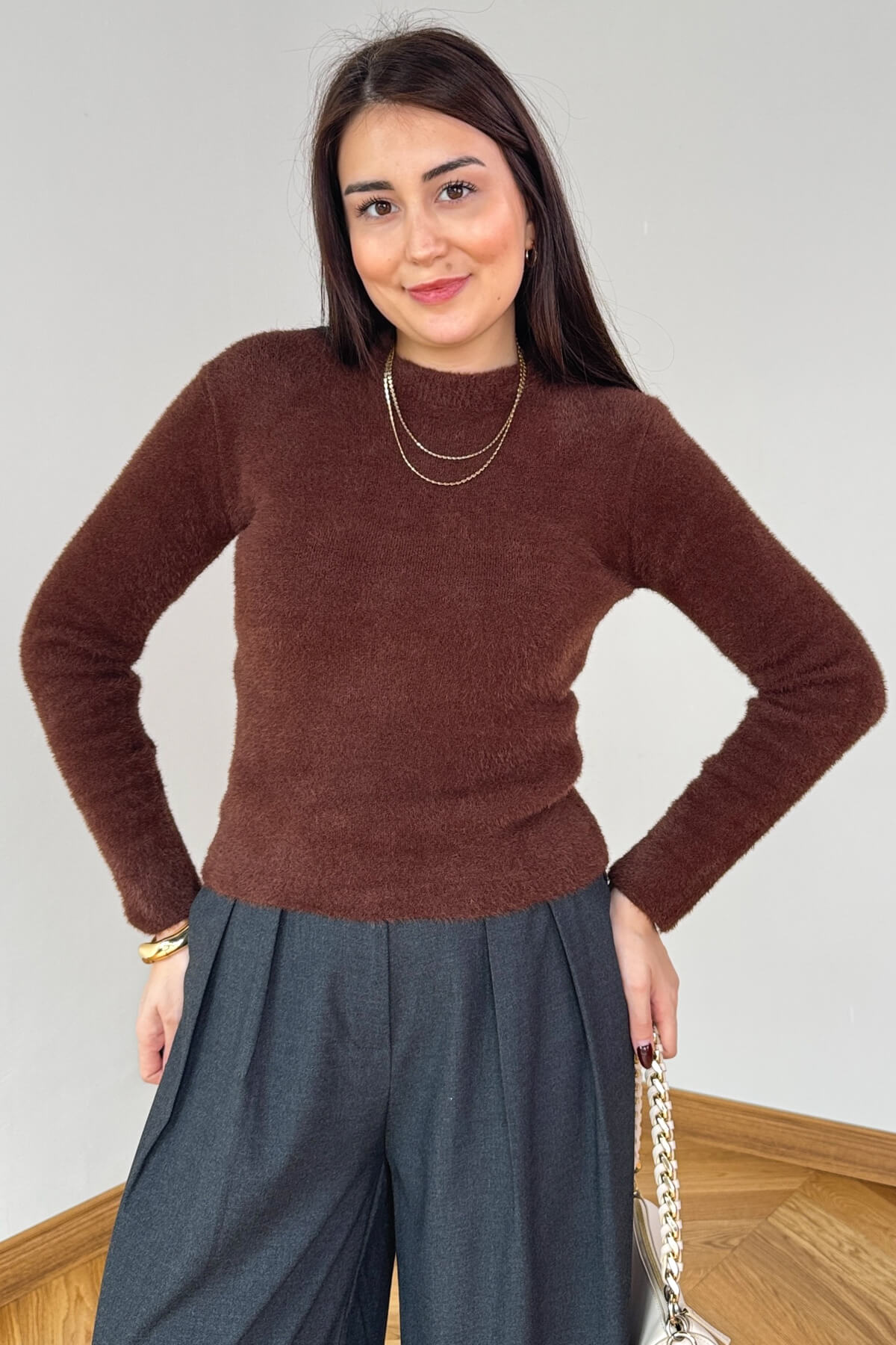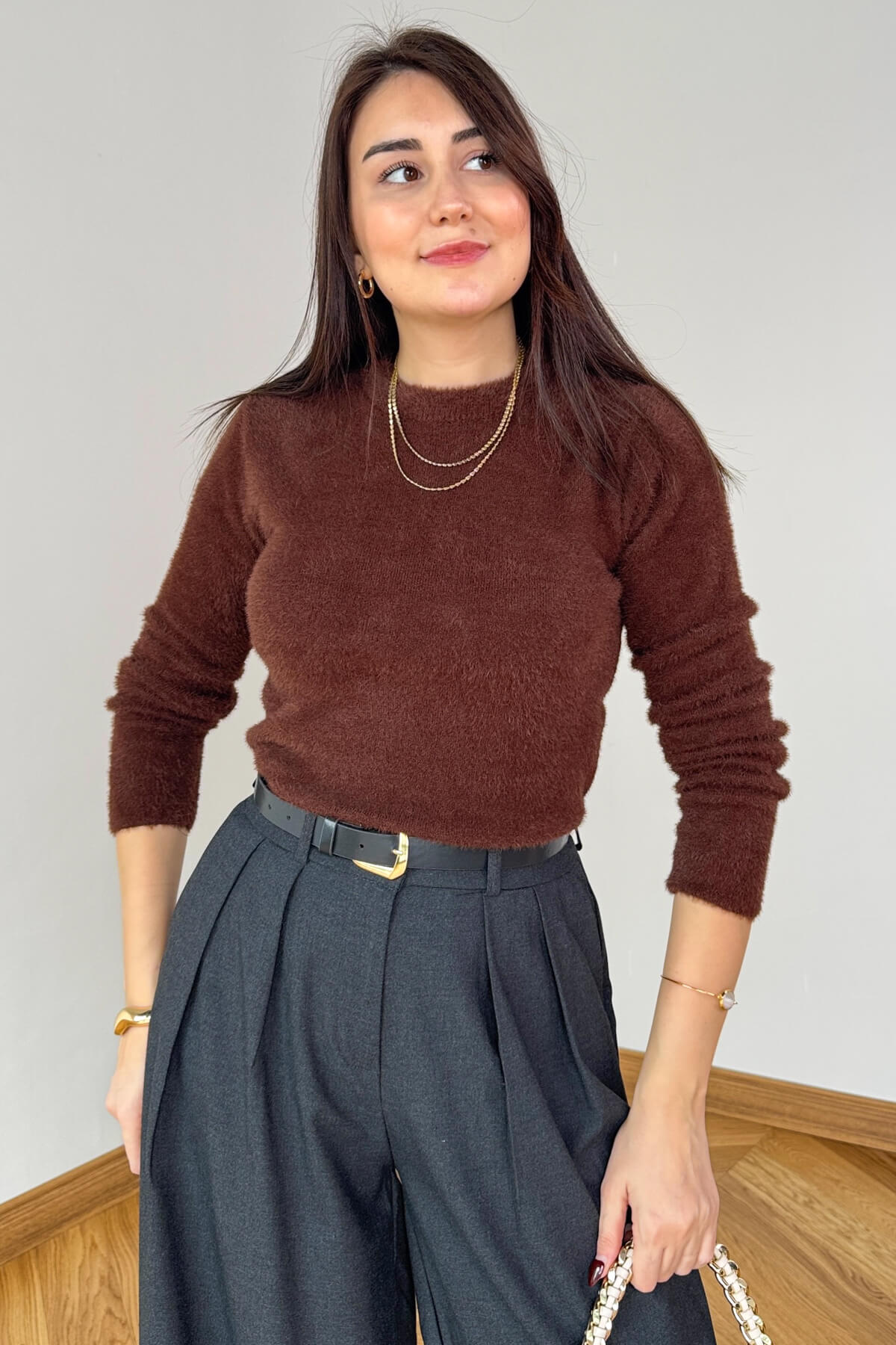 TRK-5321 Kahverengi Yumoş Sakallı Yuvarlak Yaka Triko Kazak