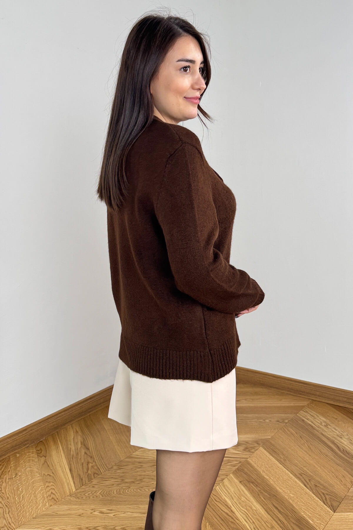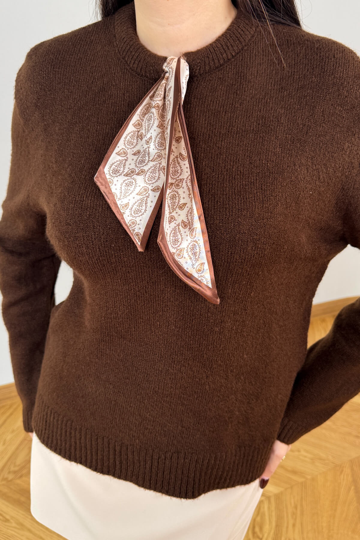 TRK-5323 Acı Kahve Fular Detaylı Oversize Salaş Triko Kazak
