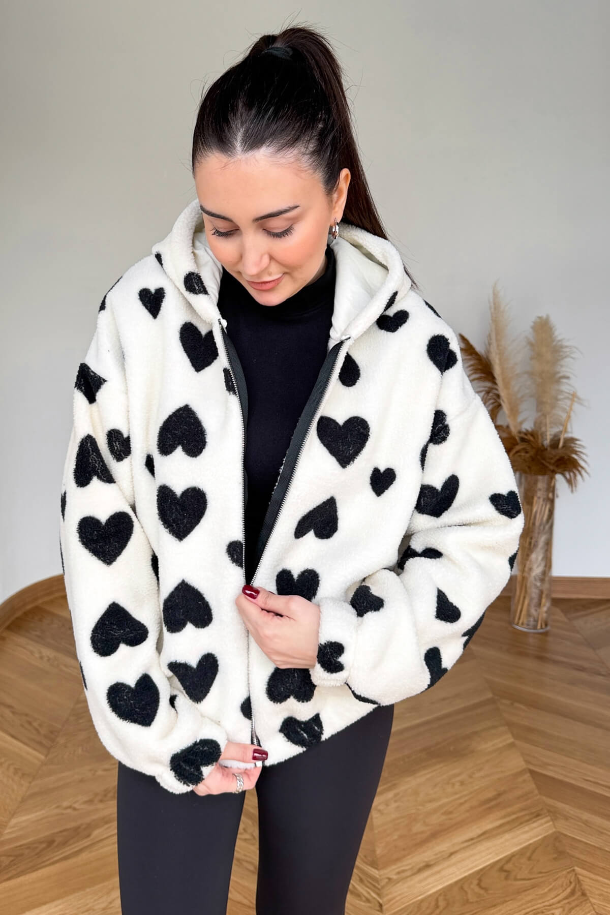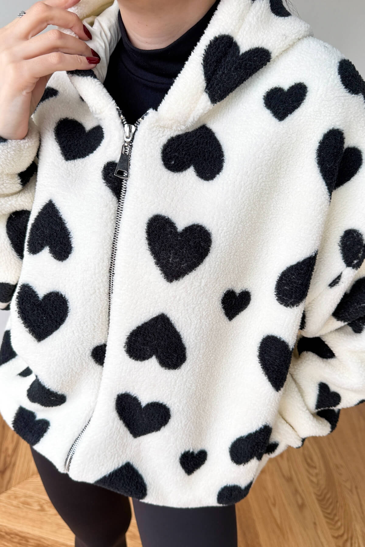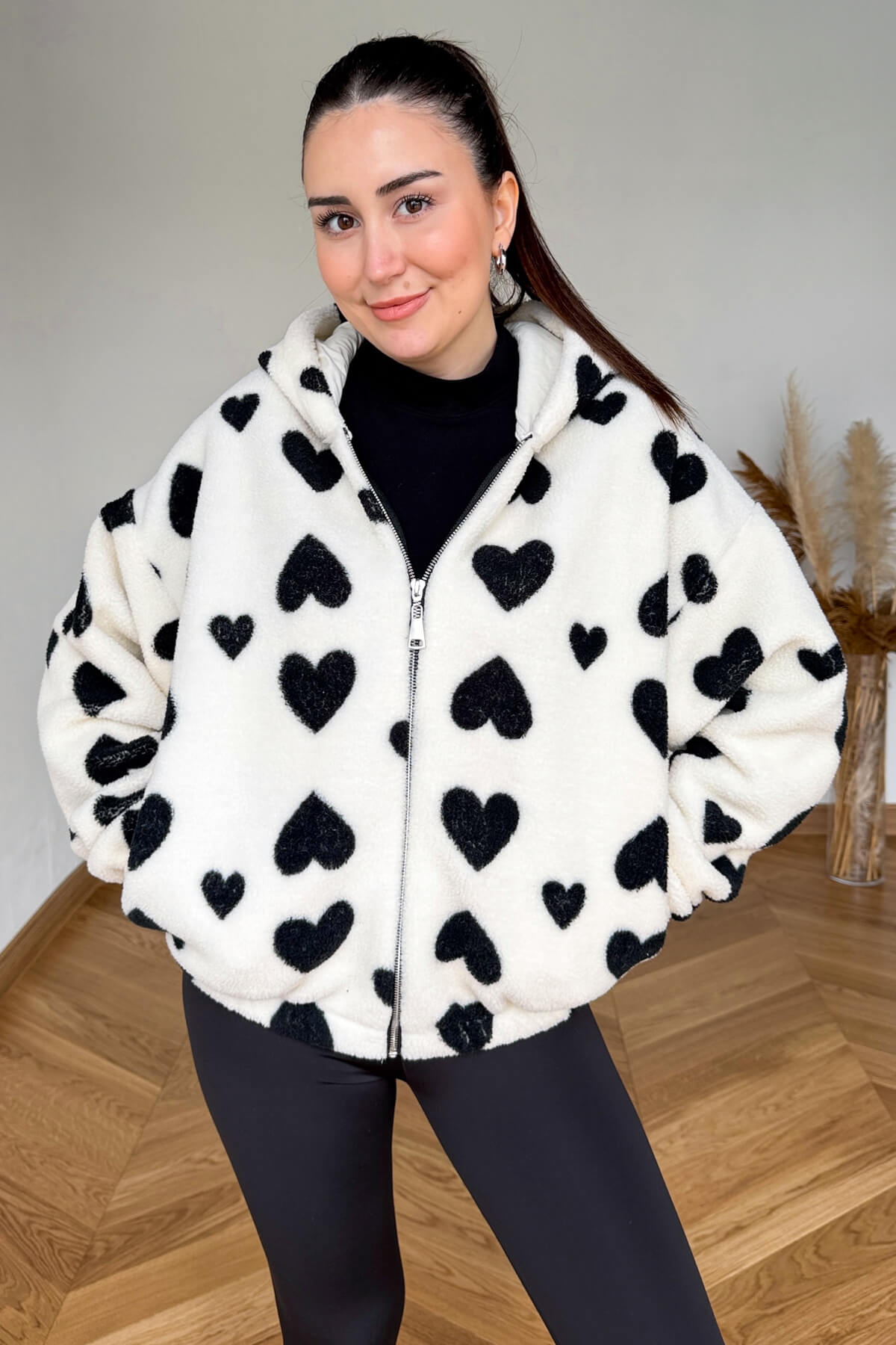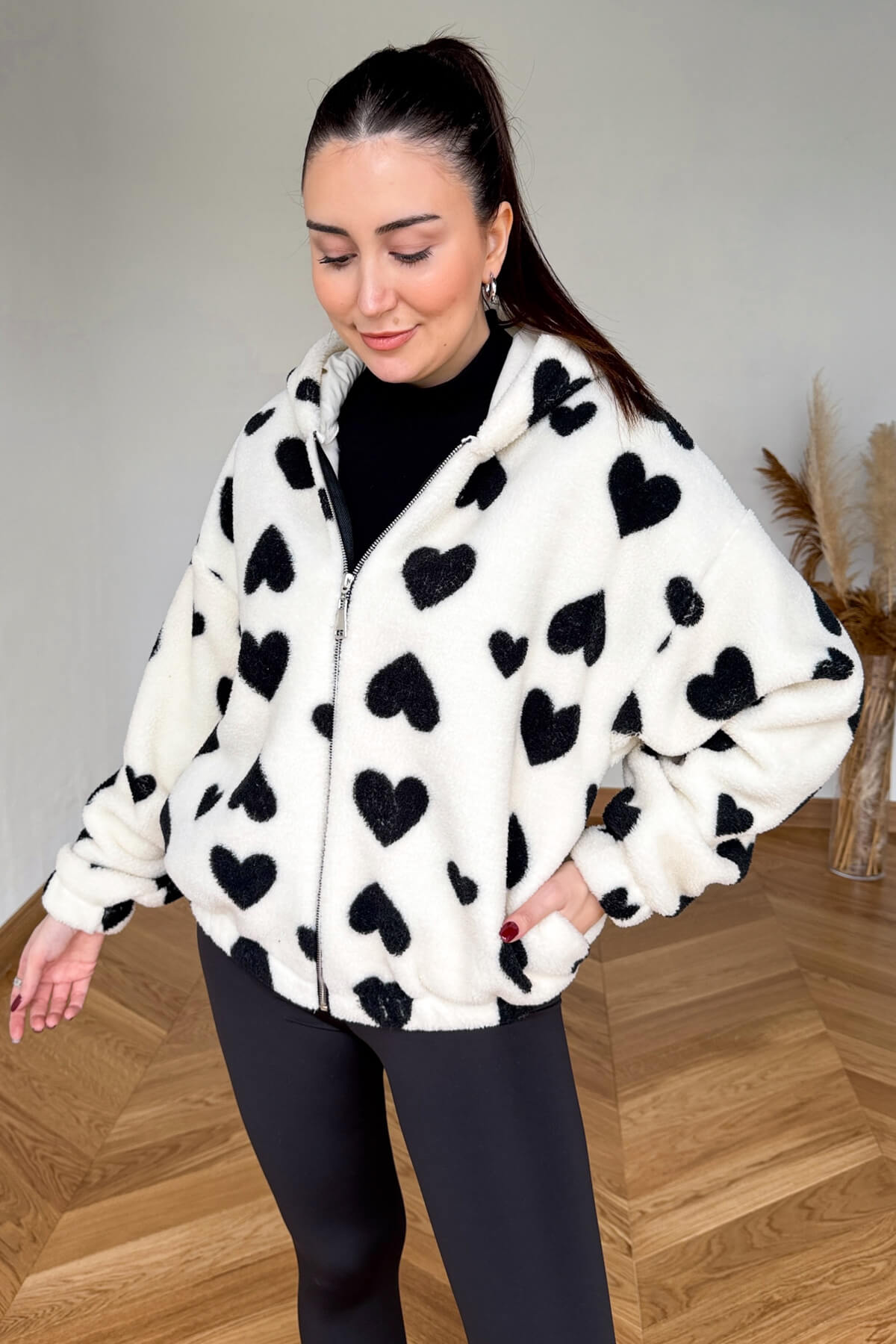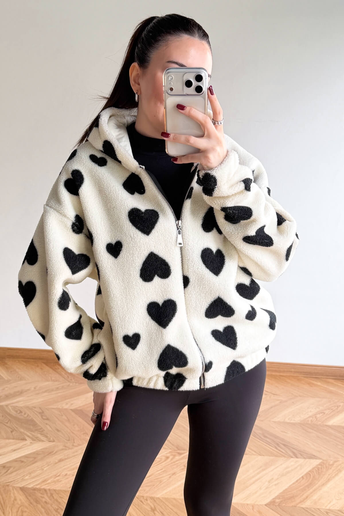 Soğuk havaların en sempatik eşlikçisi olan bu tasarım hırka, yumuşacık polar dokusuyla sizi sıcacık sarmaya hazır. Ekru zemin üzerine işlenmiş kontrast siyah kalp desenleri, kış kombinlerinize enerjik ve eğlenceli bir hava katıyor. 65 cm uzunluğundaki ideal boyu ve modern oversize kalıbı, gün boyu hareket özgürlüğü sunarken, lastikli etek ucu ve manşet detayları sportif şıklığınızı tamamlıyor. Kapüşonlu tasarımıyla hem korunaklı hem de stil sahibi bir görünüm vadediyor.