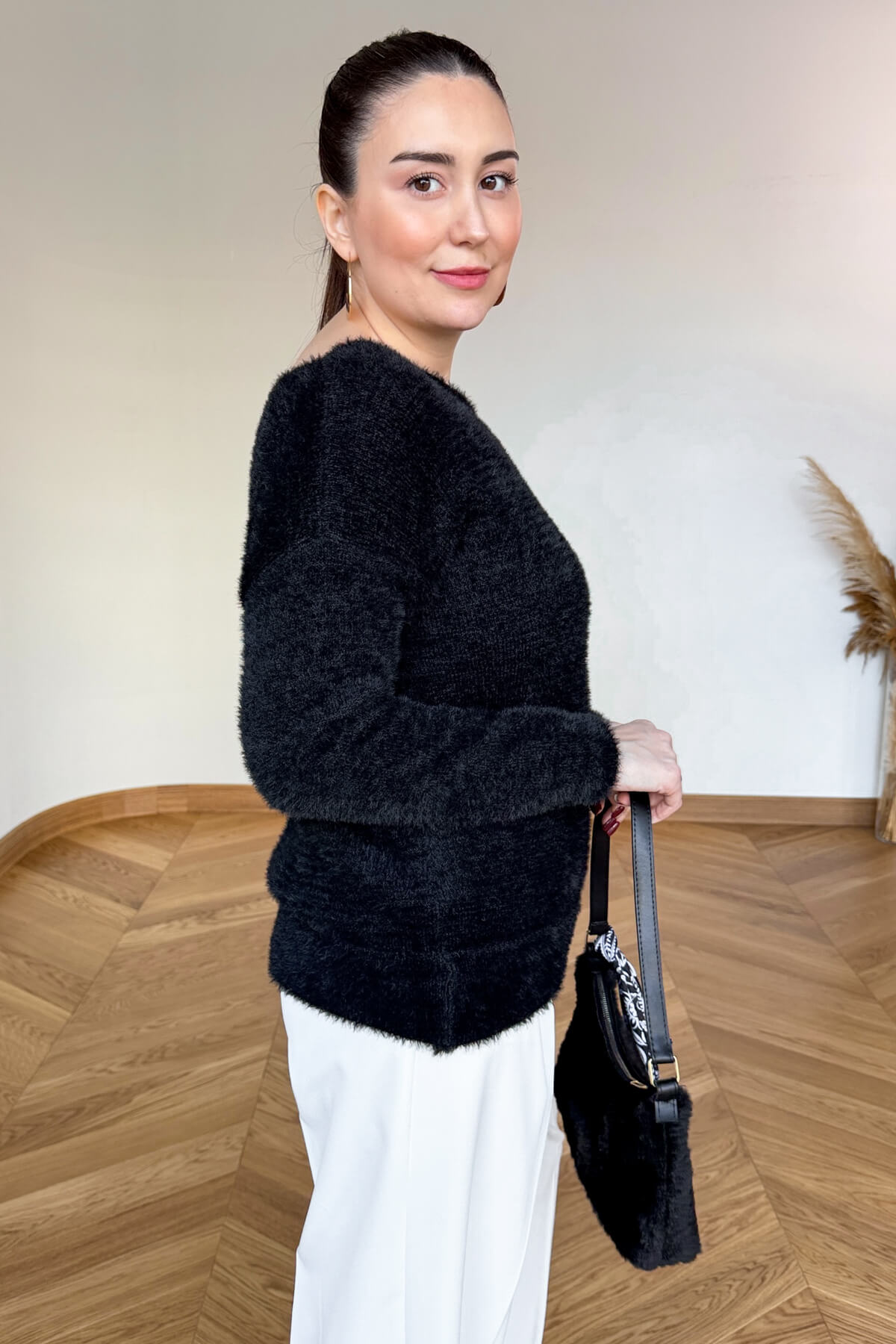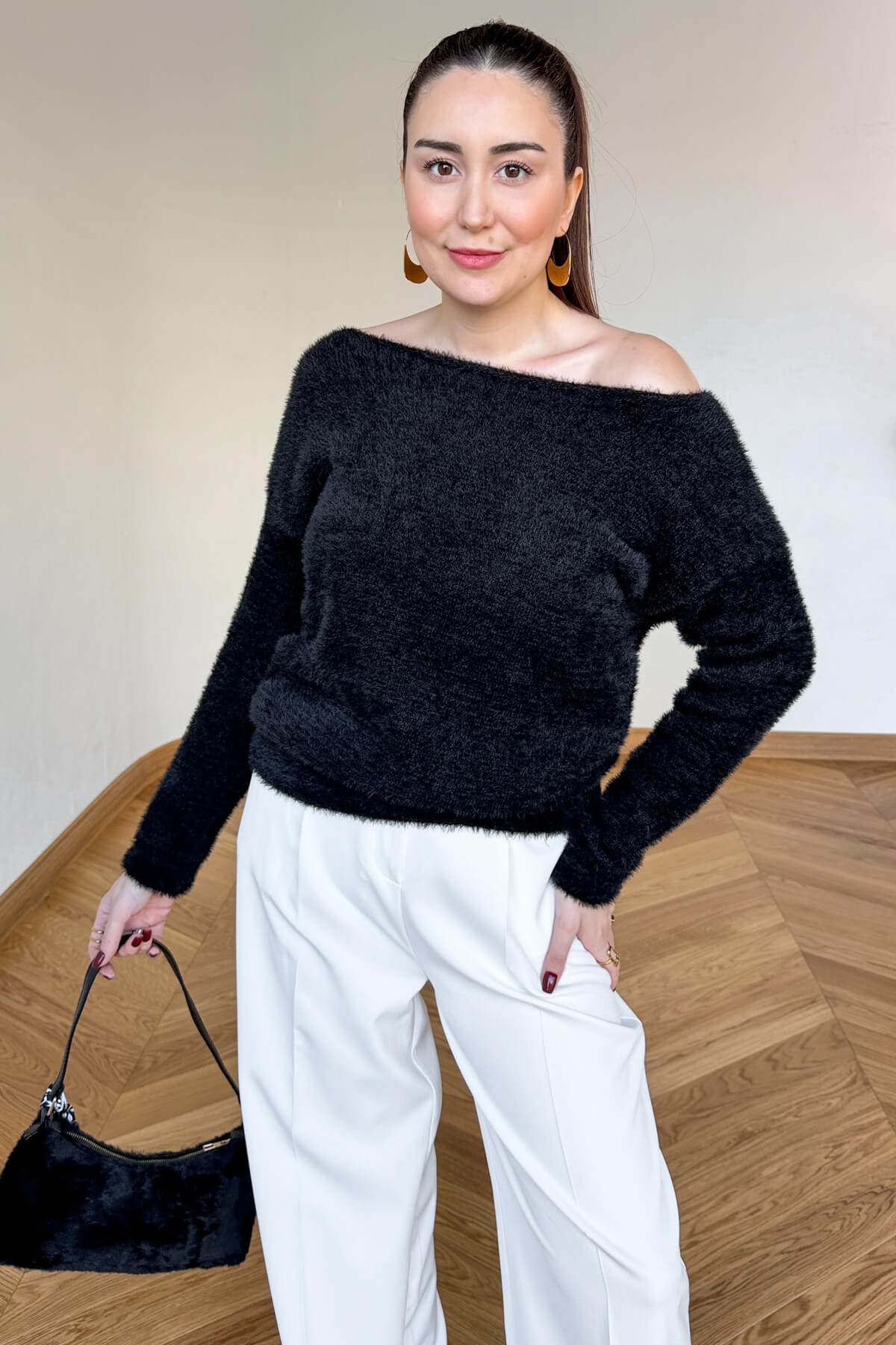 Tasarım Detayı: Zarif kayık yaka ve kendinden tüylü modern doku