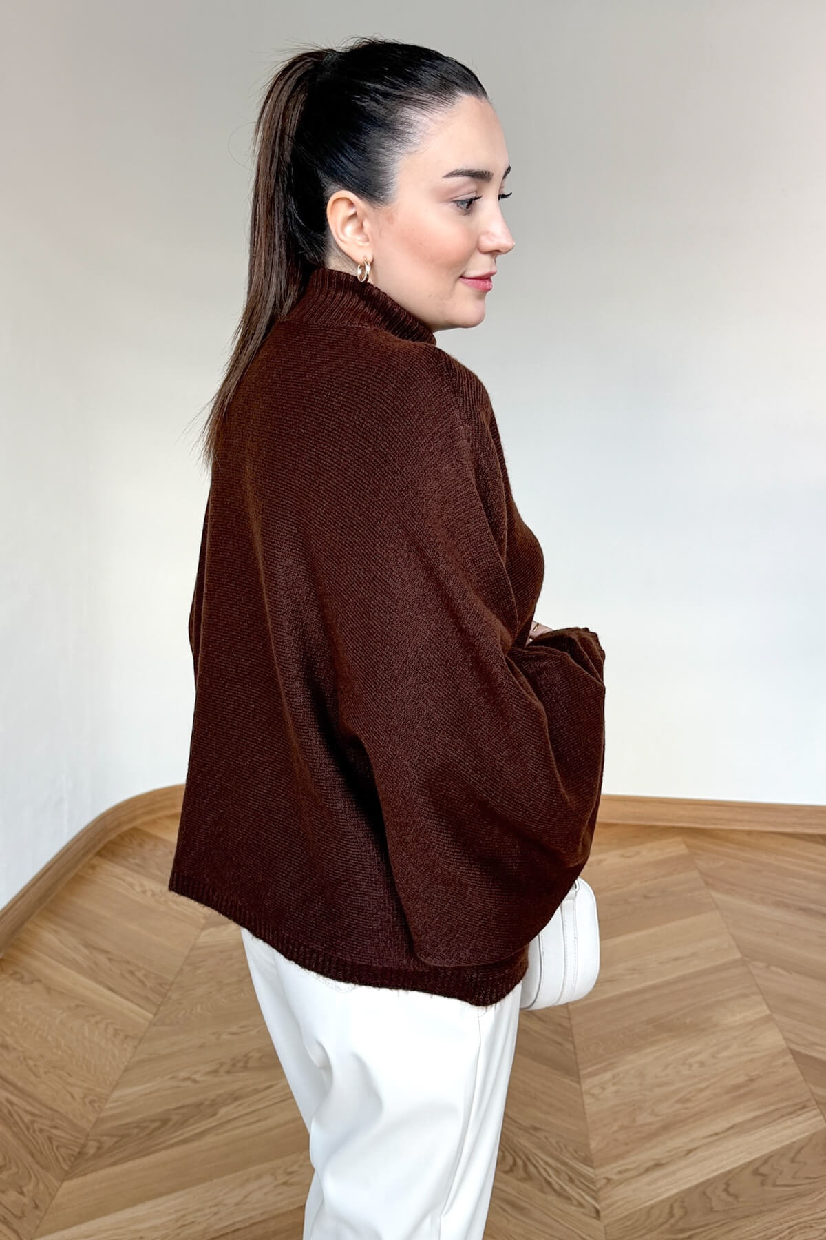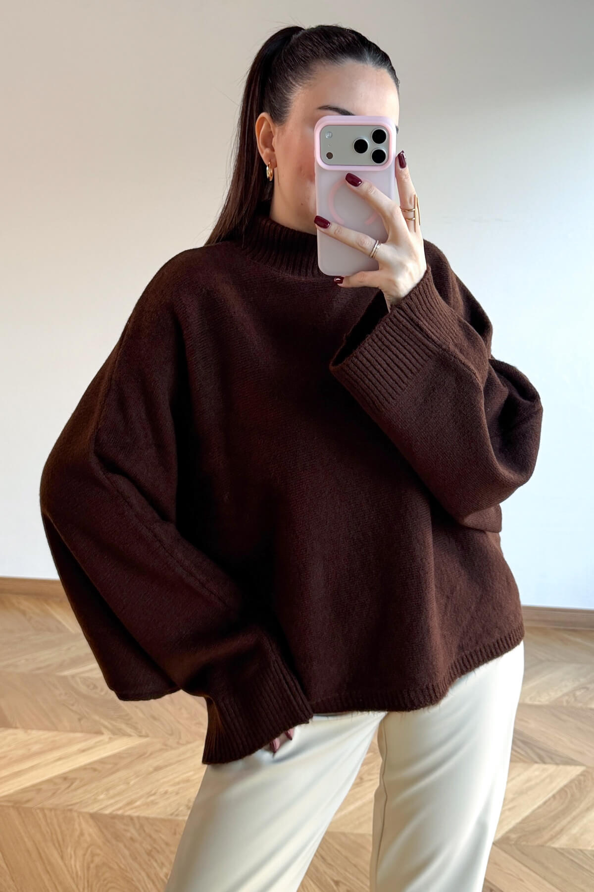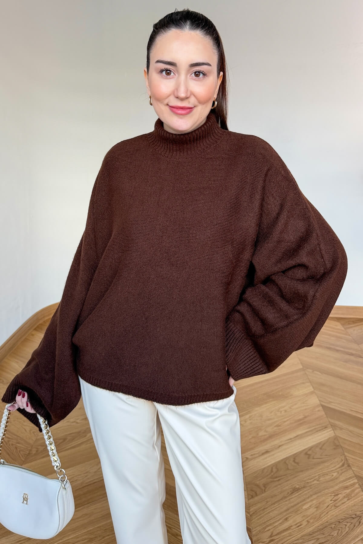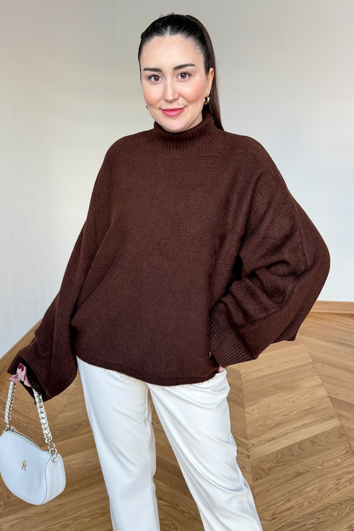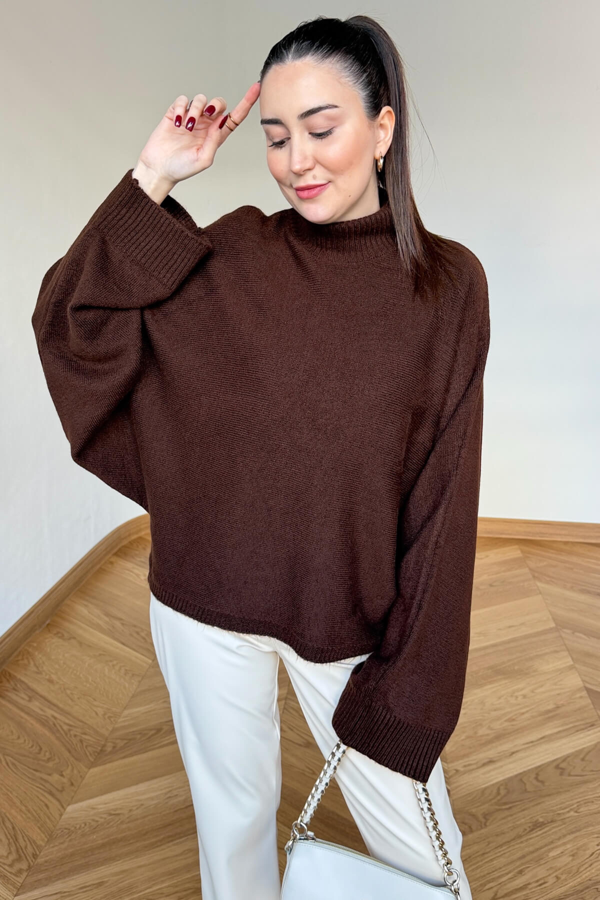 Modern şehir stilini yansıtan bu kazak, yarım balıkçı yaka detayıyla soğuk günlerde sıcak ve zarif bir koruma sağlıyor. Yarasa kol tasarımının sunduğu akışkan silüet, 60 cm en genişliğiyle birleşerek konforlu, modern ve salaş bir duruş sergiliyor. 60 cm ideal boyu sayesinde bel hizasında kusursuz bir bitiş sunan bu tasarım, günlük şıklığınızda hem rahatlığı hem de sofistike görünümü bir arada vadediyor.